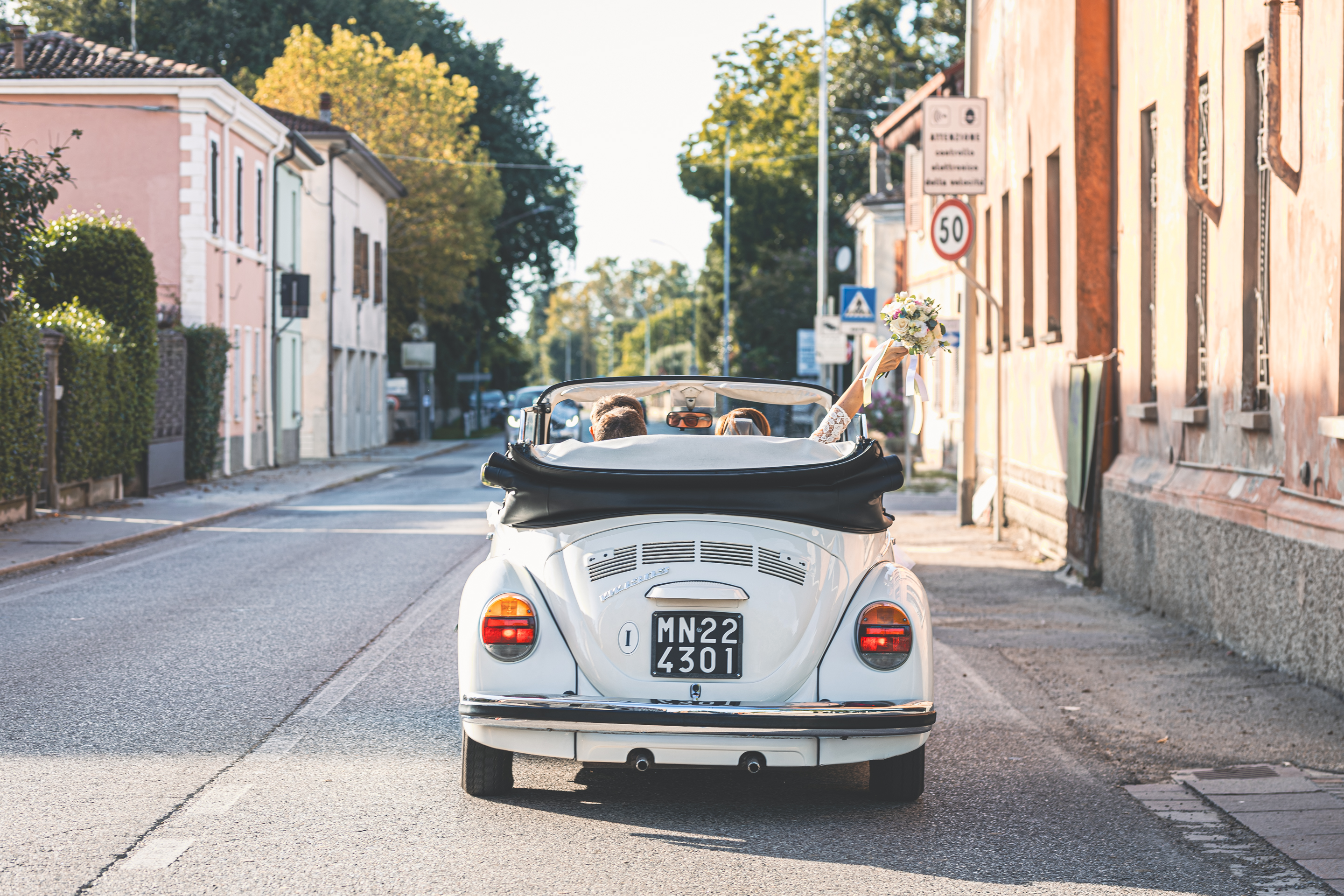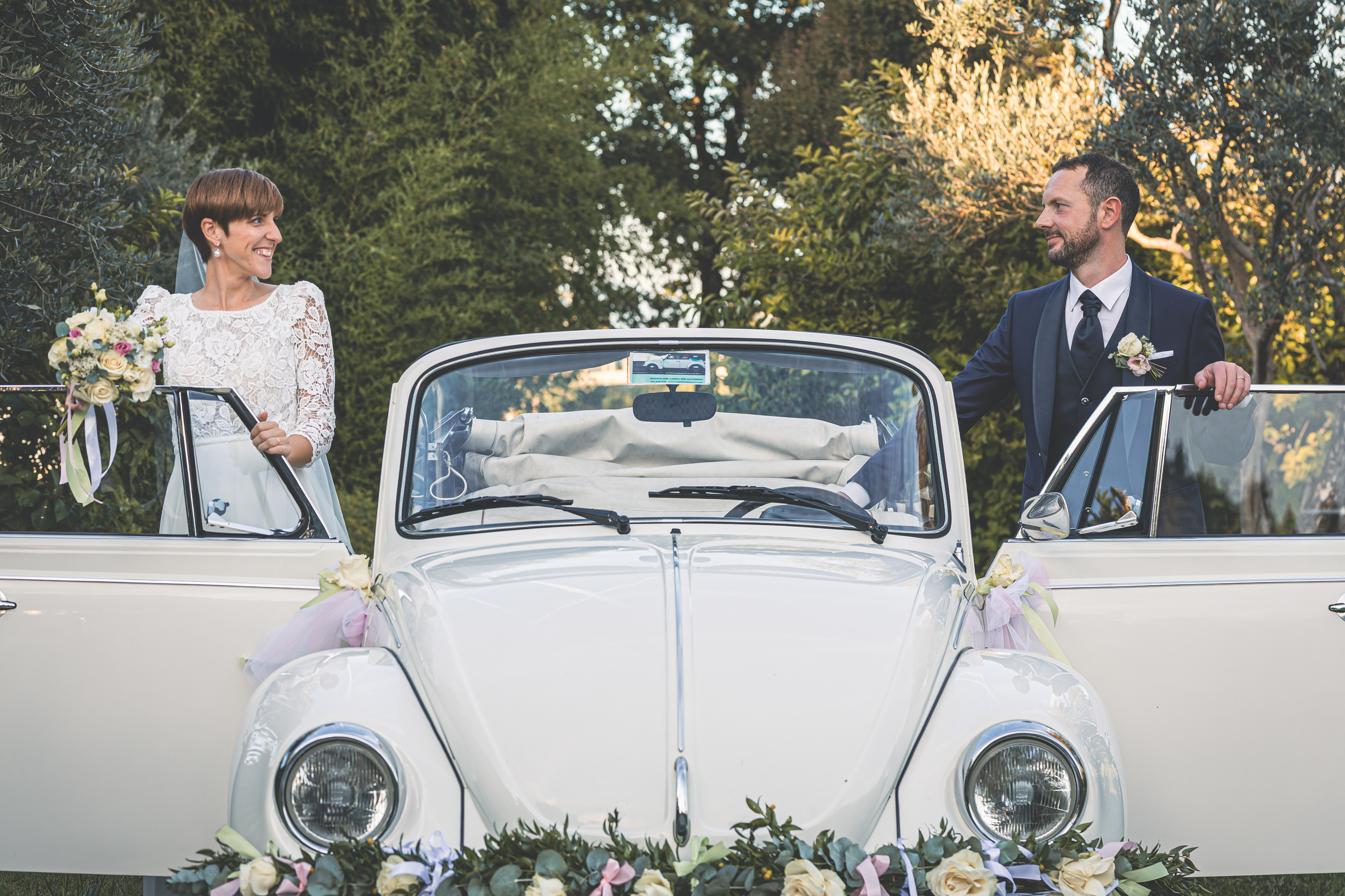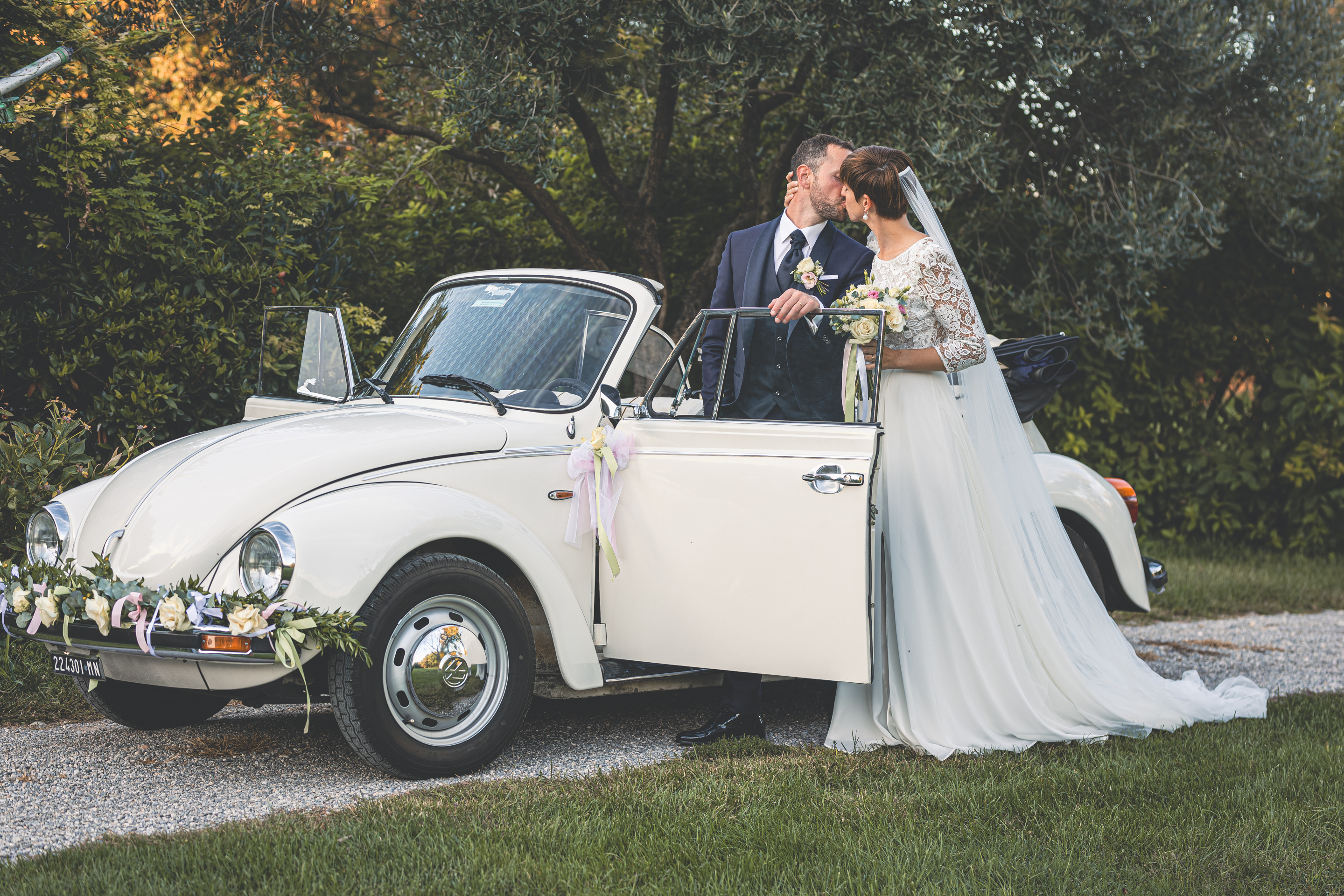 Nel frattempo raggiungo Davide all’esterno della Chiesa, elegantemente allestita da Mondo in Fiore, mentre accoglie i primi ospiti. La cerimonia religiosa è accompagnata dai canti di Simone Ghidetti, creando un’atmosfera raccolta e partecipata. All’uscita, riso, sorrisi e abbracci festeggiano il sì di Erica e Davide. Gli Sposi partono poi a bordo dello splendido maggiolone di Maggiolone per Matrimoni, direzione Corte Francesco. All’arrivo, mentre gli invitati si godono aperitivo e musica con DJ Rocky, ci ritagliamo un momento tutto per loro nel parco della Corte, tra sguardi complici e gesti spontanei.