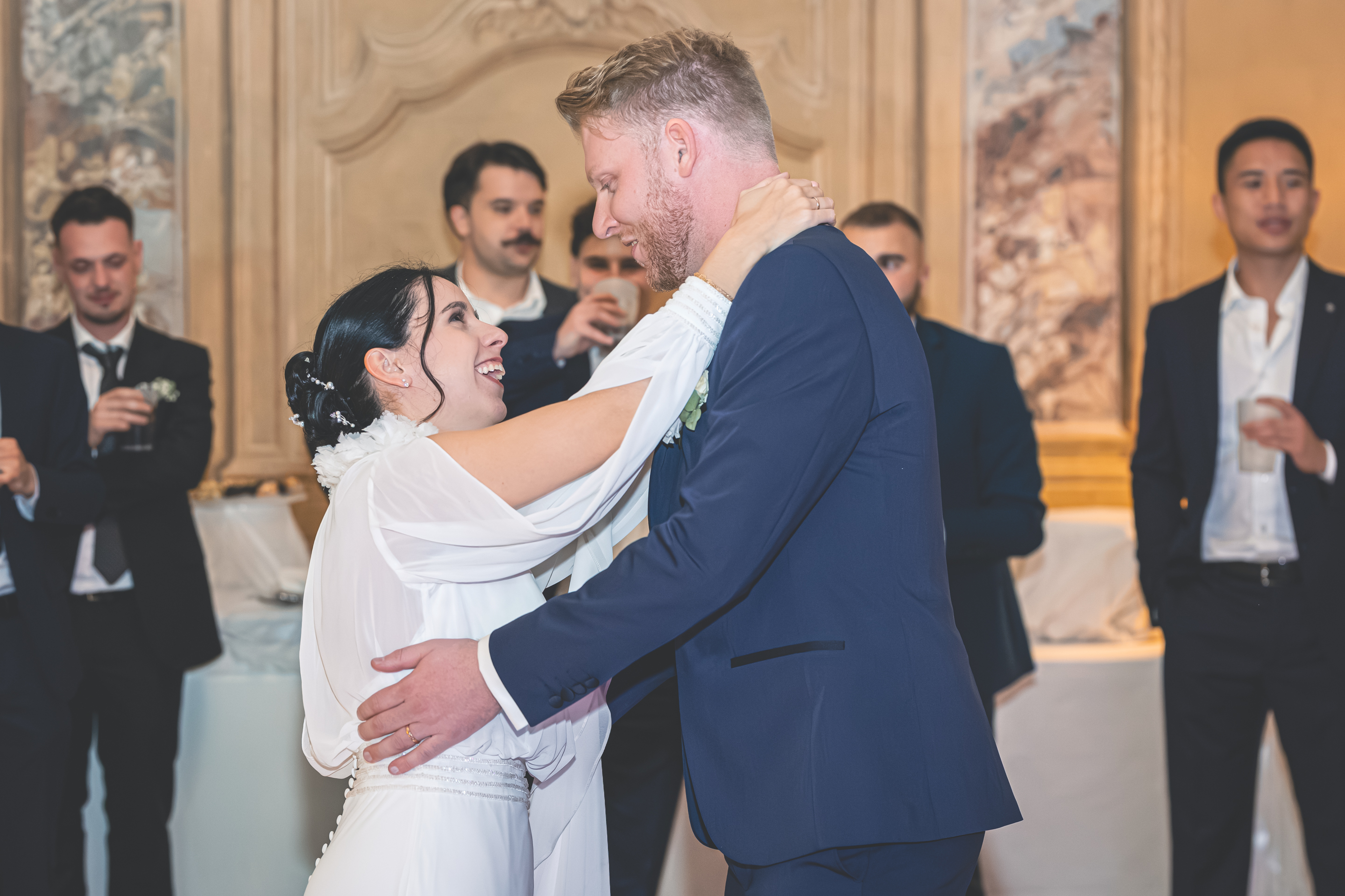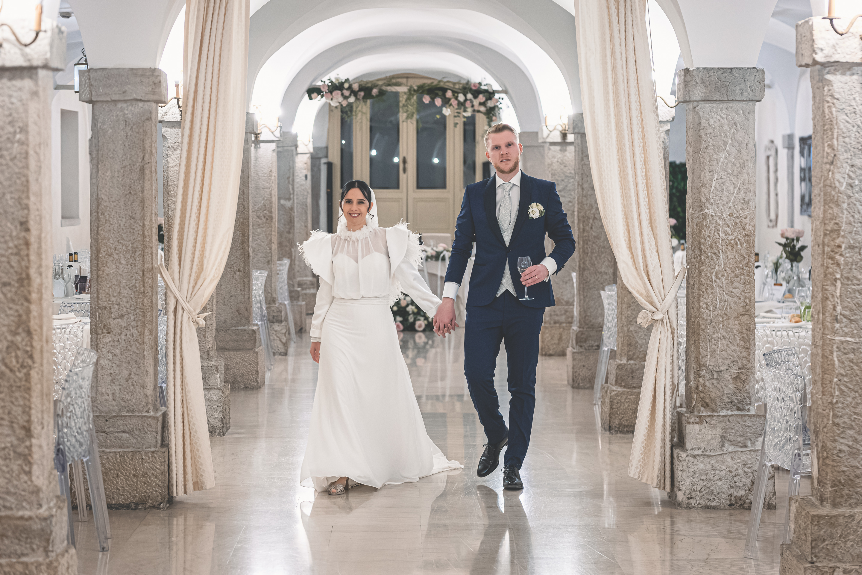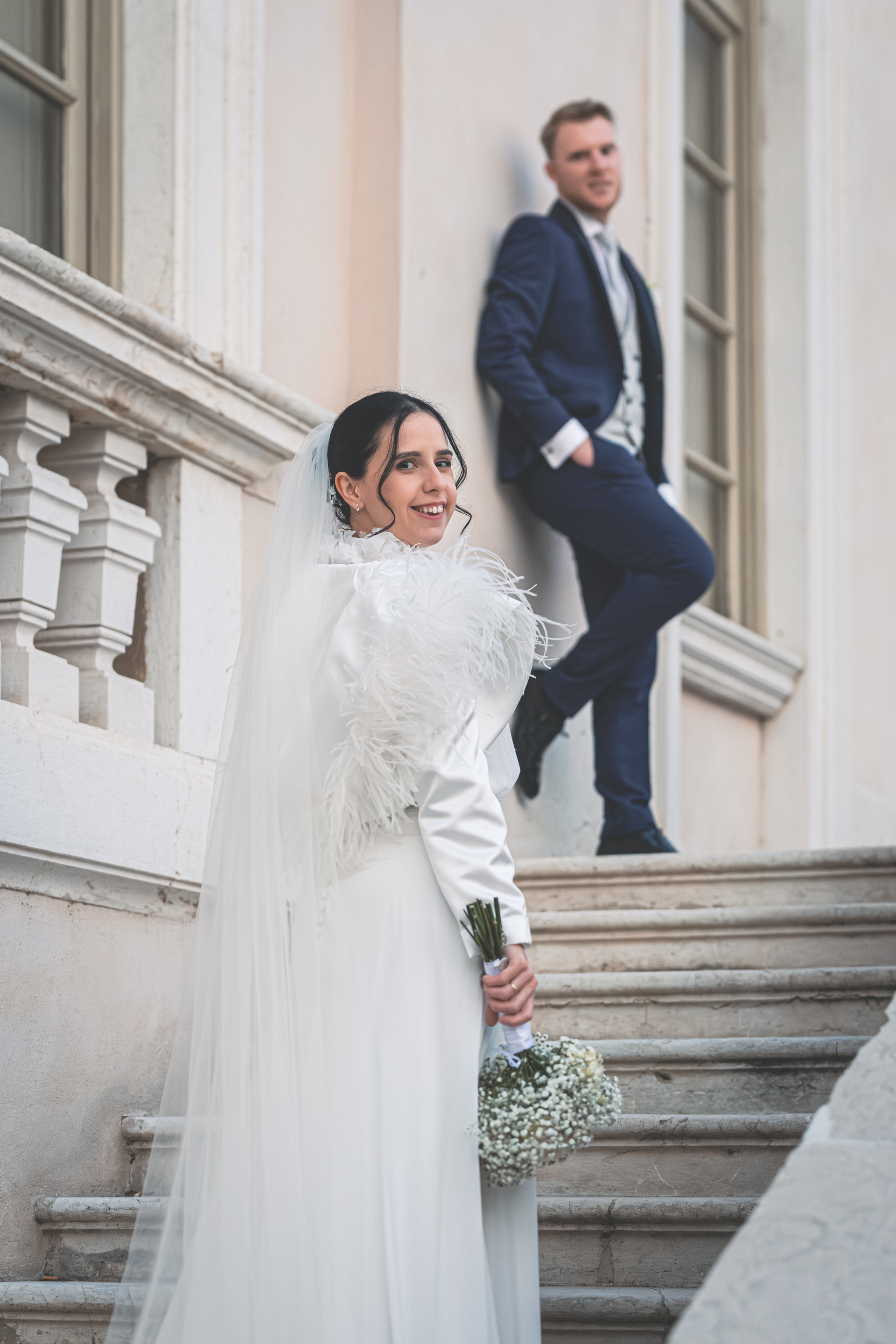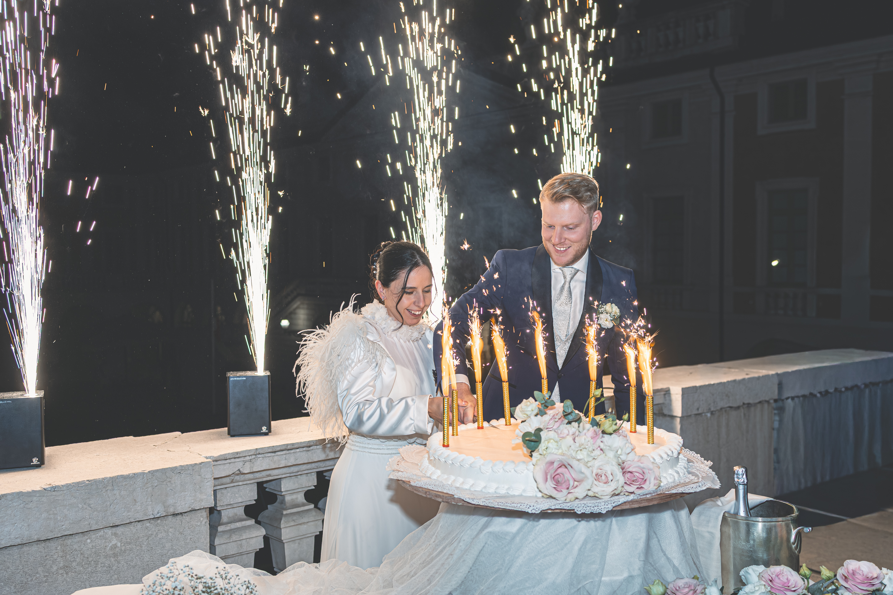 La cena prende vita in una sala molto suggestiva, perfetta per accompagnare una serata che si accende presto. L’energia e la simpatia di Ciro Song & Music Live sono una garanzia: tra balli, risate e giochi, il coinvolgimento degli invitati è continuo e spontaneo. Per il taglio torta ci spostiamo sulla terrazza all’aperto, con la Villa sullo sfondo a rendere il momento ancora più suggestivo. Poi la festa continua ancora tra musica, balli e la consegna delle bomboniere firmate Giuliana Pinzi, fino a notte. Un matrimonio vissuto tra due province, due atmosfere e un’unica direzione: quella di una giornata autentica, elegante e piena di affetto, costruita attorno a Francesca e Alessandro e al loro modo di festeggiare insieme alle persone più importanti.