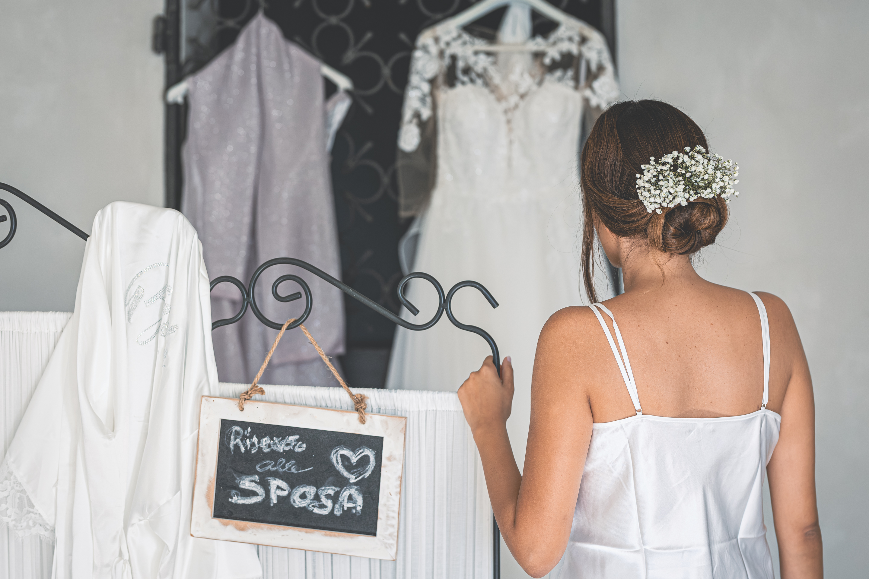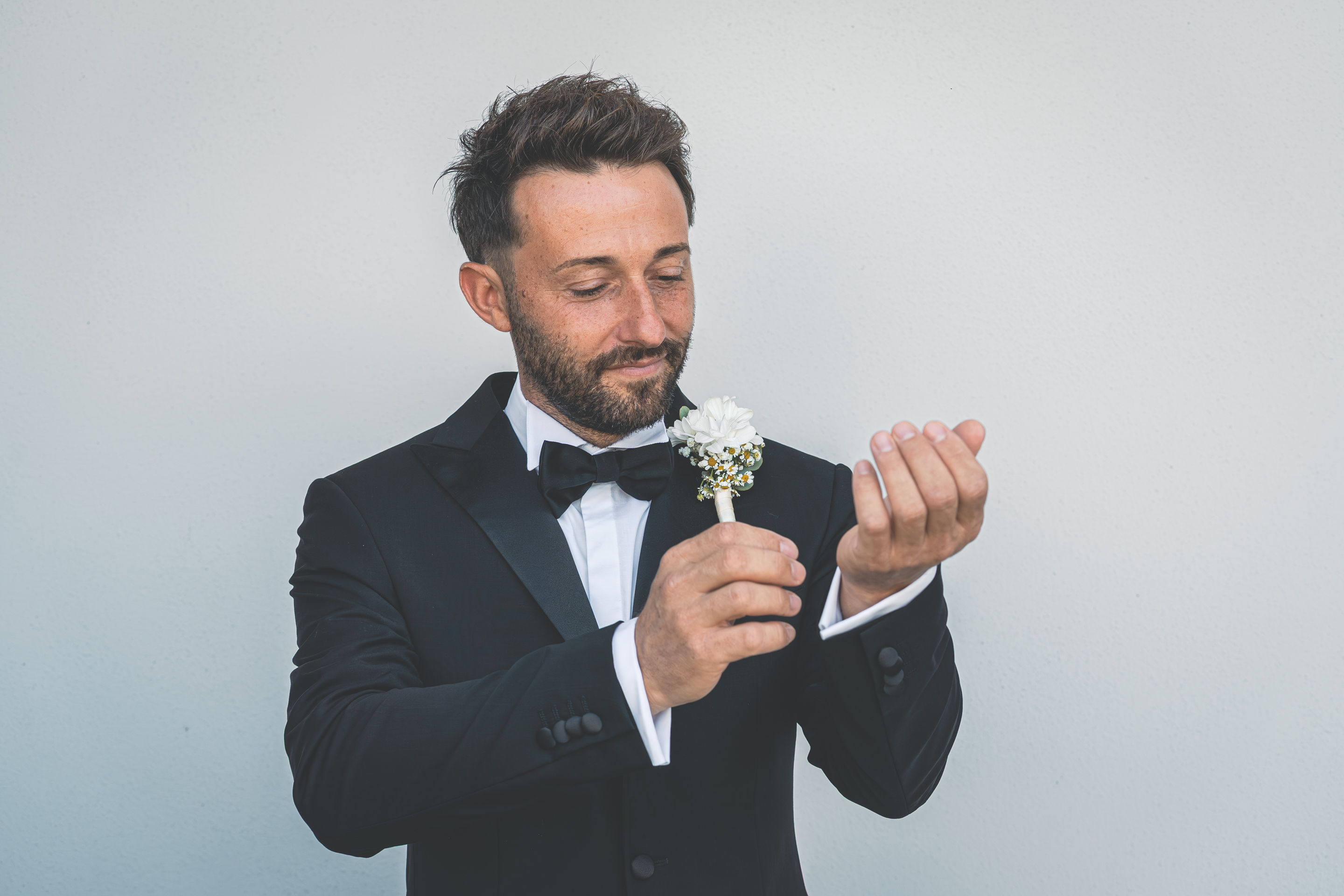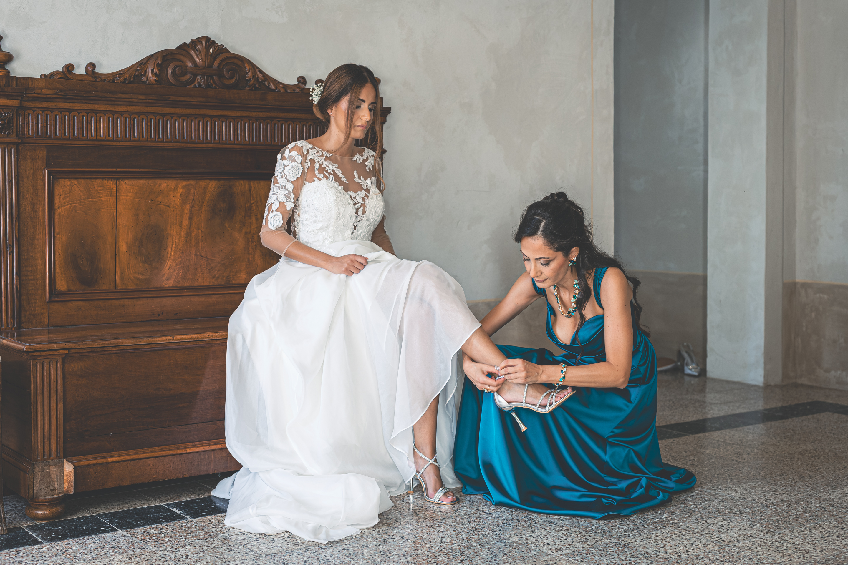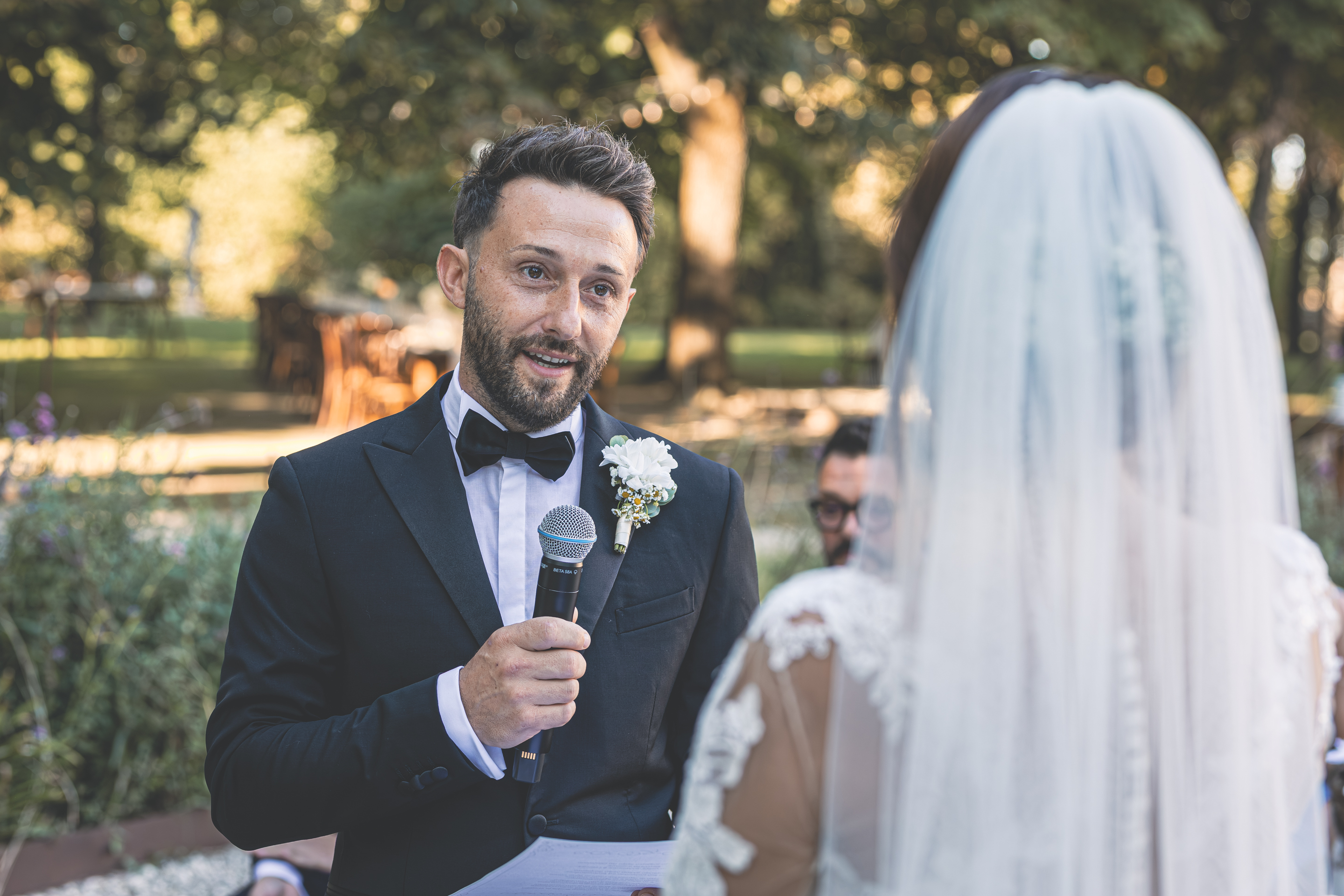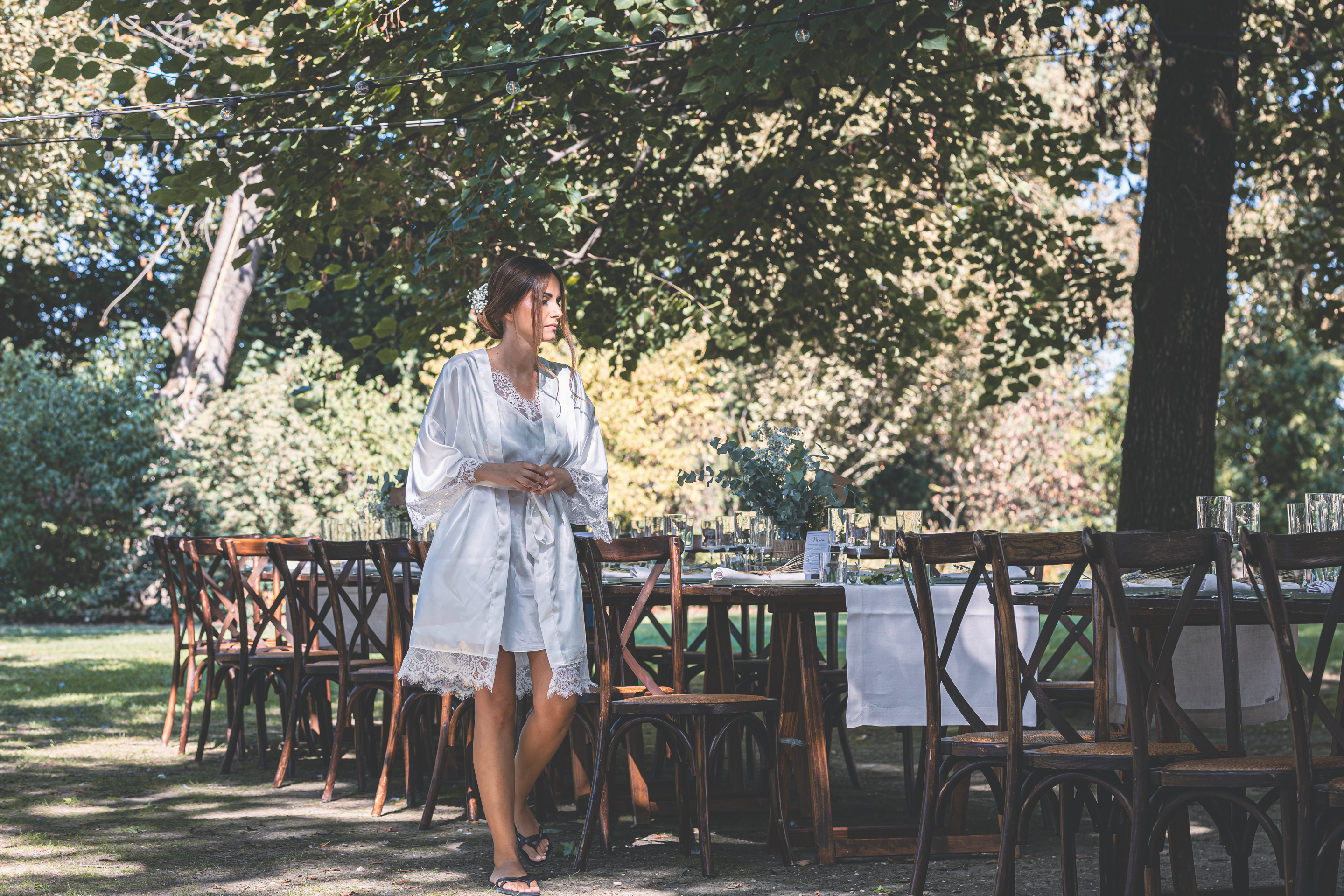 I preparativi di Alessandro scorrono tra risate e affetto familiare, seguiti da Raffaele Ferrari, mentre io raggiungo la Villa dove mi attende Francesca. Qui l’atmosfera è intima e vibrante: i capelli prendono forma grazie allo zio Alessandro Bardoscia, e il make-up è curato da Martina Tomirotti. Prima di indossare l’abito firmato Sposi Domani, Francesca si concede un ultimo sopralluogo nel parco: i tavoli sono curati da Carolina Mai – che ha dato forma anche ai ai dettagli della giornata, dal tableau mariage alle bomboniere – mentre l’allestimento floreale porta la firma di Fiori Trizia. Mentre arrivano i primi invitati, Francesca completa la vestizione circondata dal sostegno della famiglia.