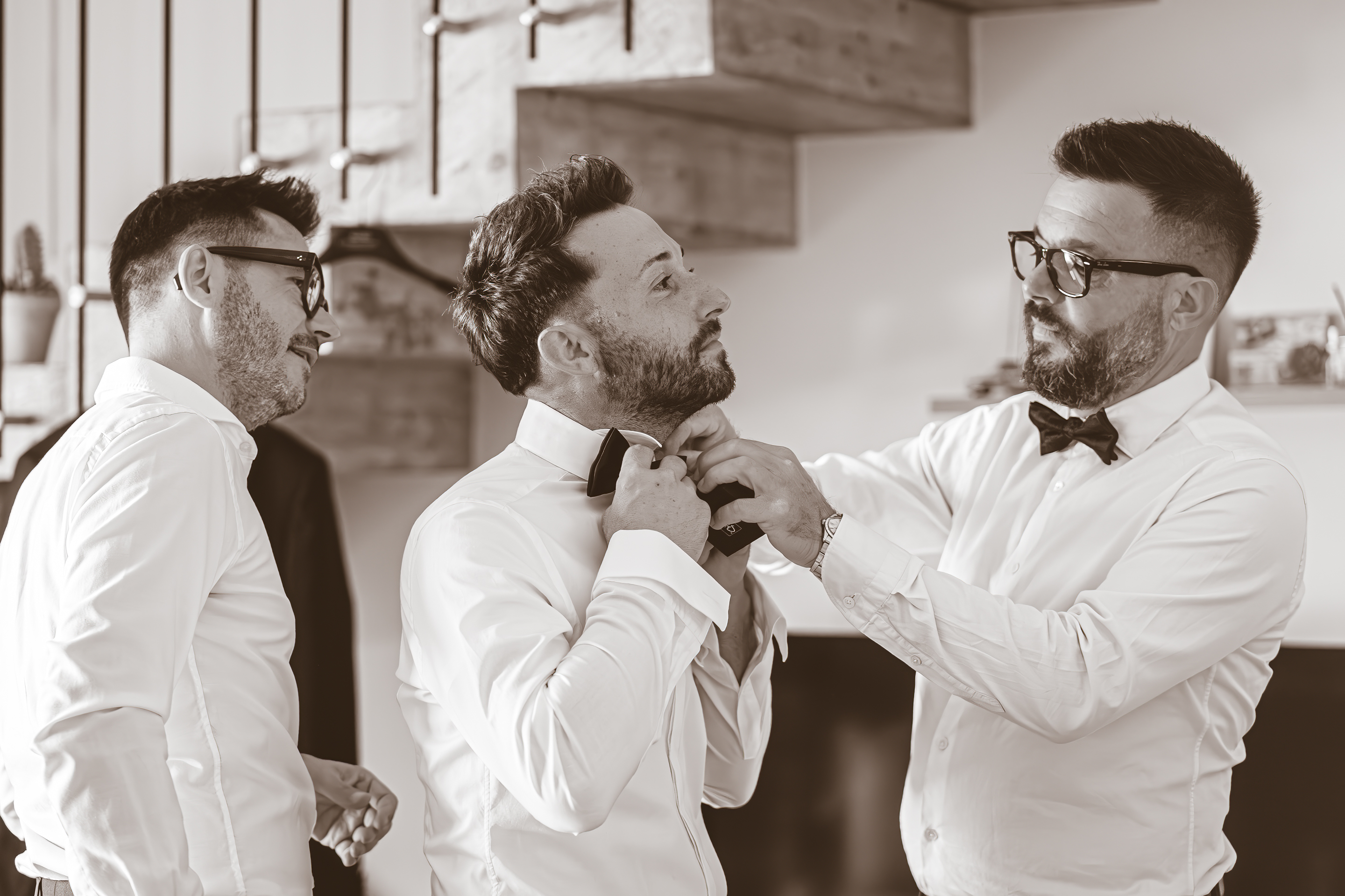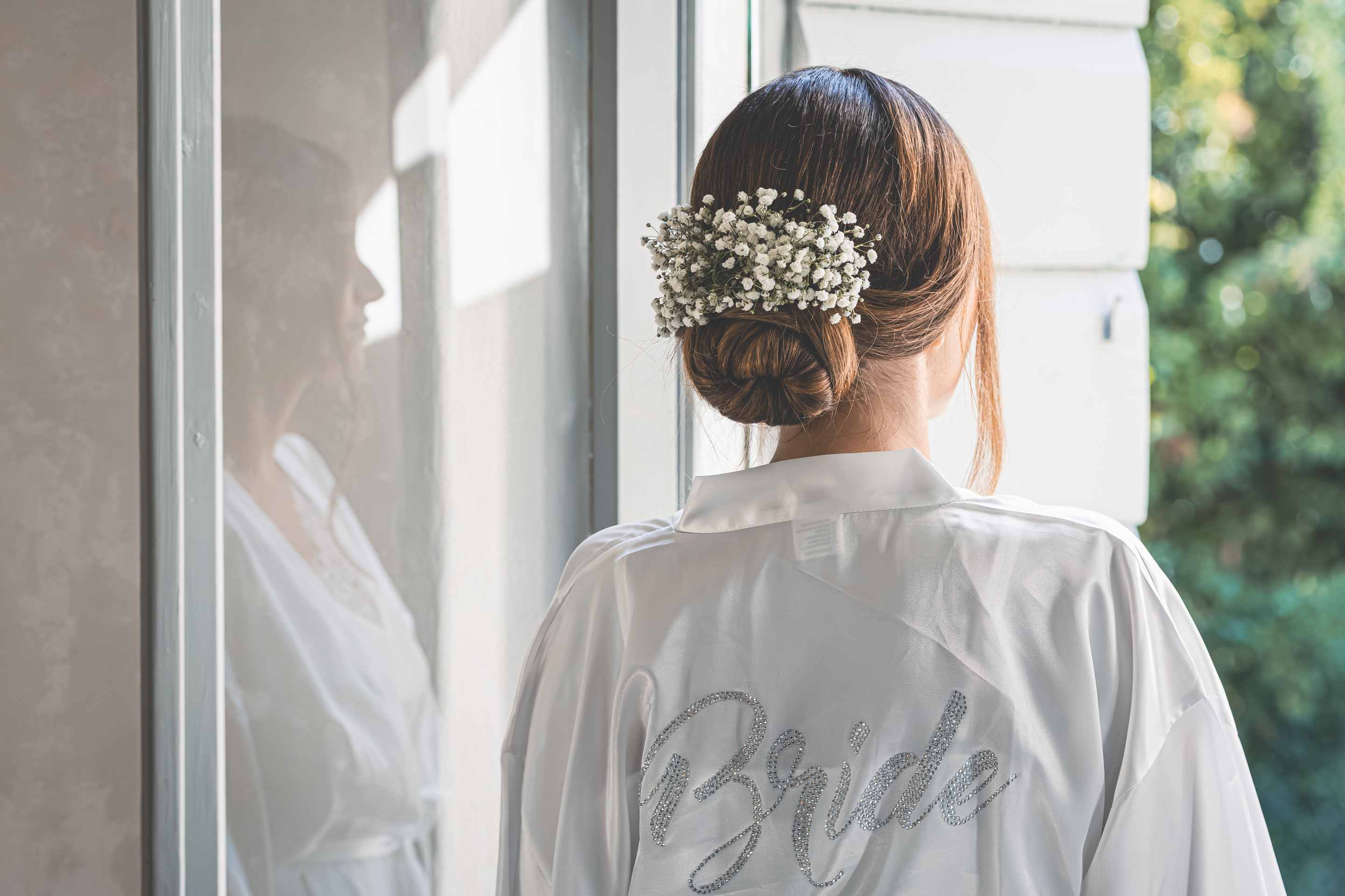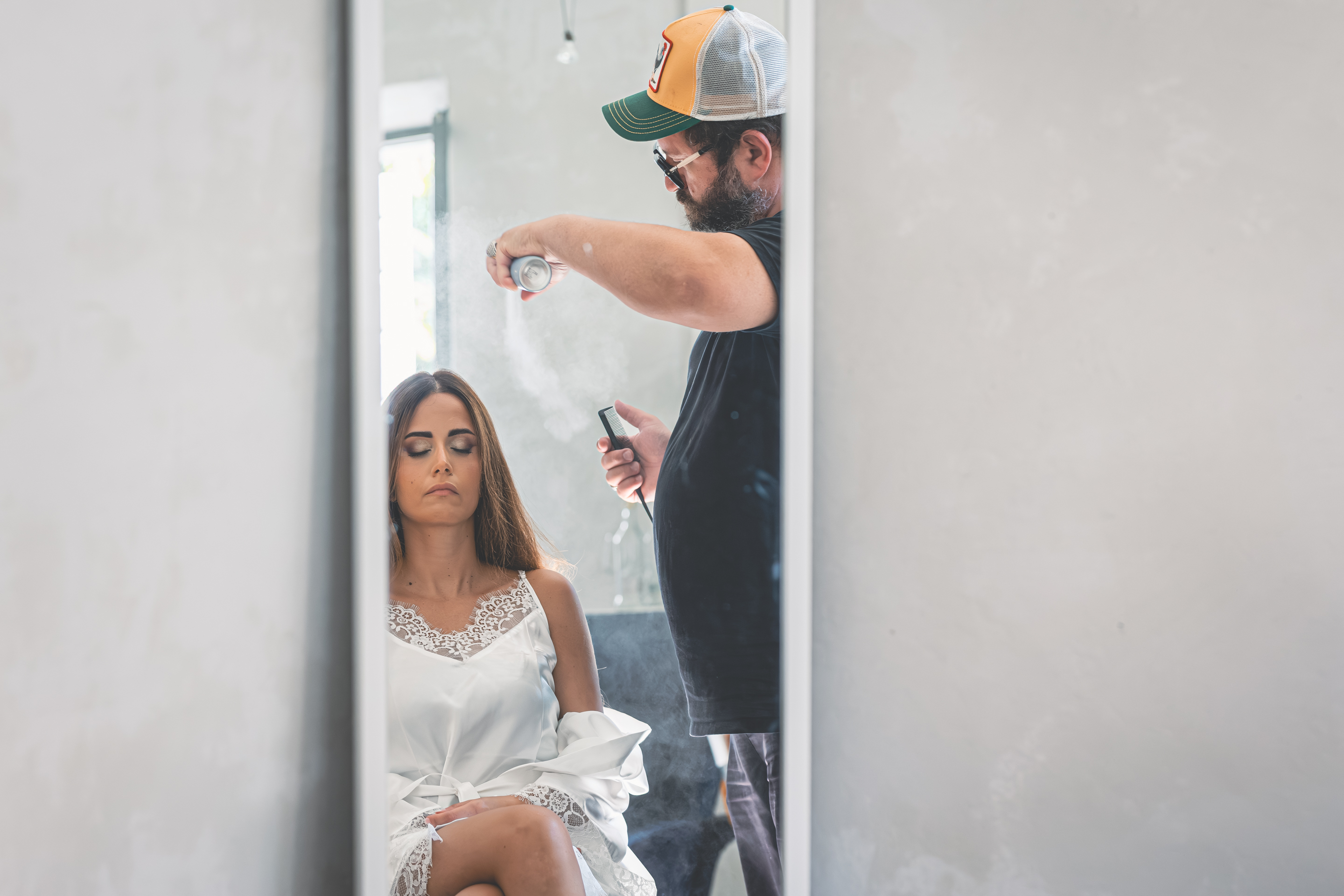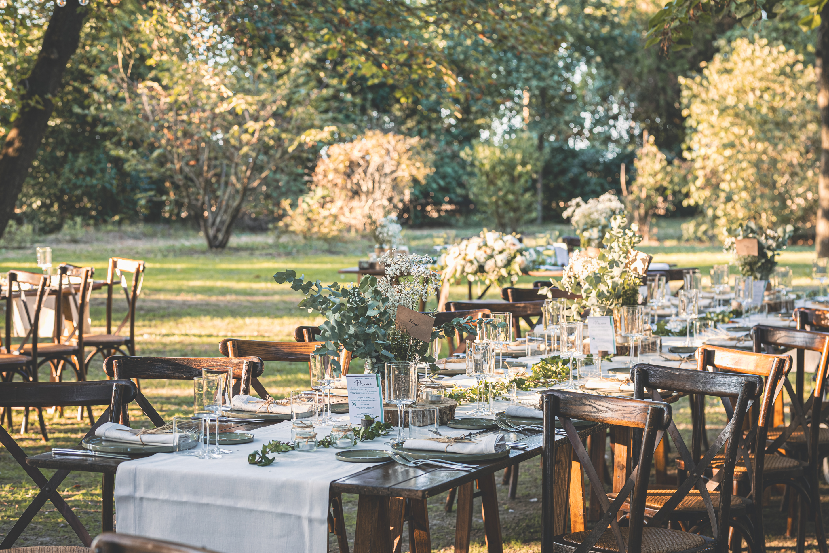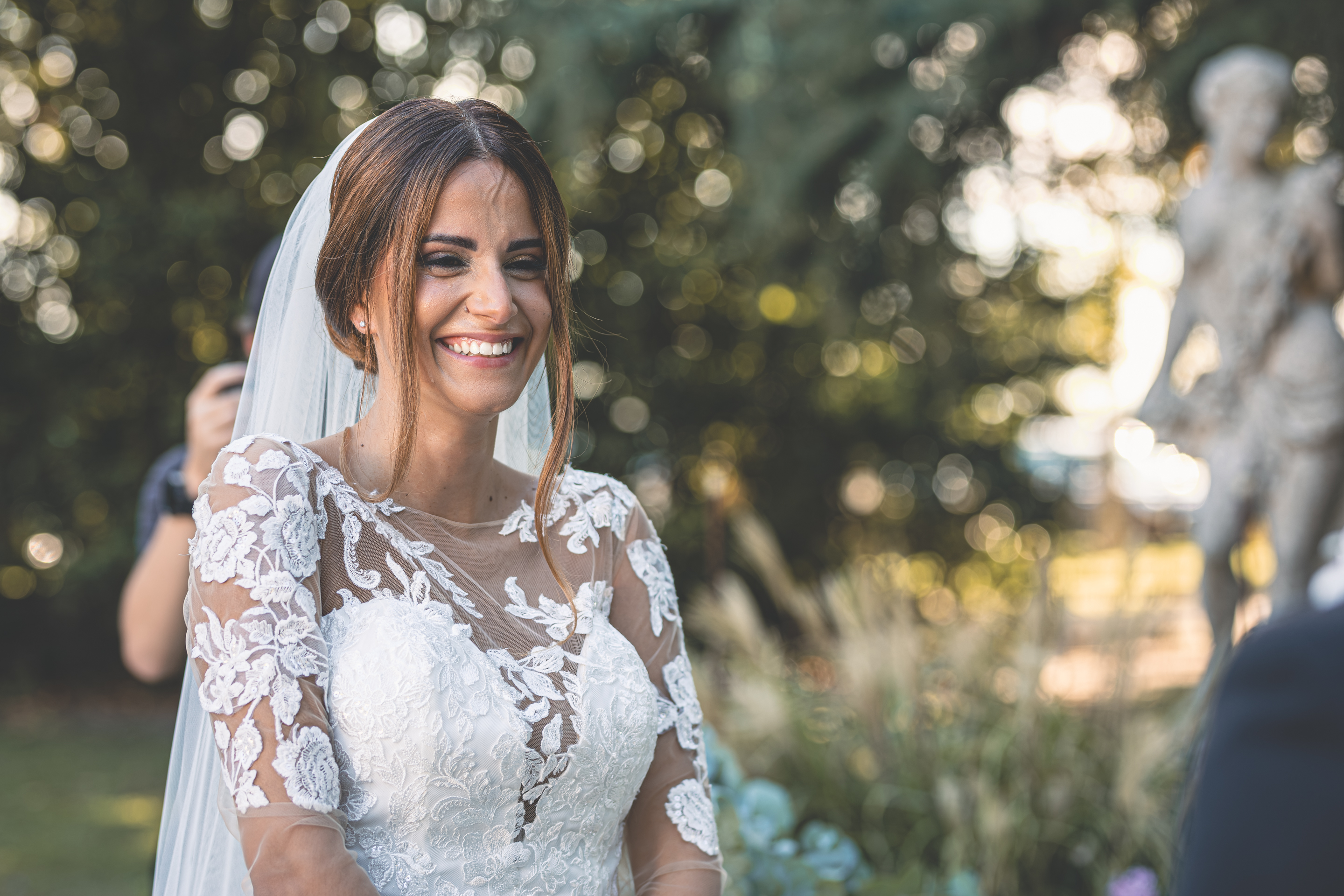 I preparativi di Alessandro scorrono tra risate e affetto familiare, seguiti da Raffaele Ferrari, mentre io raggiungo la Villa dove mi attende Francesca. Qui l’atmosfera è intima e vibrante: i capelli prendono forma grazie allo zio Alessandro Bardoscia, e il make-up è curato da Martina Tomirotti. Prima di indossare l’abito firmato Sposi Domani, Francesca si concede un ultimo sopralluogo nel parco: i tavoli sono curati da Carolina Mai – che ha dato forma anche ai ai dettagli della giornata, dal tableau mariage alle bomboniere – mentre l’allestimento floreale porta la firma di Fiori Trizia. Mentre arrivano i primi invitati, Francesca completa la vestizione circondata dal sostegno della famiglia.