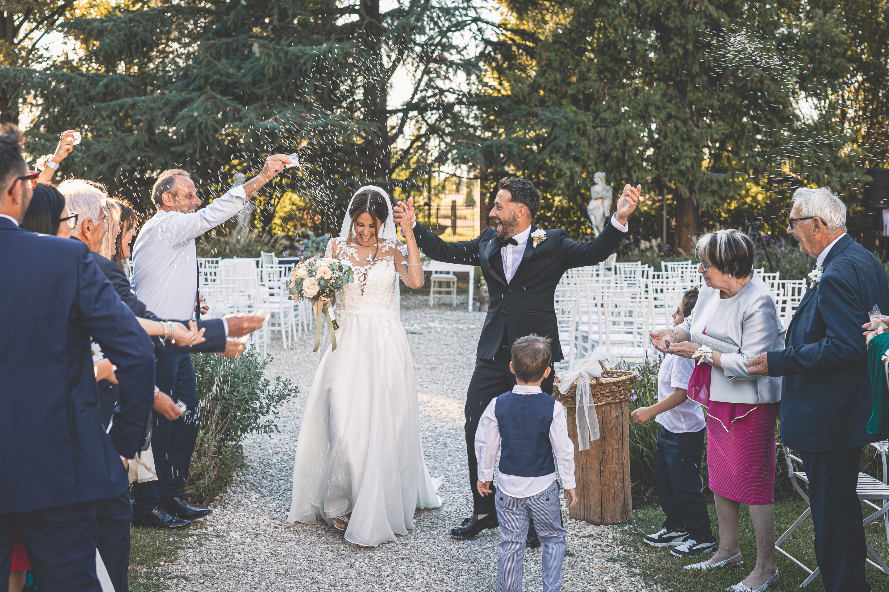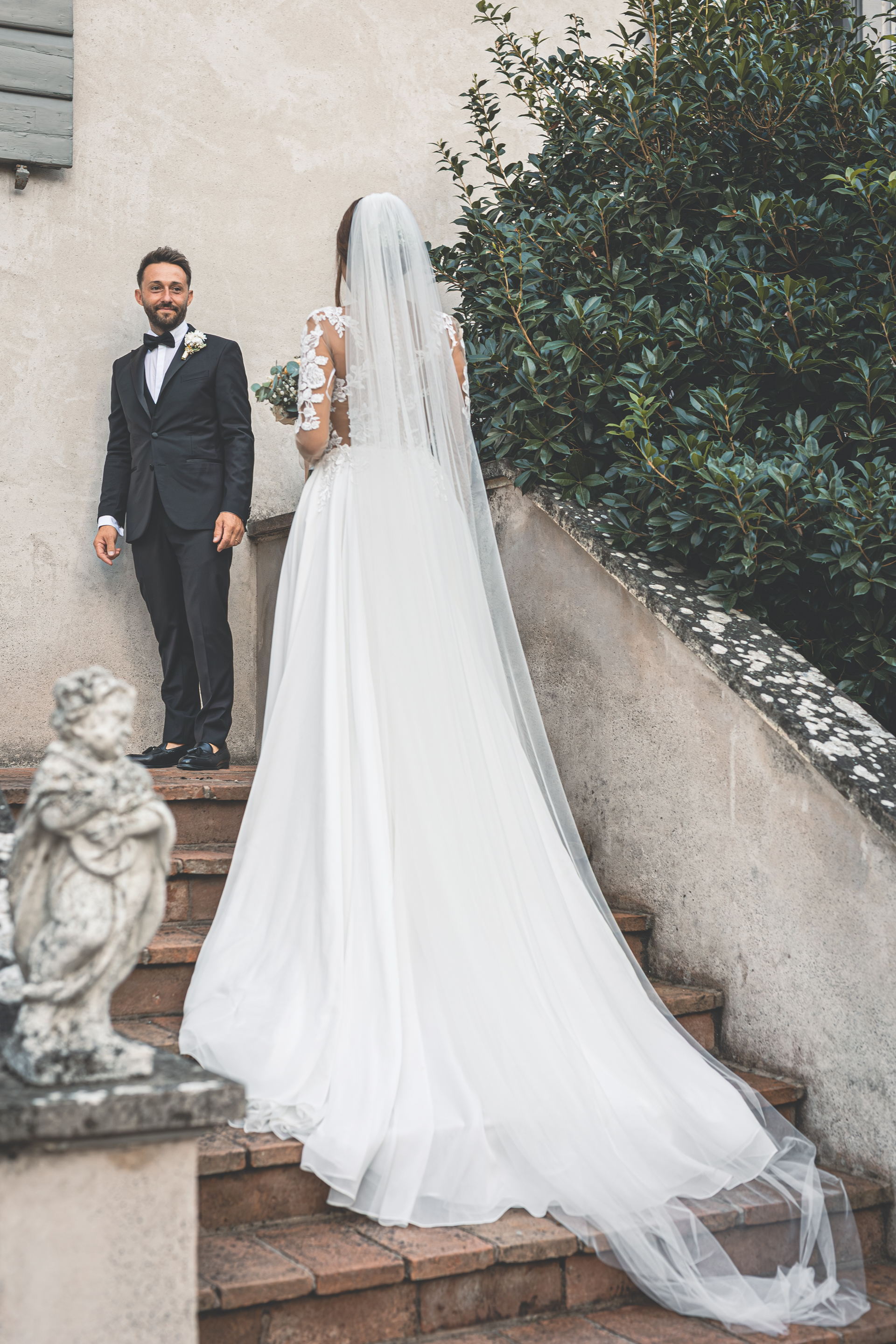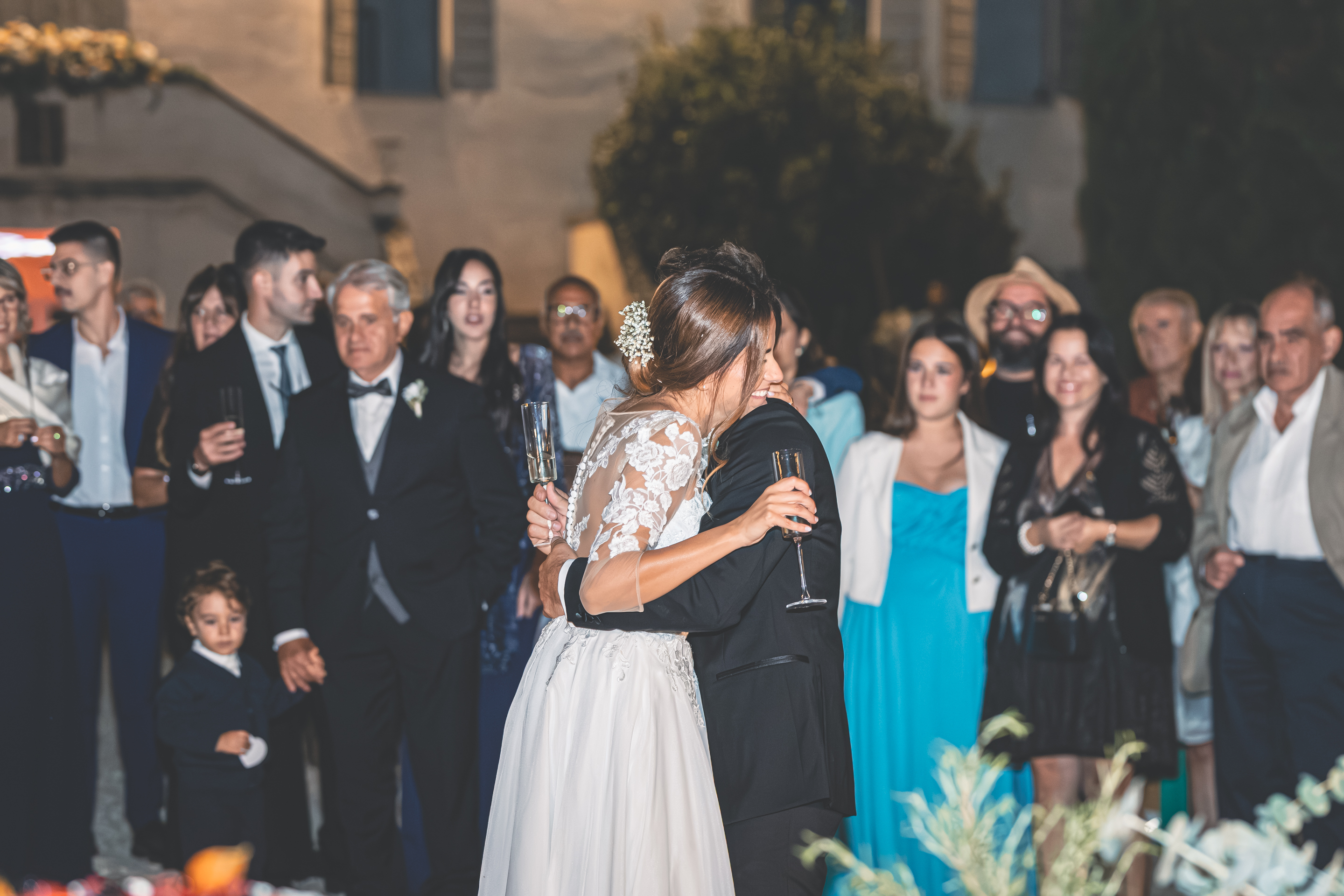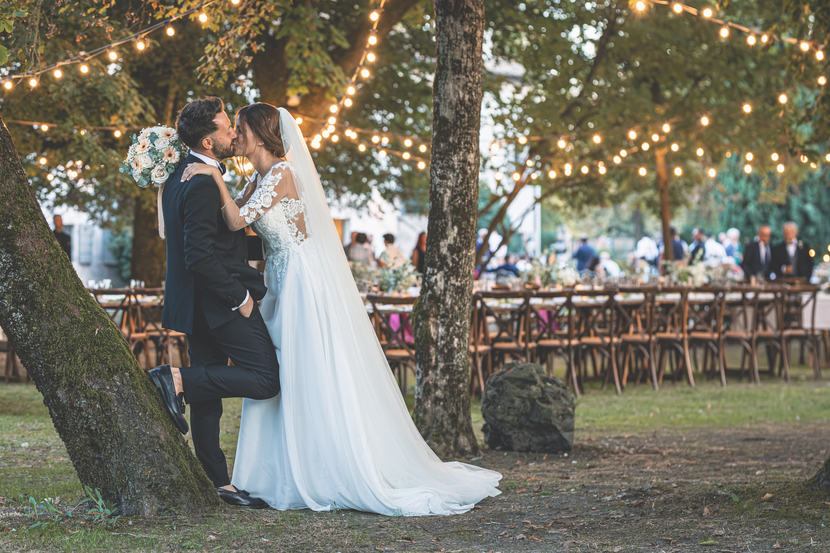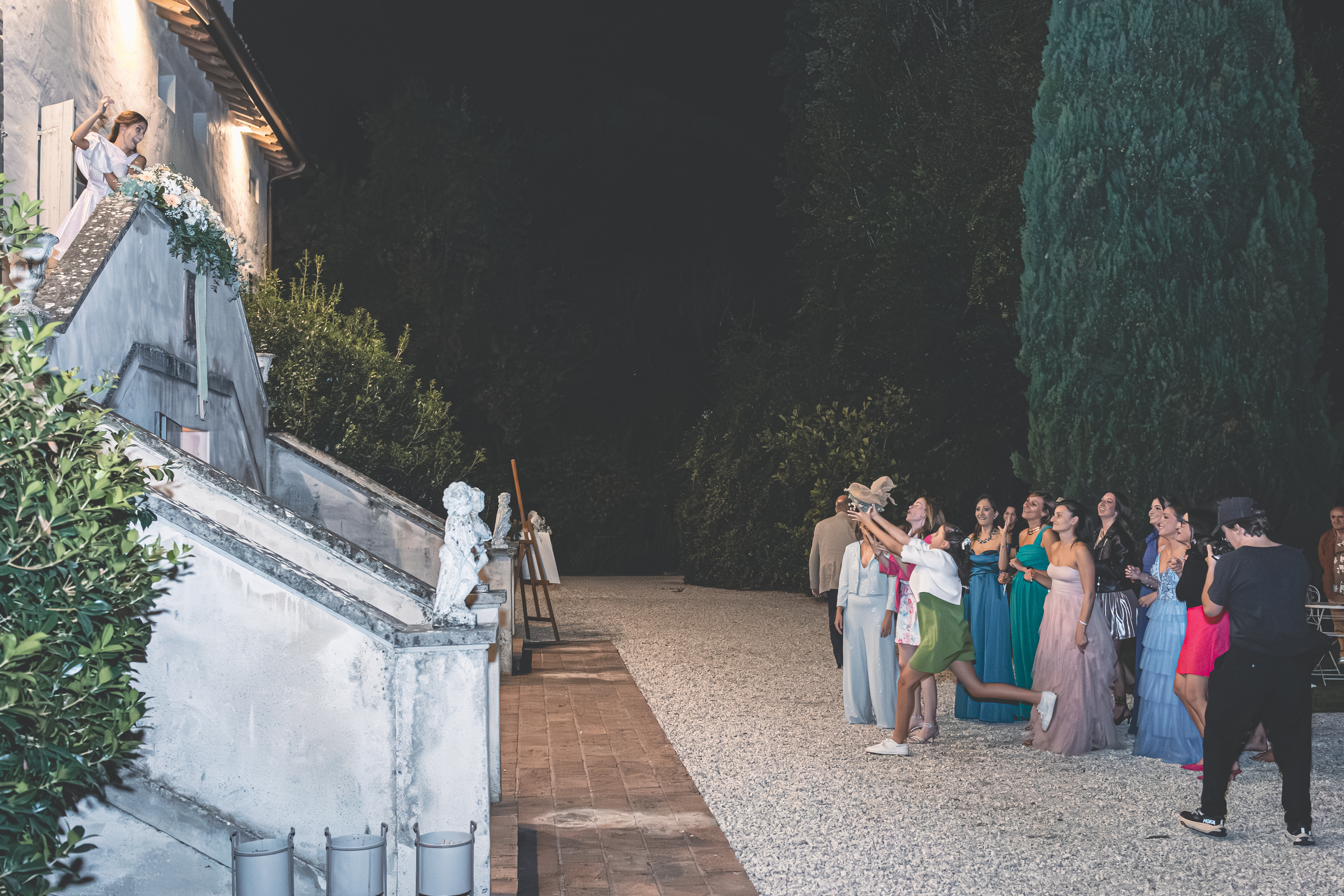 L’ottima cena targata Idea in Cucina scorre nel parco sotto le luci all’italiana: risate, brindisi, e l’allegria contagiosa degli amici di una vita. Il taglio torta torna fronte Villa, seguito dal primo ballo e da un ballo speciale tra Francesca e il suo papà, carico di emozione. Poi il cambio d’abito: Francesca lancia il bouquet dalla scalinata della Villa e la festa si sposta all’interno, tra musica e balli fino a notte inoltrata. Un matrimonio solare, autentico, pieno di persone vere: un racconto di luce e presenza.