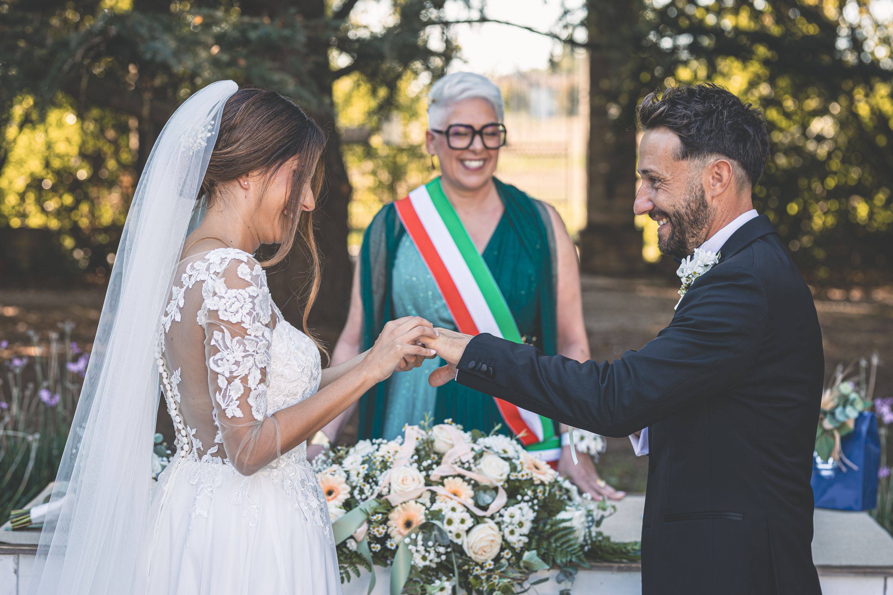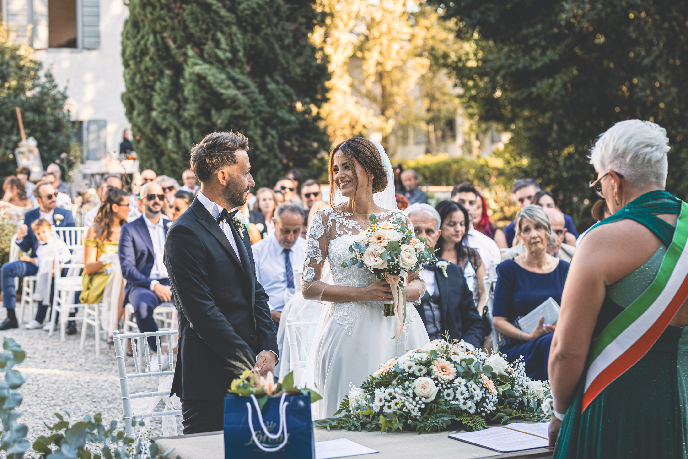 Il rito si svolge fronte Villa: parole lette da amici e parenti, pensieri che si intrecciano e rendono tutto profondamente intimo e toccante. Dopo riso, baci e abbracci, l’aperitivo prende vita al ritmo della musica di Music 4. E quando il sole comincia a scaldarsi al tramonto, ci ritagliamo qualche minuto solo per loro: scatti di complicità, gesti semplici, un modo tutto loro di essere coppia.