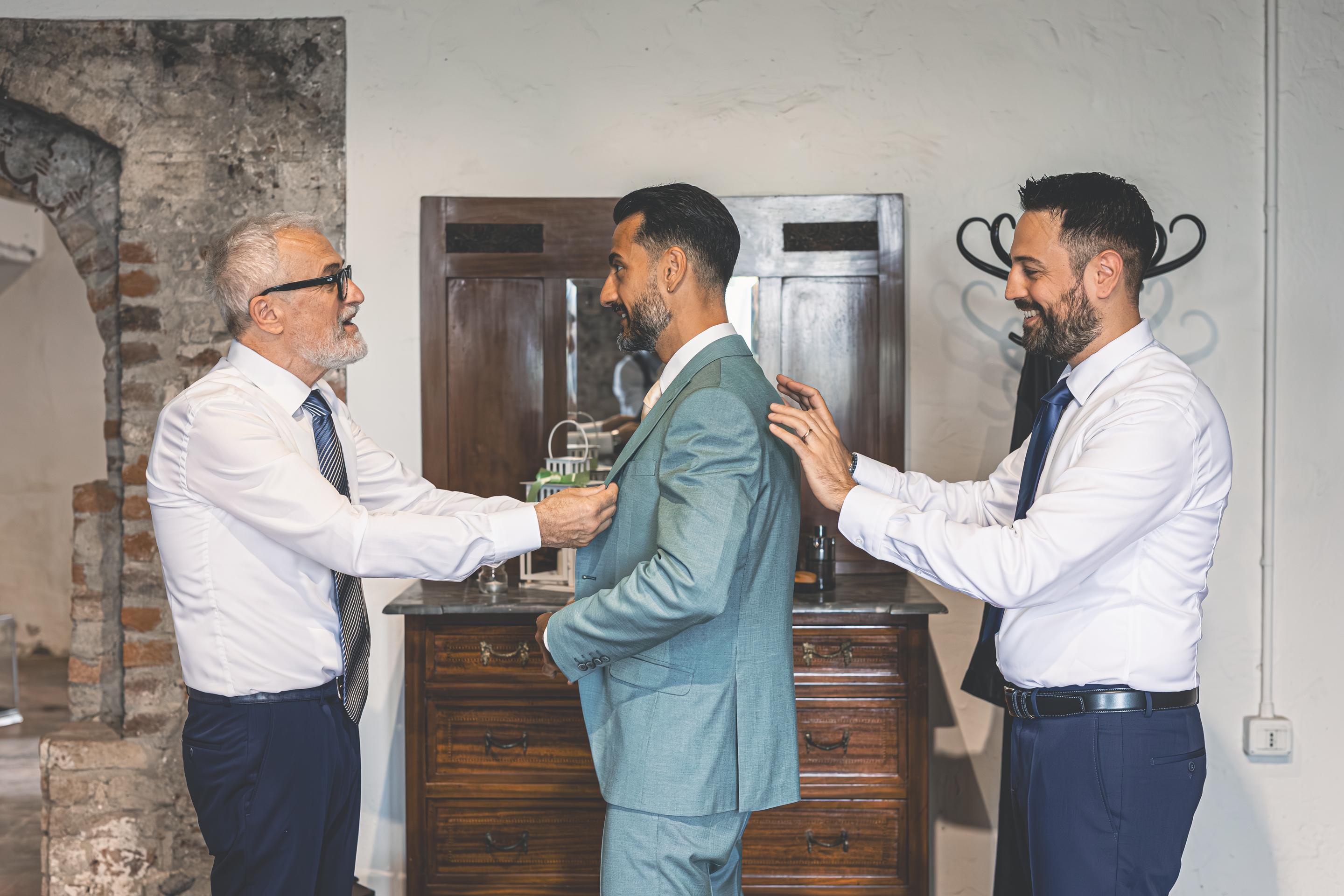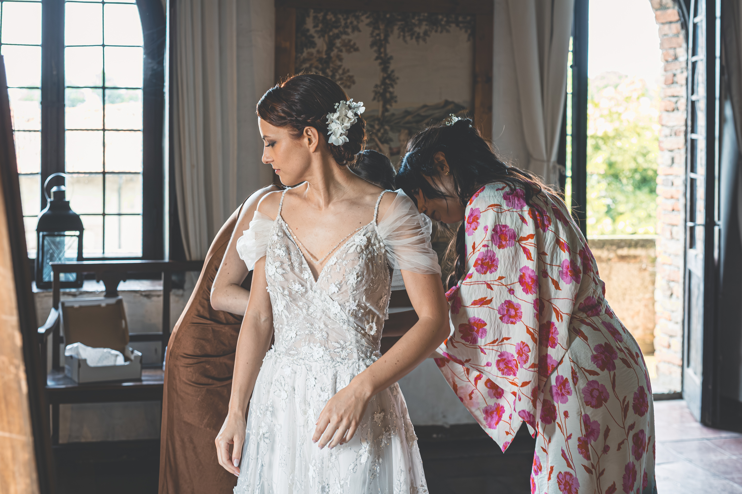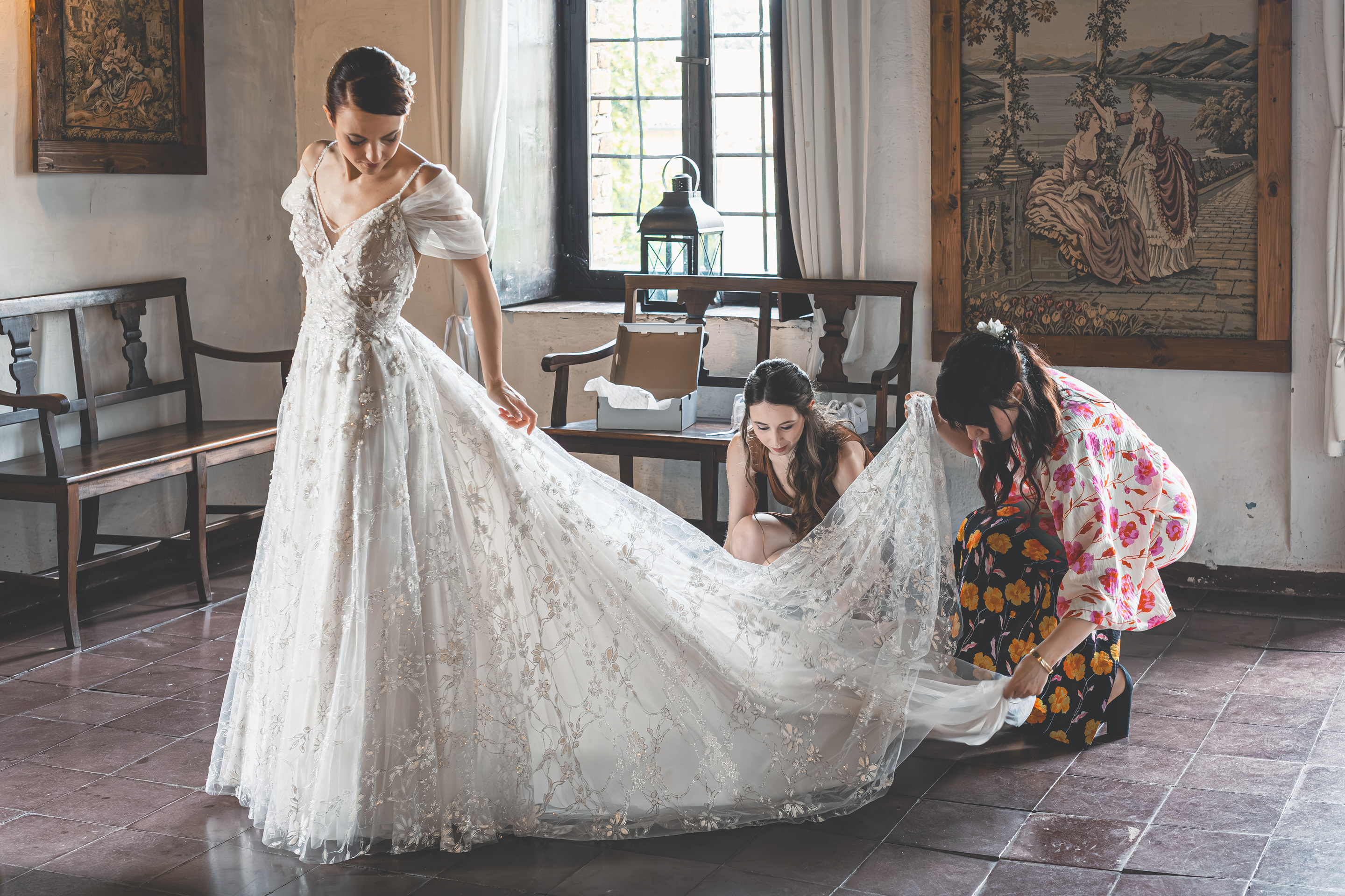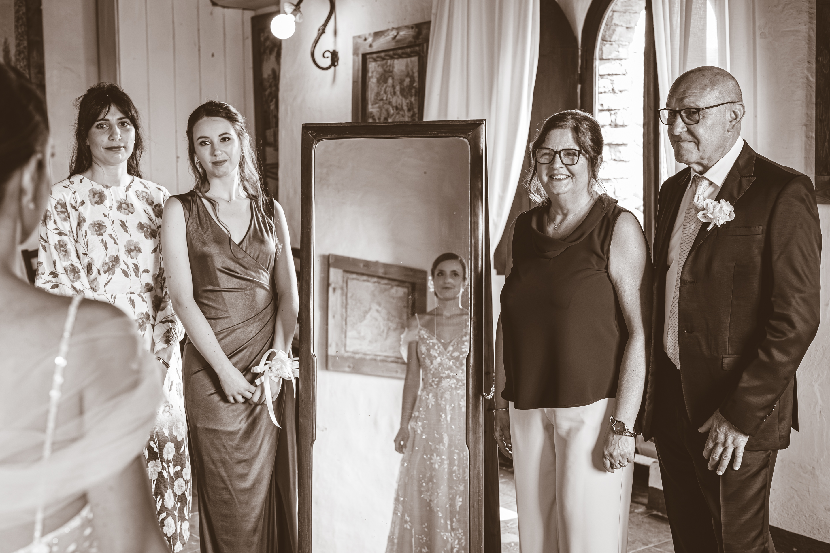 La giornata inizia tra le mura del castello, dove entrambi gli sposi si preparano. Raggiungo per primo Flavio, circondato dall’affetto della sua famiglia al completo. L’atmosfera è intima e piena di significato: piccoli regali, sguardi complici, e parole sussurrate che sigillano l’emozione della vestizione. L’abito è firmato Davino Sposo, la camicia realizzata da Veri Sarti. Poco dopo, salgo da Martina. Silvia Baini è all’opera con trucco e pettinatura, mentre mamma e sorella aiutano la sposa a indossare l’abito. Anche qui, il tempo si sospende: il papà che aspetta con gli occhi lucidi, le testimoni che ricevono pensieri e regali, il bouquet firmato Il Giardino del Re che completa l’incanto.