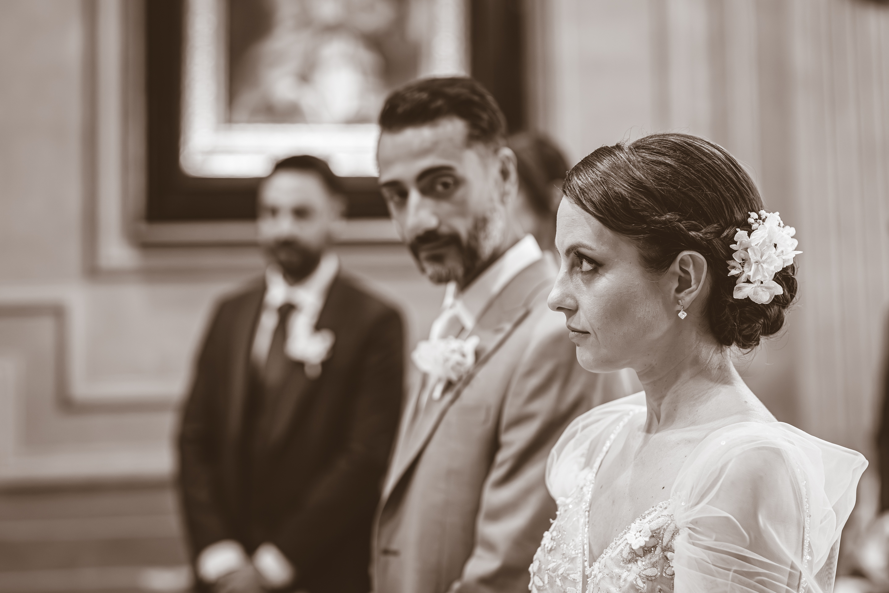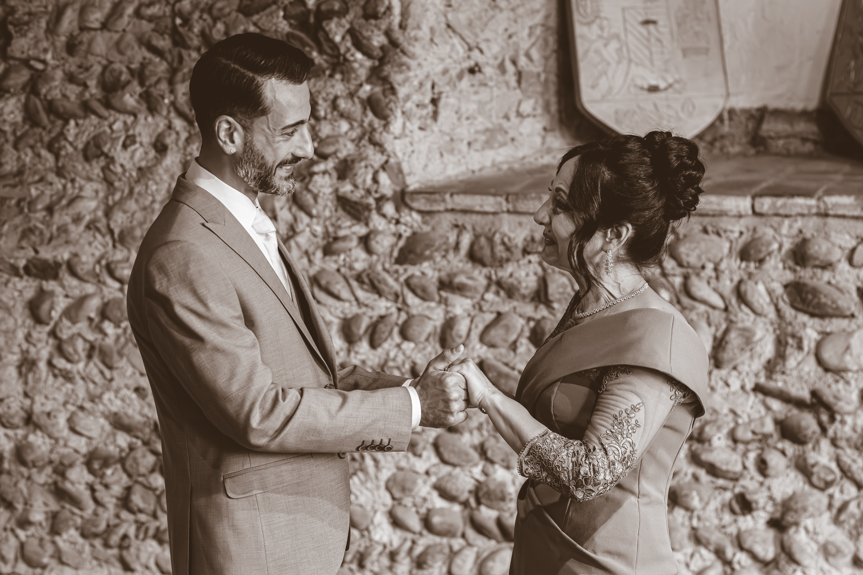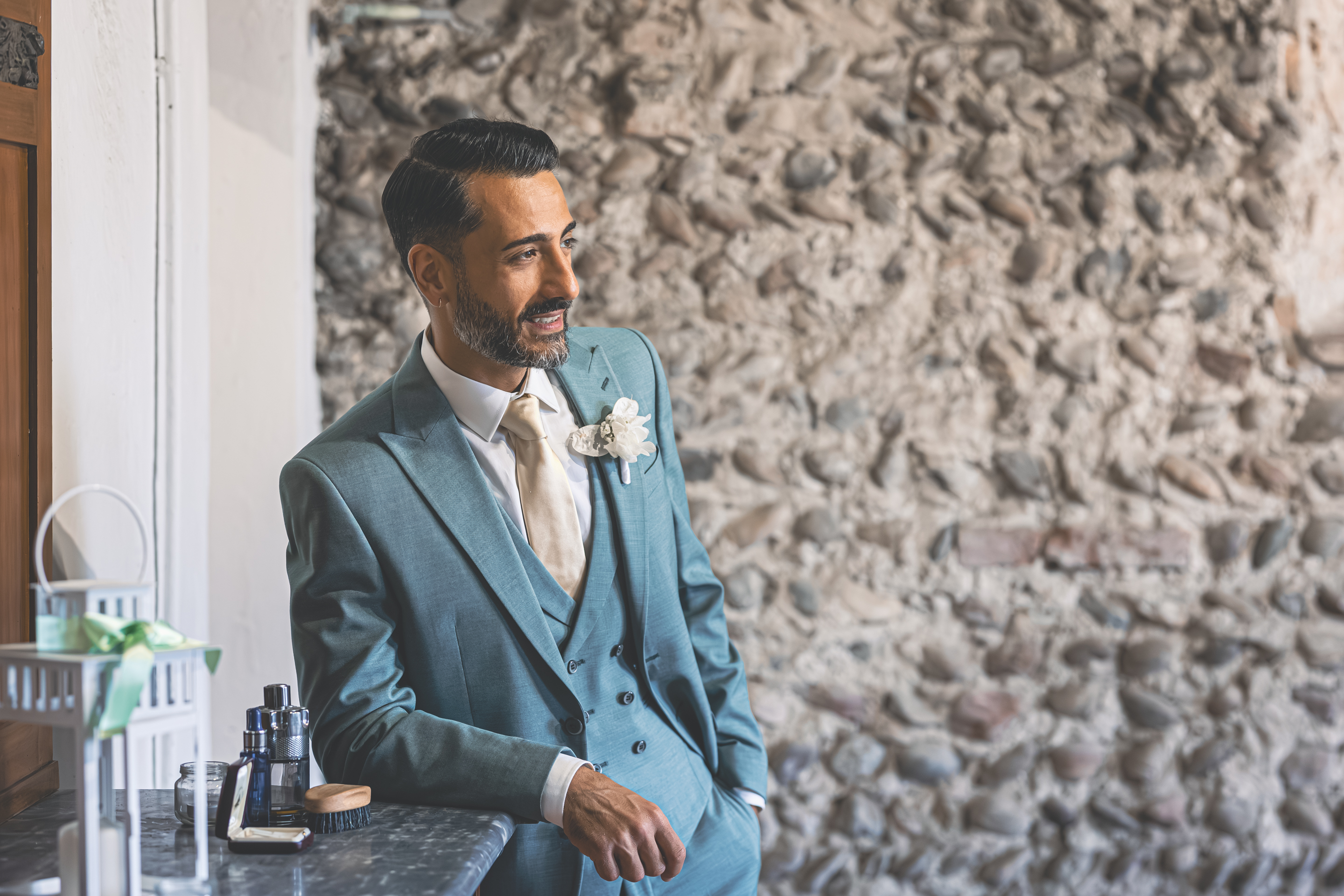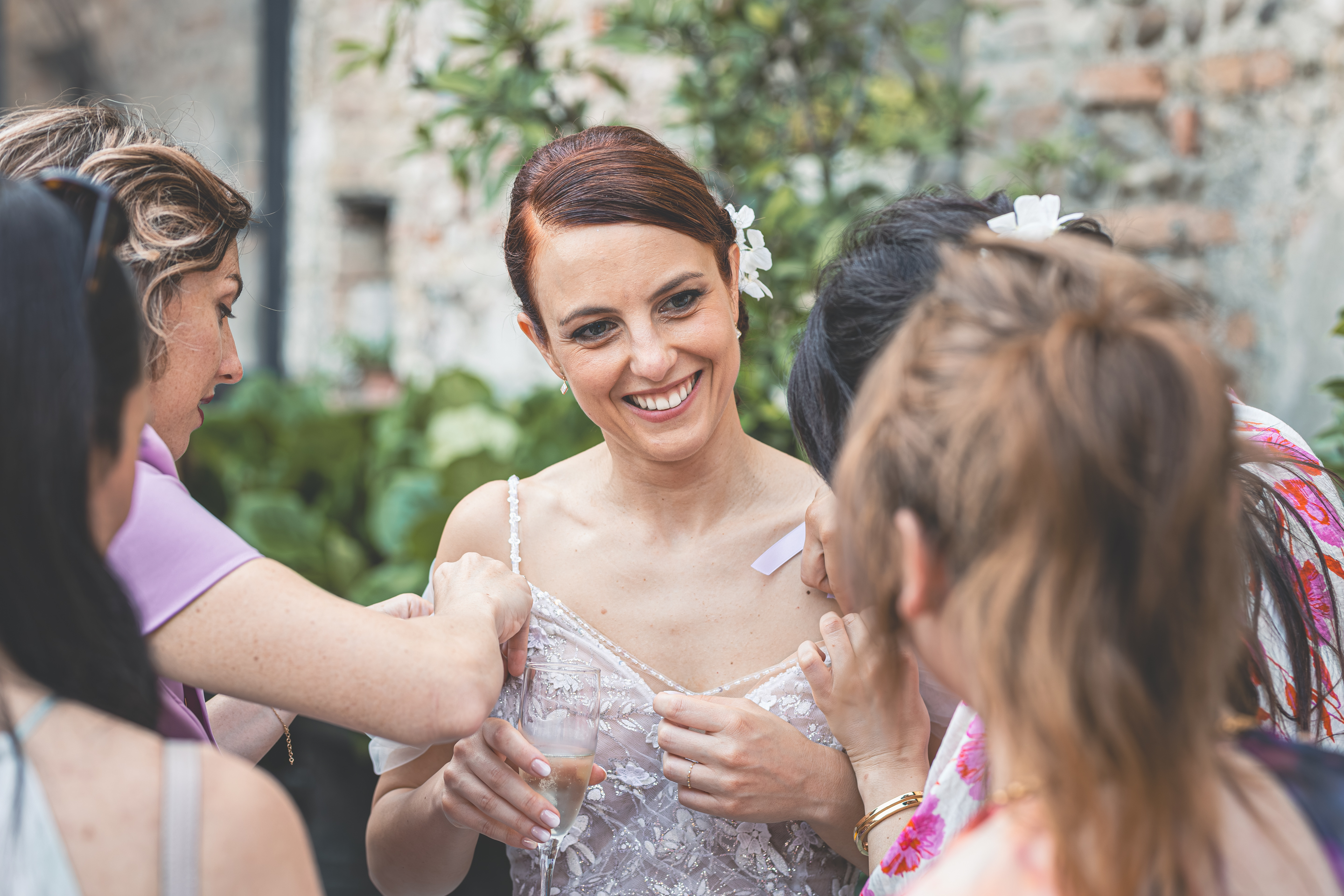La giornata inizia tra le mura del castello, dove entrambi gli sposi si preparano. Raggiungo per primo Flavio, circondato dall’affetto della sua famiglia al completo. L’atmosfera è intima e piena di significato: piccoli regali, sguardi complici, e parole sussurrate che sigillano l’emozione della vestizione. L’abito è firmato Davino Sposo, la camicia realizzata da Veri Sarti. Poco dopo, salgo da Martina. Silvia Baini è all’opera con trucco e pettinatura, mentre mamma e sorella aiutano la sposa a indossare l’abito. Anche qui, il tempo si sospende: il papà che aspetta con gli occhi lucidi, le testimoni che ricevono pensieri e regali, il bouquet firmato Il Giardino del Re che completa l’incanto.