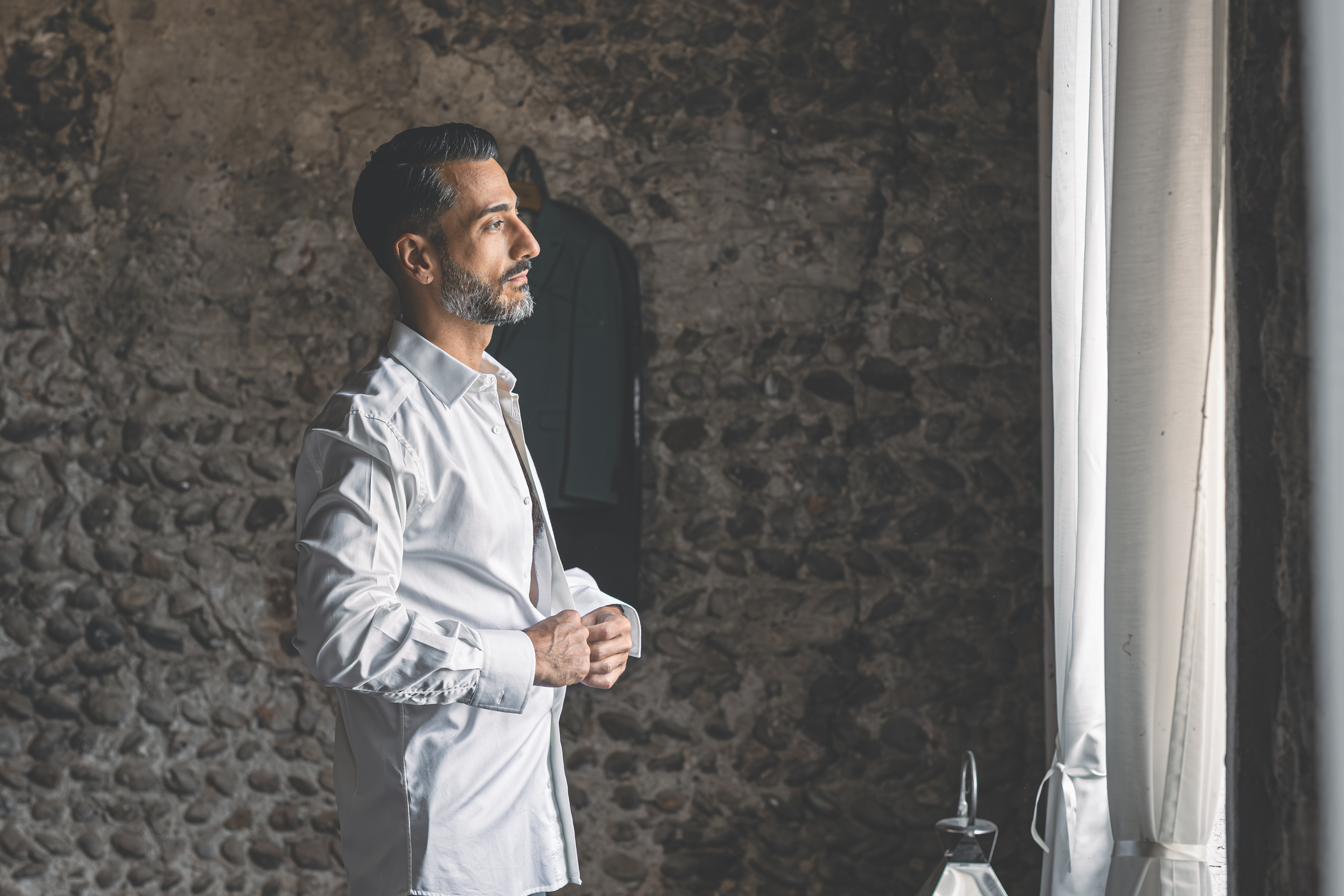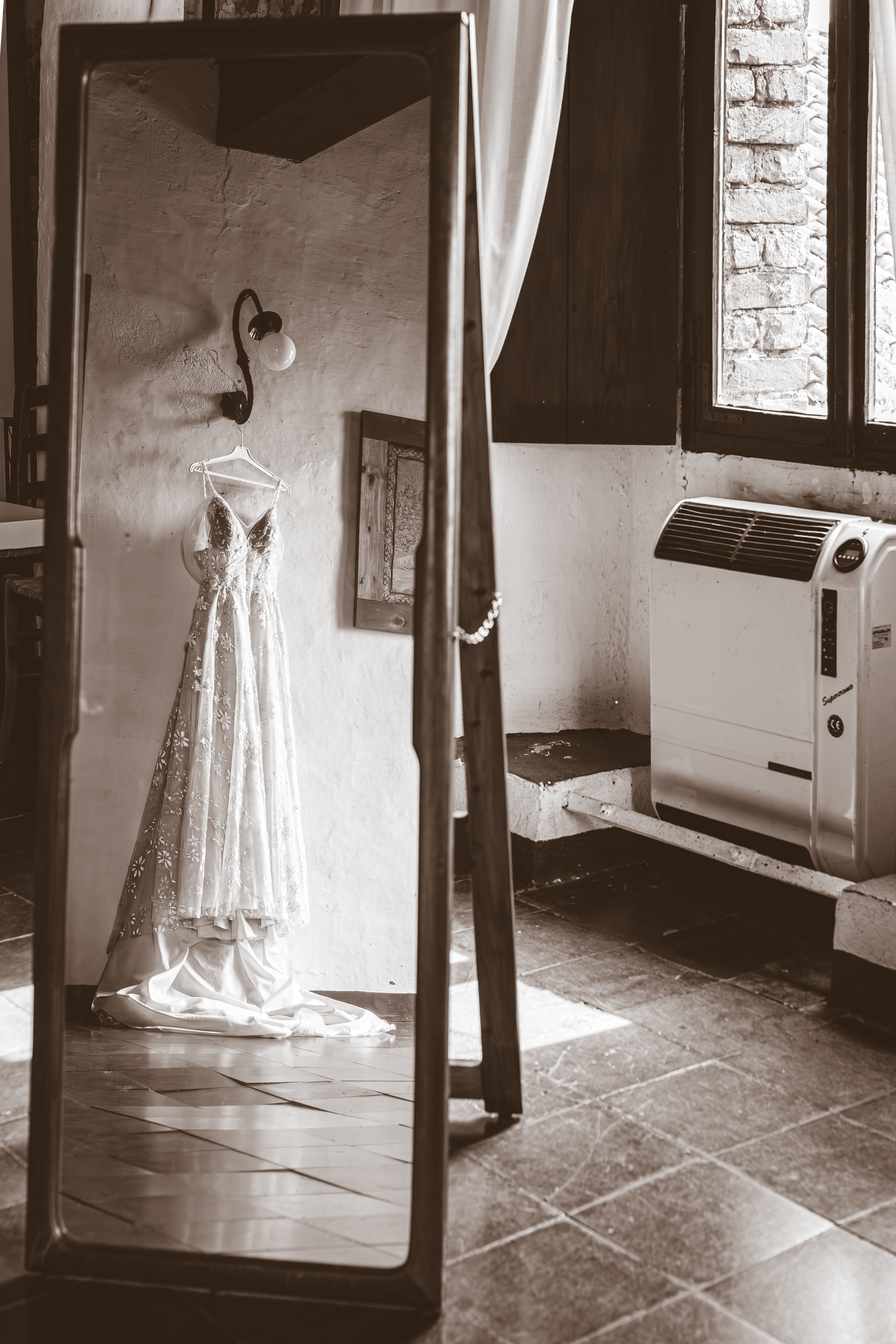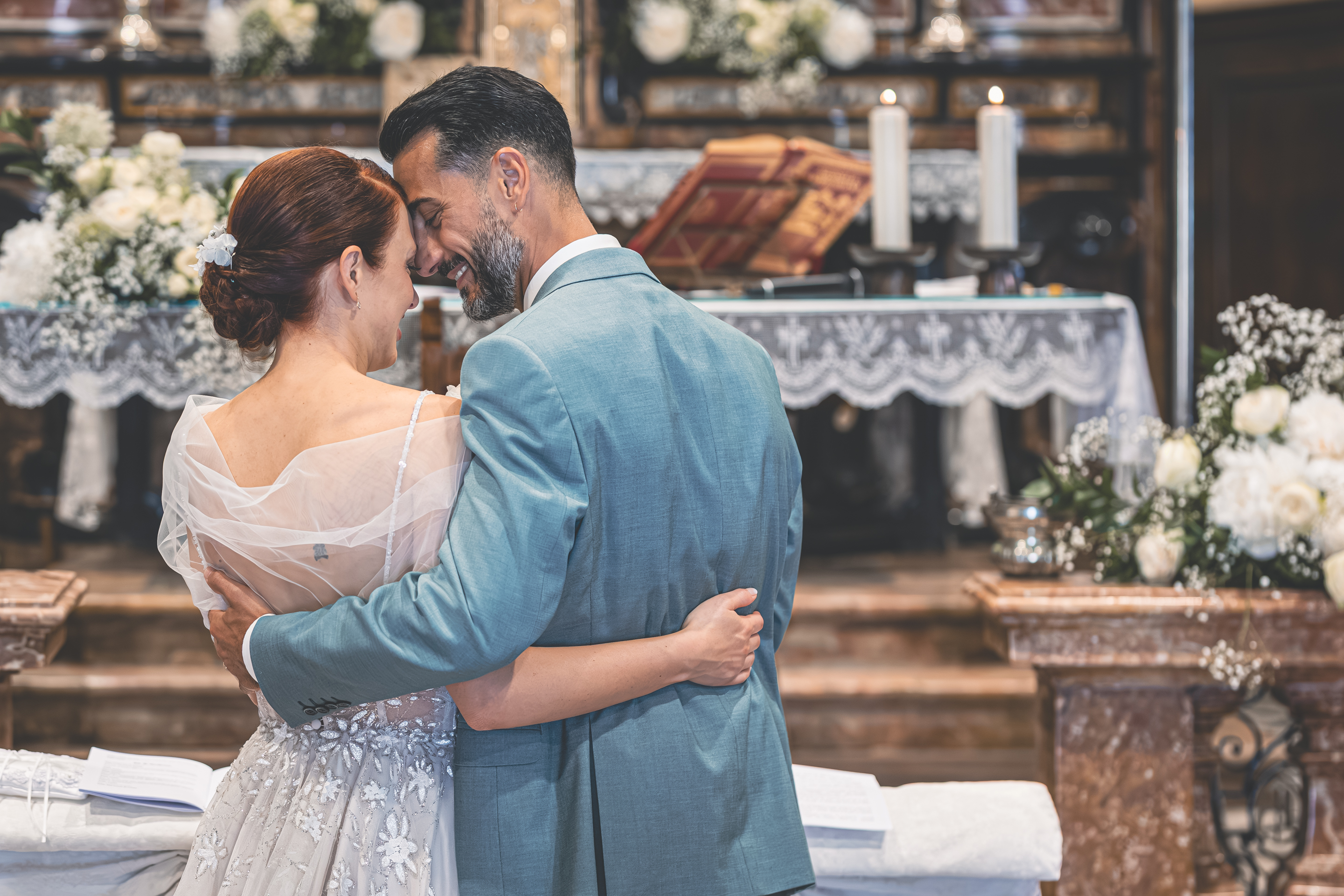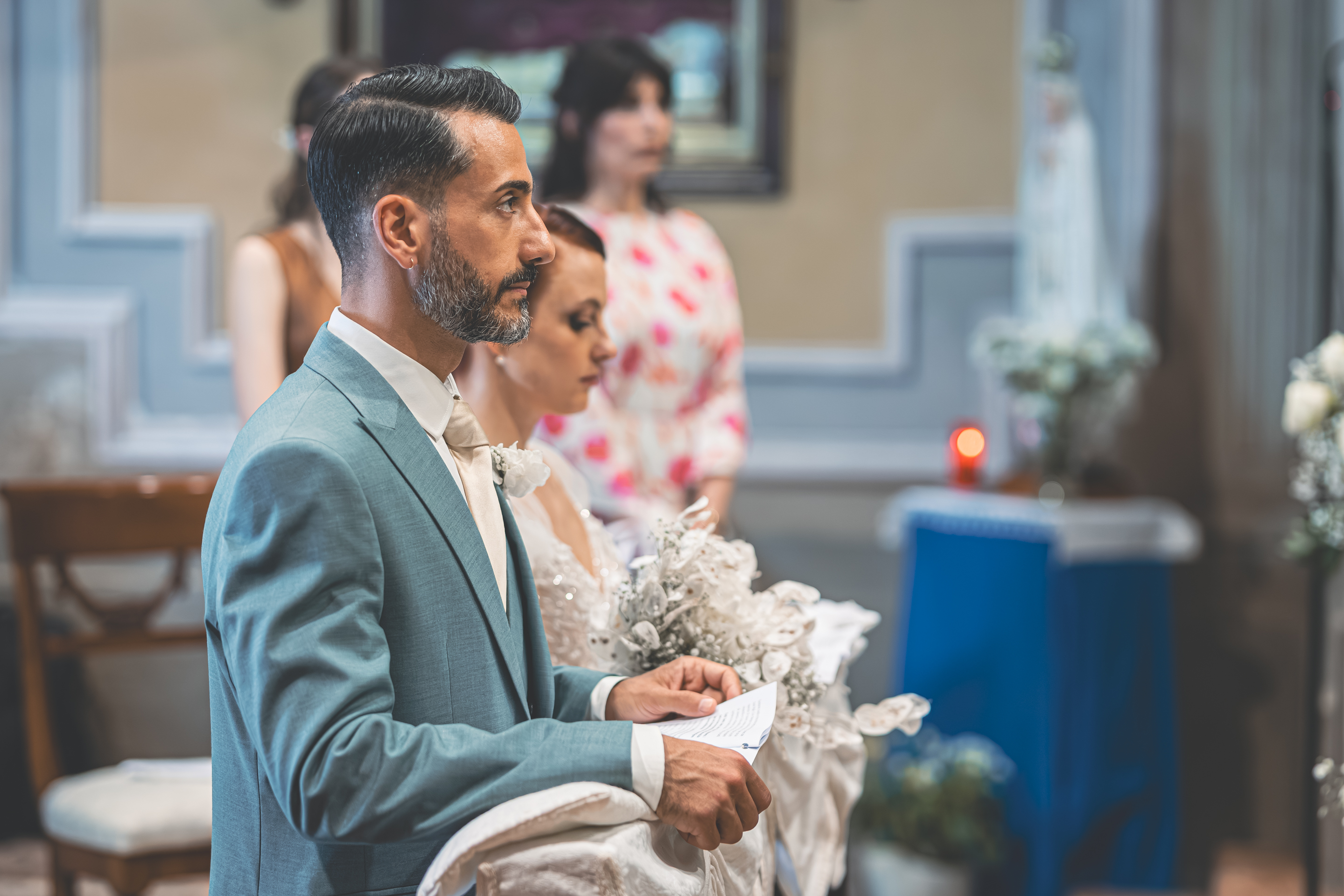 La giornata inizia tra le mura del castello, dove entrambi gli sposi si preparano. Raggiungo per primo Flavio, circondato dall’affetto della sua famiglia al completo. L’atmosfera è intima e piena di significato: piccoli regali, sguardi complici, e parole sussurrate che sigillano l’emozione della vestizione. L’abito è firmato Davino Sposo, la camicia realizzata da Veri Sarti. Poco dopo, salgo da Martina. Silvia Baini è all’opera con trucco e pettinatura, mentre mamma e sorella aiutano la sposa a indossare l’abito. Anche qui, il tempo si sospende: il papà che aspetta con gli occhi lucidi, le testimoni che ricevono pensieri e regali, il bouquet firmato Il Giardino del Re che completa l’incanto.
