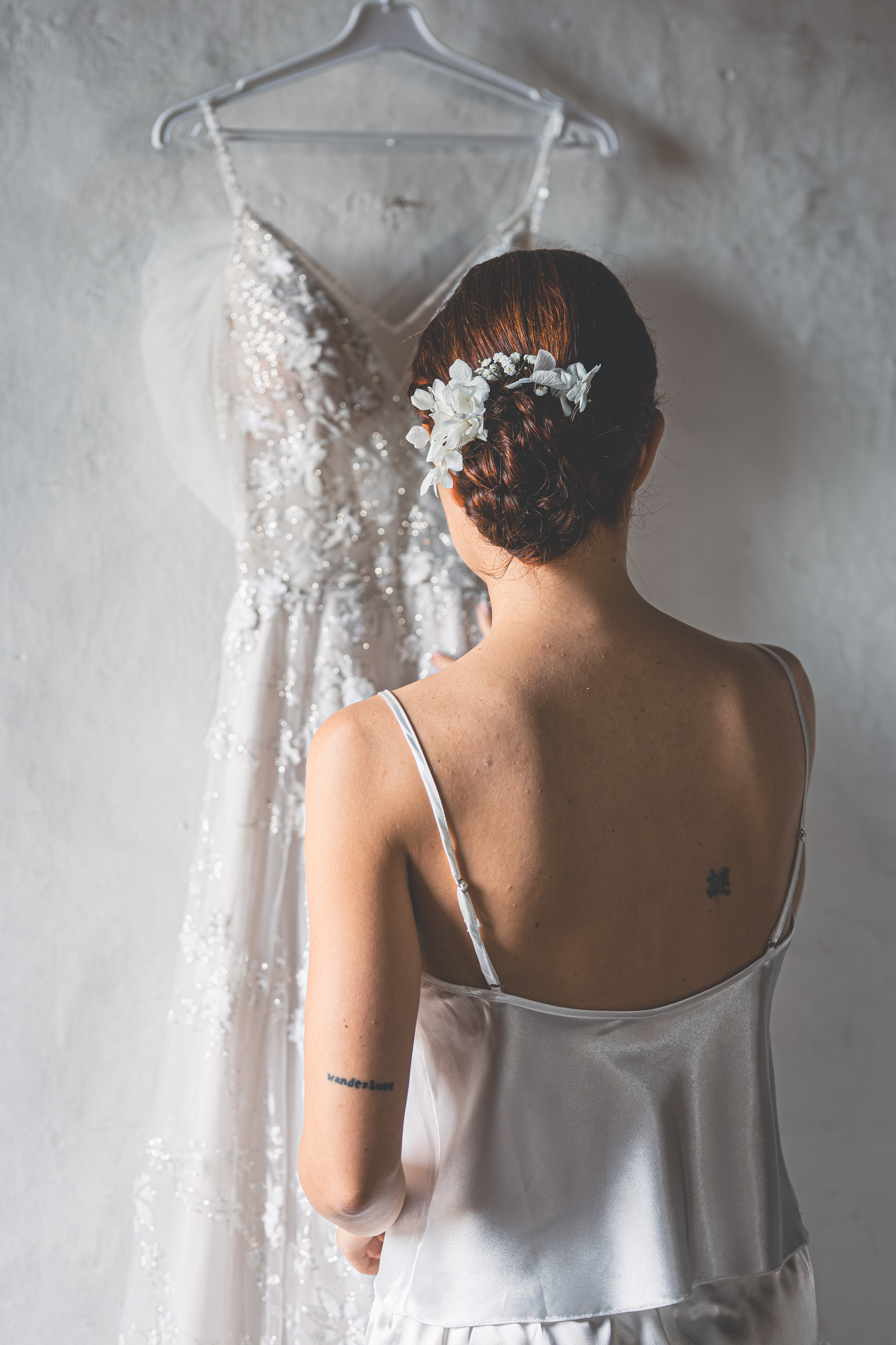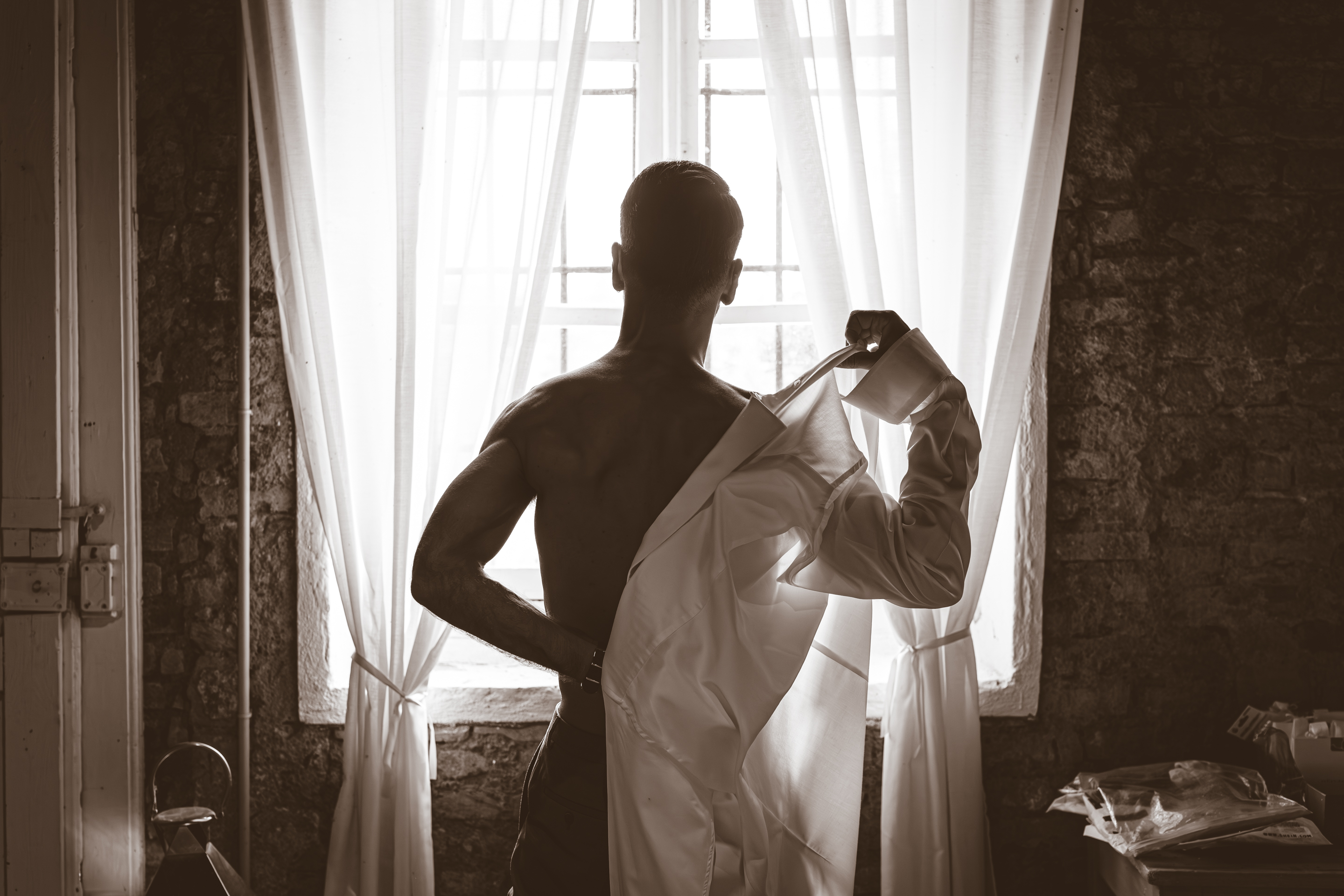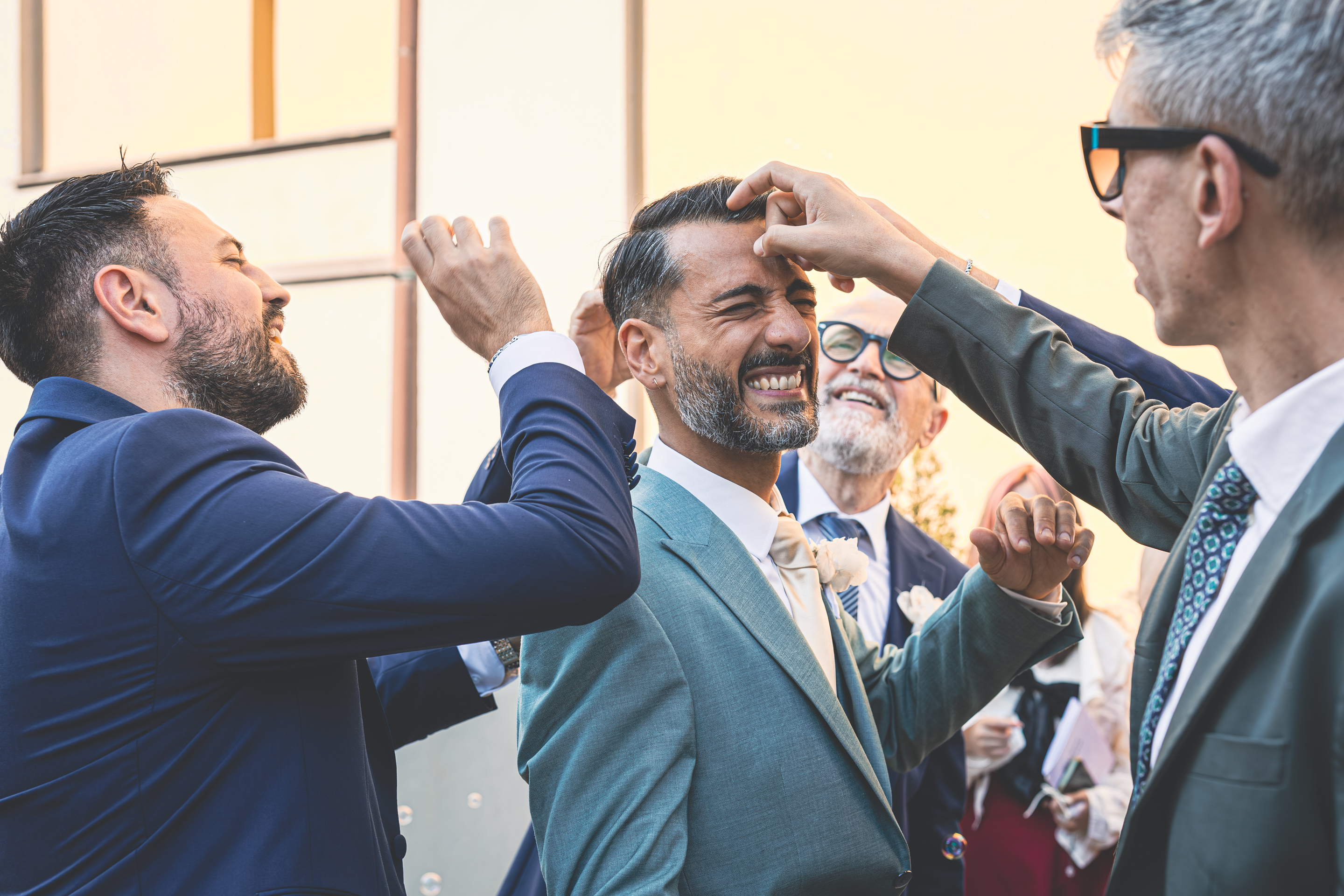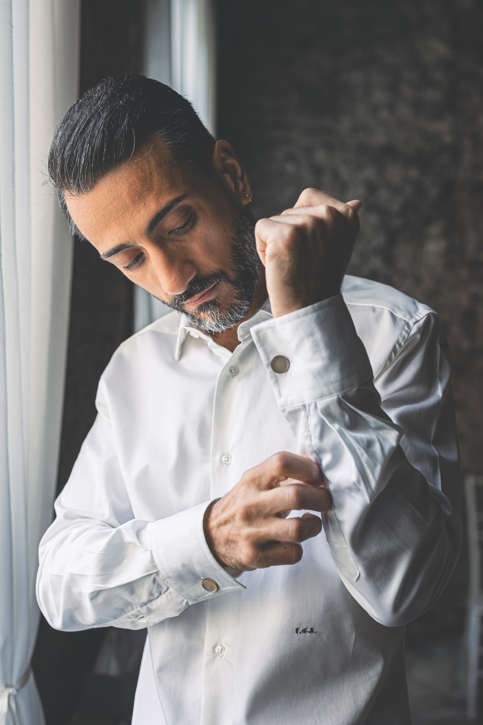 La giornata inizia tra le mura del castello, dove entrambi gli sposi si preparano. Raggiungo per primo Flavio, circondato dall’affetto della sua famiglia al completo. L’atmosfera è intima e piena di significato: piccoli regali, sguardi complici, e parole sussurrate che sigillano l’emozione della vestizione. L’abito è firmato Davino Sposo, la camicia realizzata da Veri Sarti. Poco dopo, salgo da Martina. Silvia Baini è all’opera con trucco e pettinatura, mentre mamma e sorella aiutano la sposa a indossare l’abito. Anche qui, il tempo si sospende: il papà che aspetta con gli occhi lucidi, le testimoni che ricevono pensieri e regali, il bouquet firmato Il Giardino del Re che completa l’incanto.