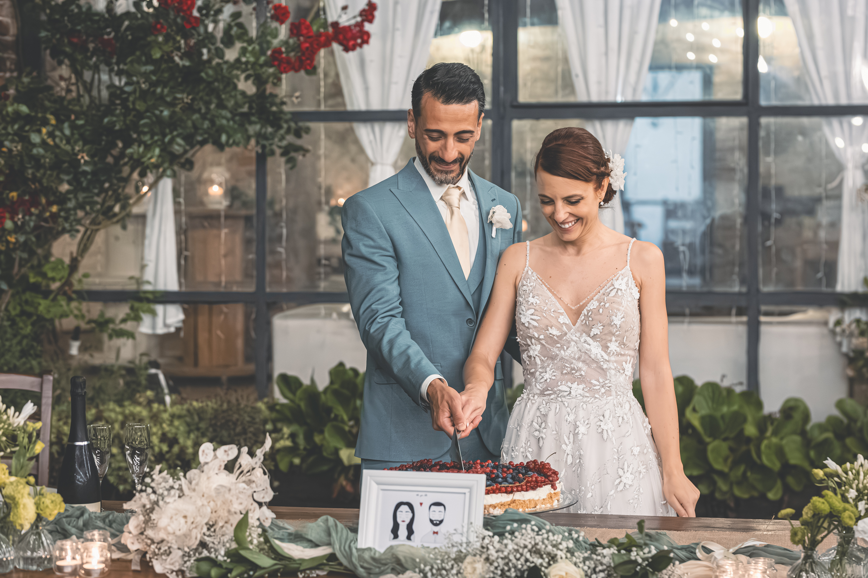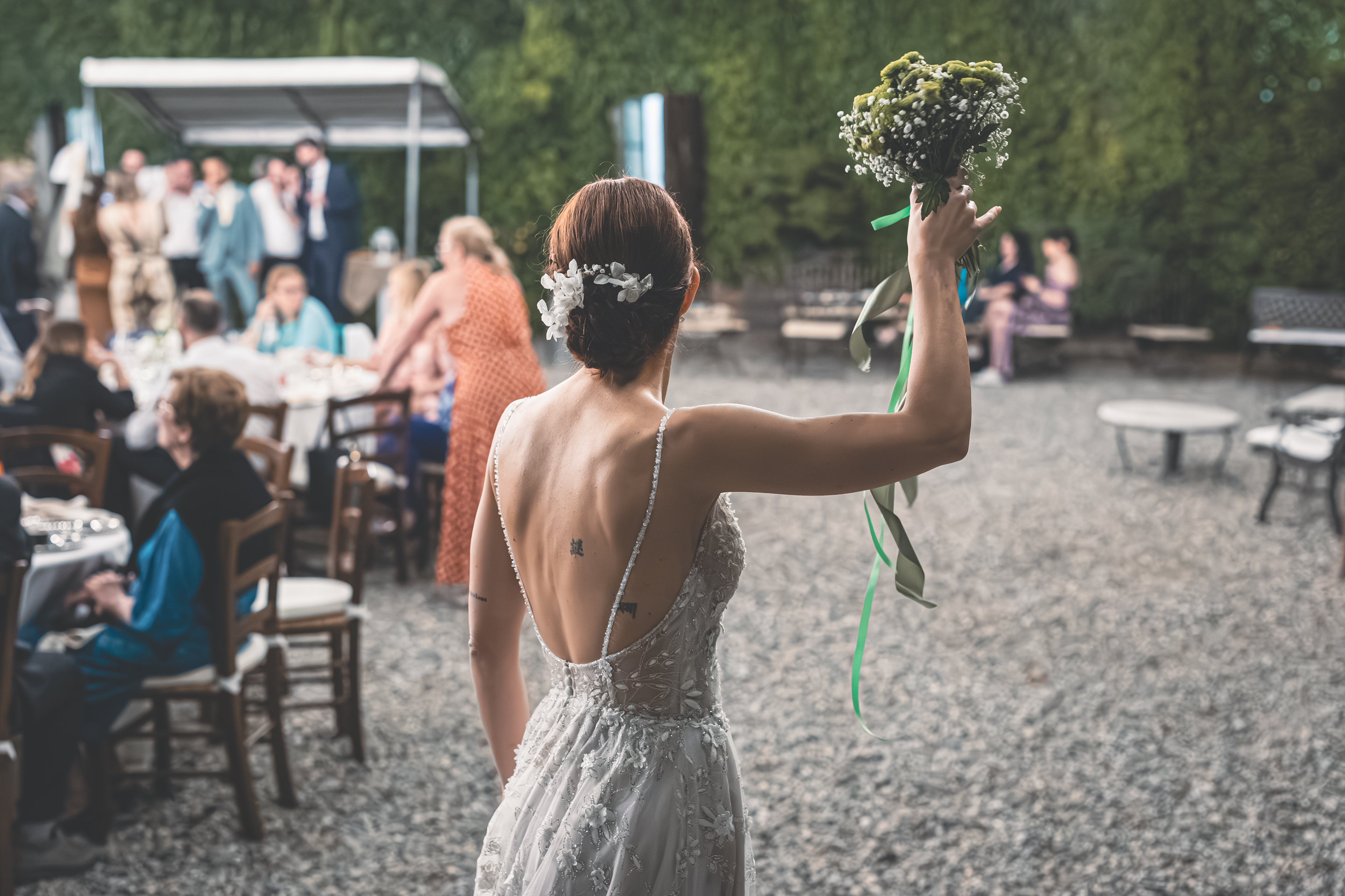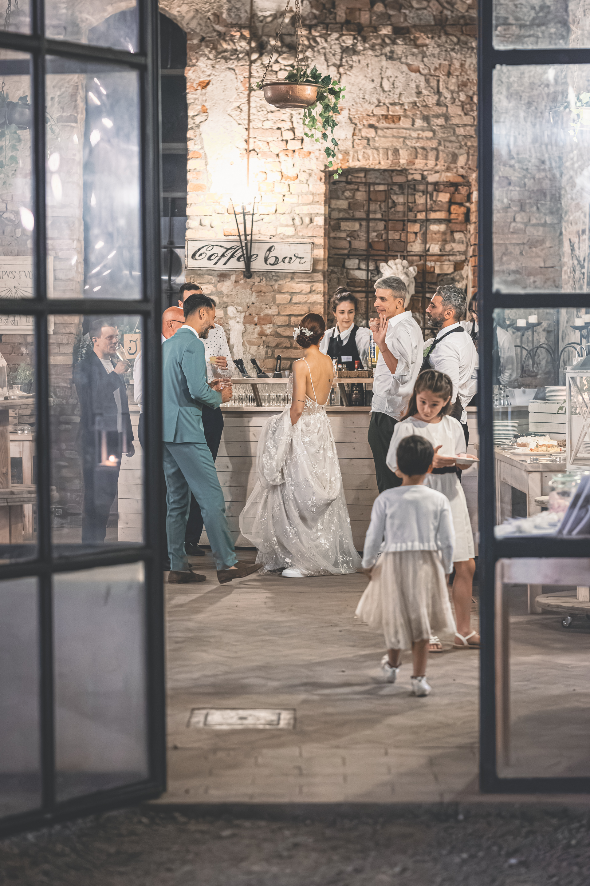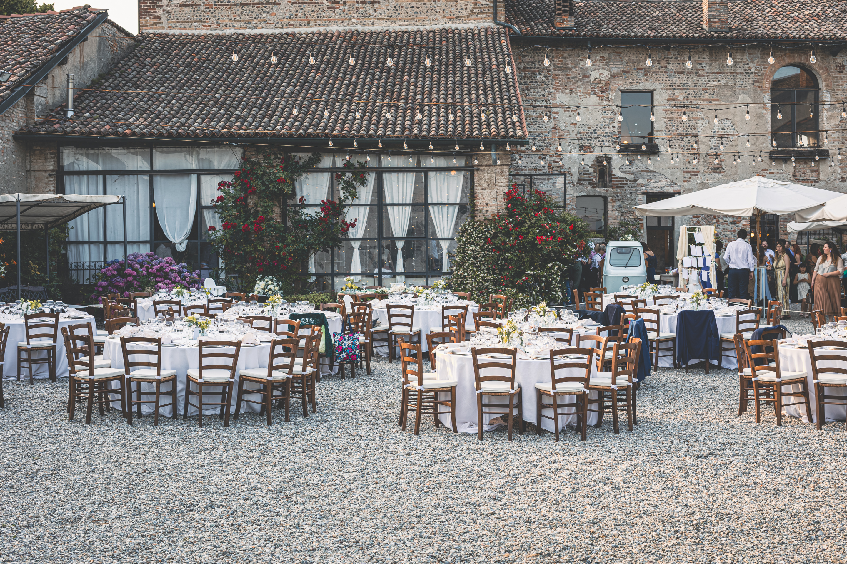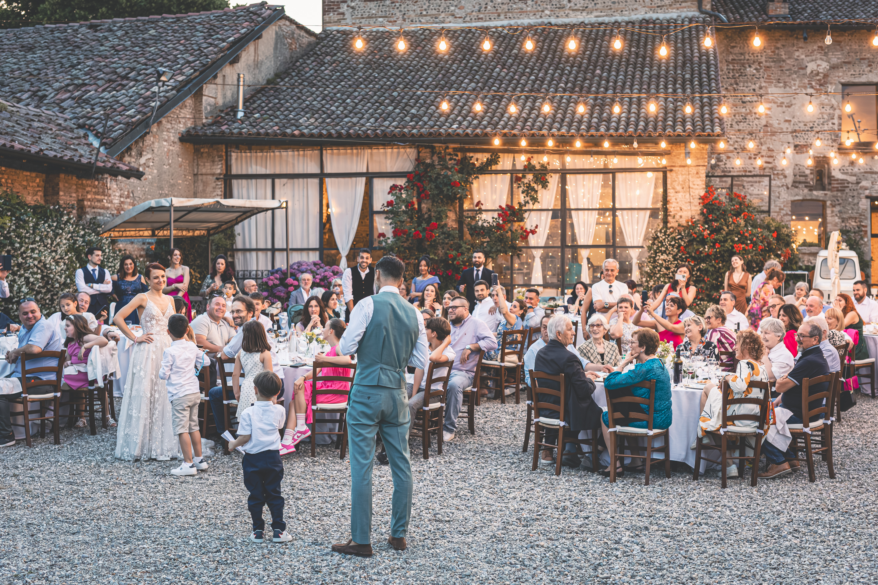 Ci spostiamo nella piccola Chiesa della frazione per un rito intimo e molto partecipato, carico di emozione e presenza vera. All’uscita, una pioggia di baci e abbracci accoglie gli sposi prima di tornare a piedi verso il Castello, dove ad attenderli c’è l’aperitivo curato nei dettagli da Top Parties. Il pomeriggio scorre tra brindisi, sorrisi e la musica elegante del duo Sweet & Sour. La cena si svolge all’aperto, sotto un cielo punteggiato di luci all’italiana, mentre la sera regala il suo momento più speciale: ogni tavolo riceve una torta da tagliare insieme a Martina e Flavio, un gesto pensato dalla sposa per trasformare il taglio della torta in un vero rito collettivo di condivisione. Poi il lancio del bouquet, e infine via ai balli, con Martina che finalmente si lascia andare, libera e felice, a vivere la sua anima festaiola fino a notte inoltrata. Un matrimonio pieno di cuore, calore e cura. Un racconto che rimane.
