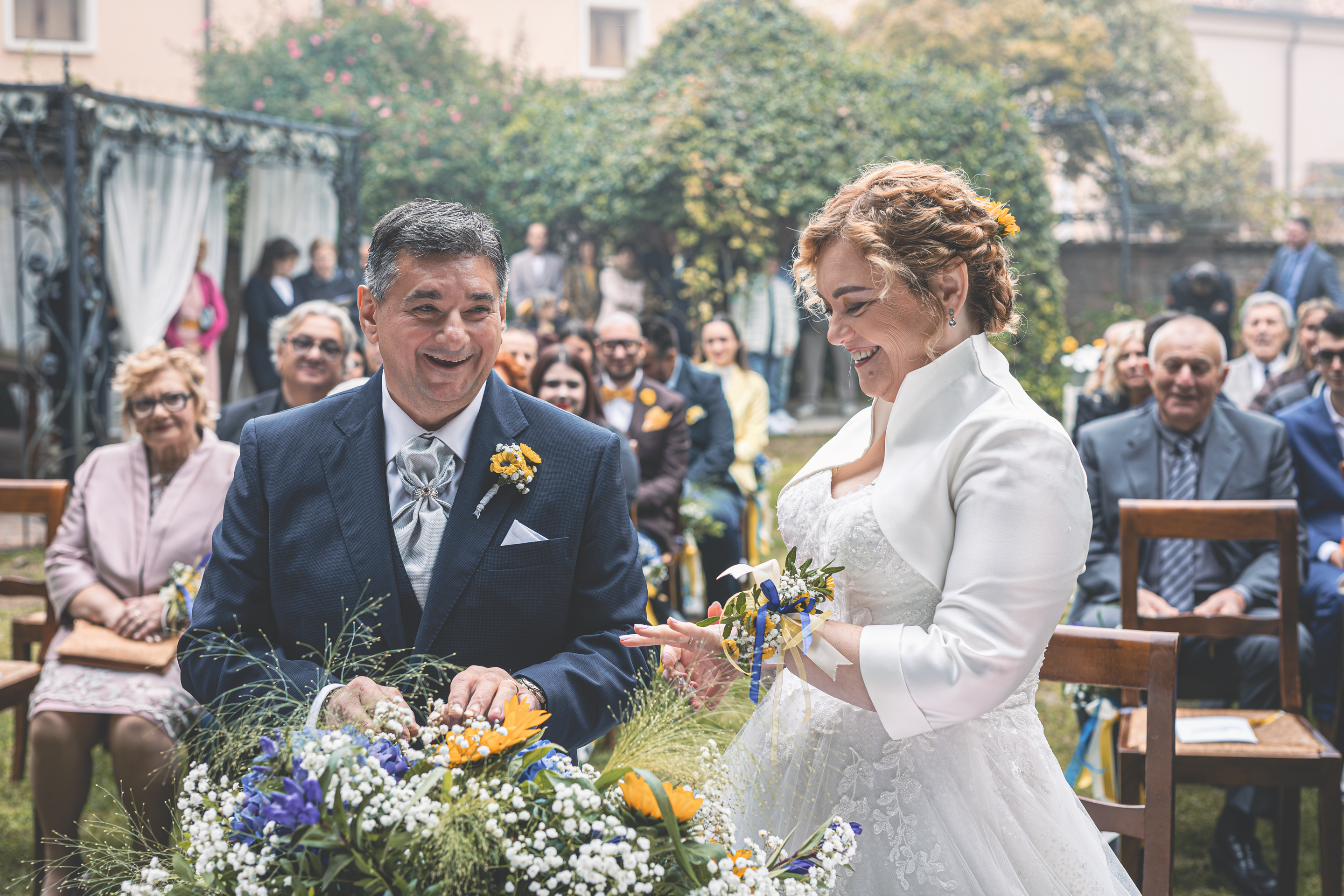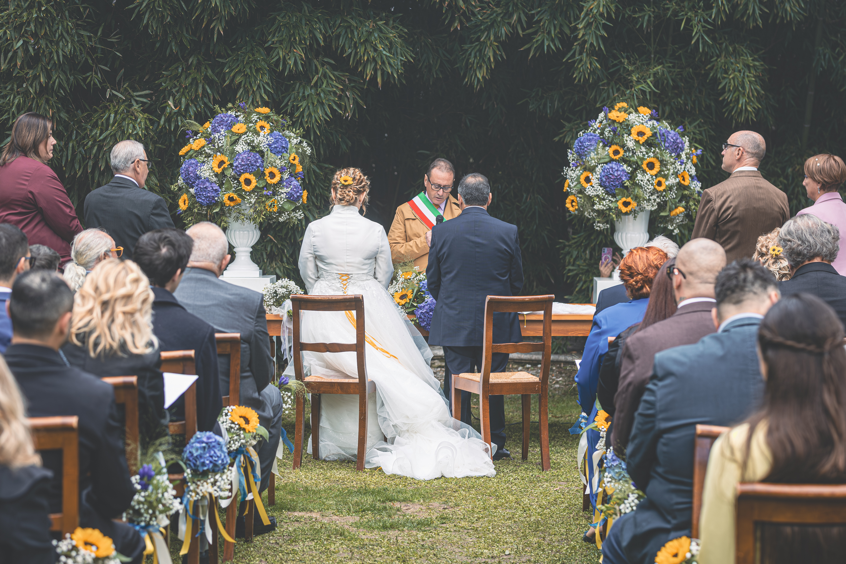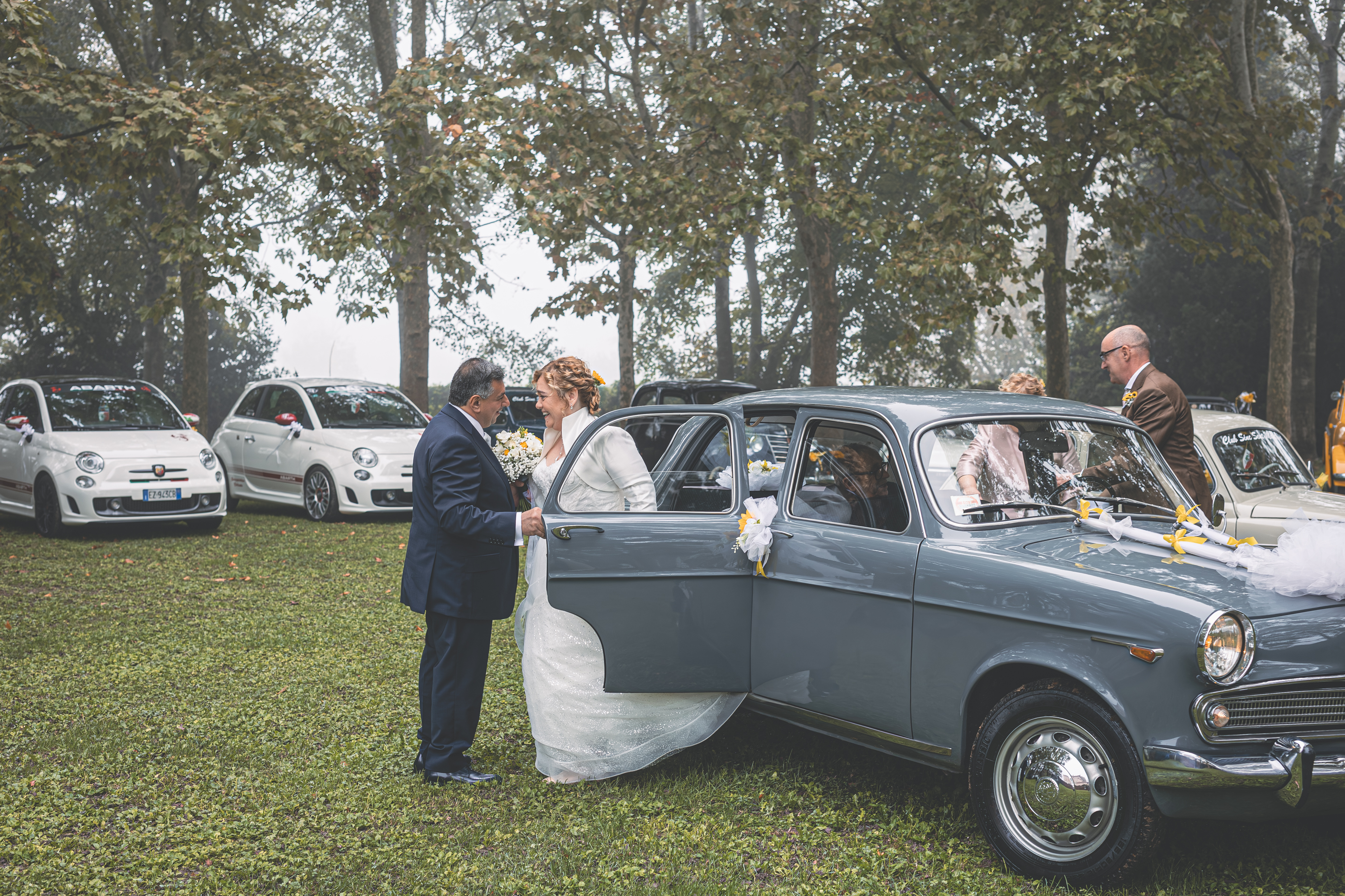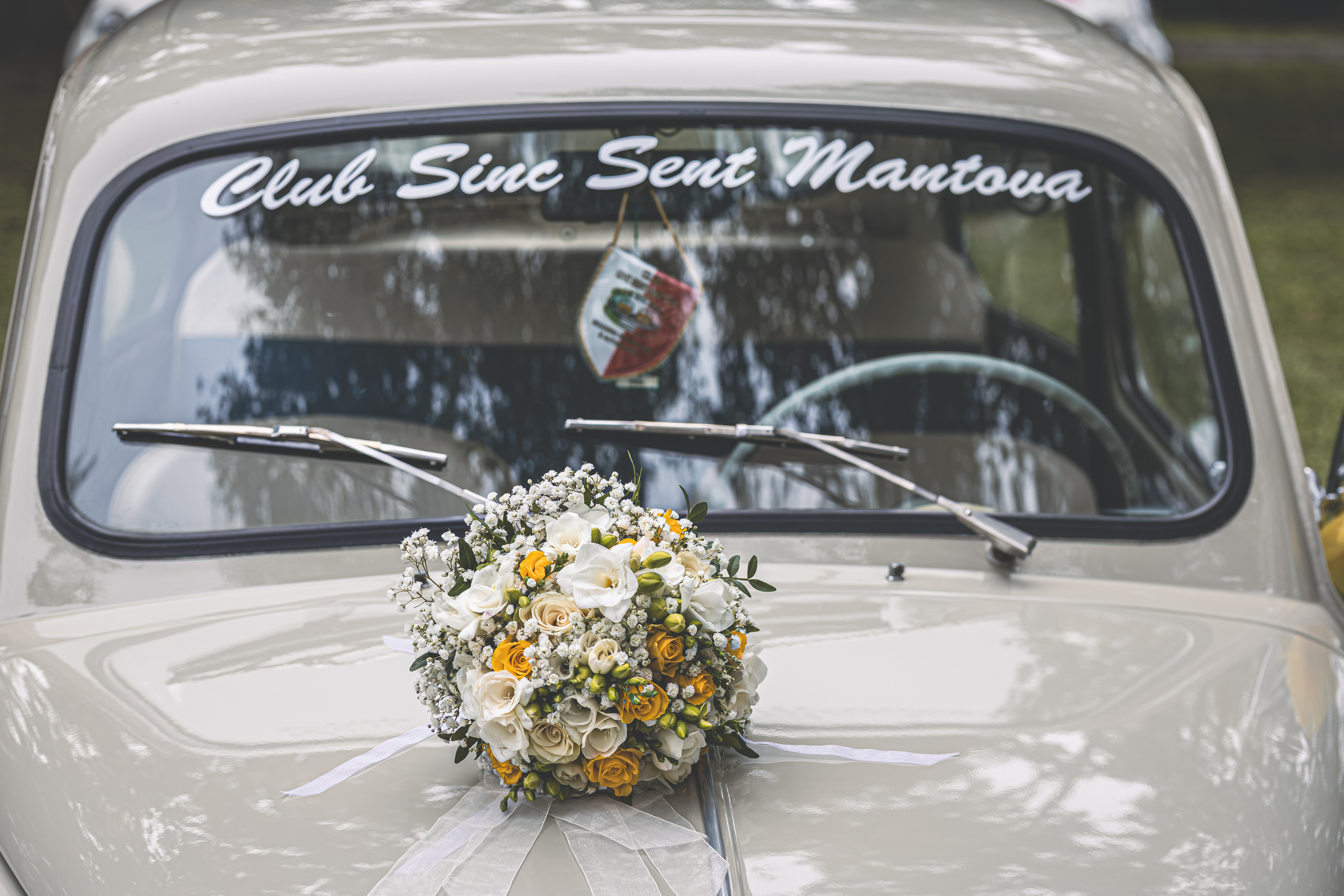 Per la cerimonia ci spostiamo a Villa Cavriani, dove ad accogliere gli Sposi troviamo una scenografia davvero particolare: gli amici del Club Sinc-Sent di Mantova hanno disposto le loro auto a semicerchio nel parco della Villa, creando un ingresso davvero suggestivo. Sposo e Sposa arrivano al centro della scena a bordo di due splendide auto d’epoca, accolti dall’entusiasmo degli invitati. Il rito si svolge nel giardino, in un clima sentito e partecipato, con l’allestimento floreale curato da LB Fiori.