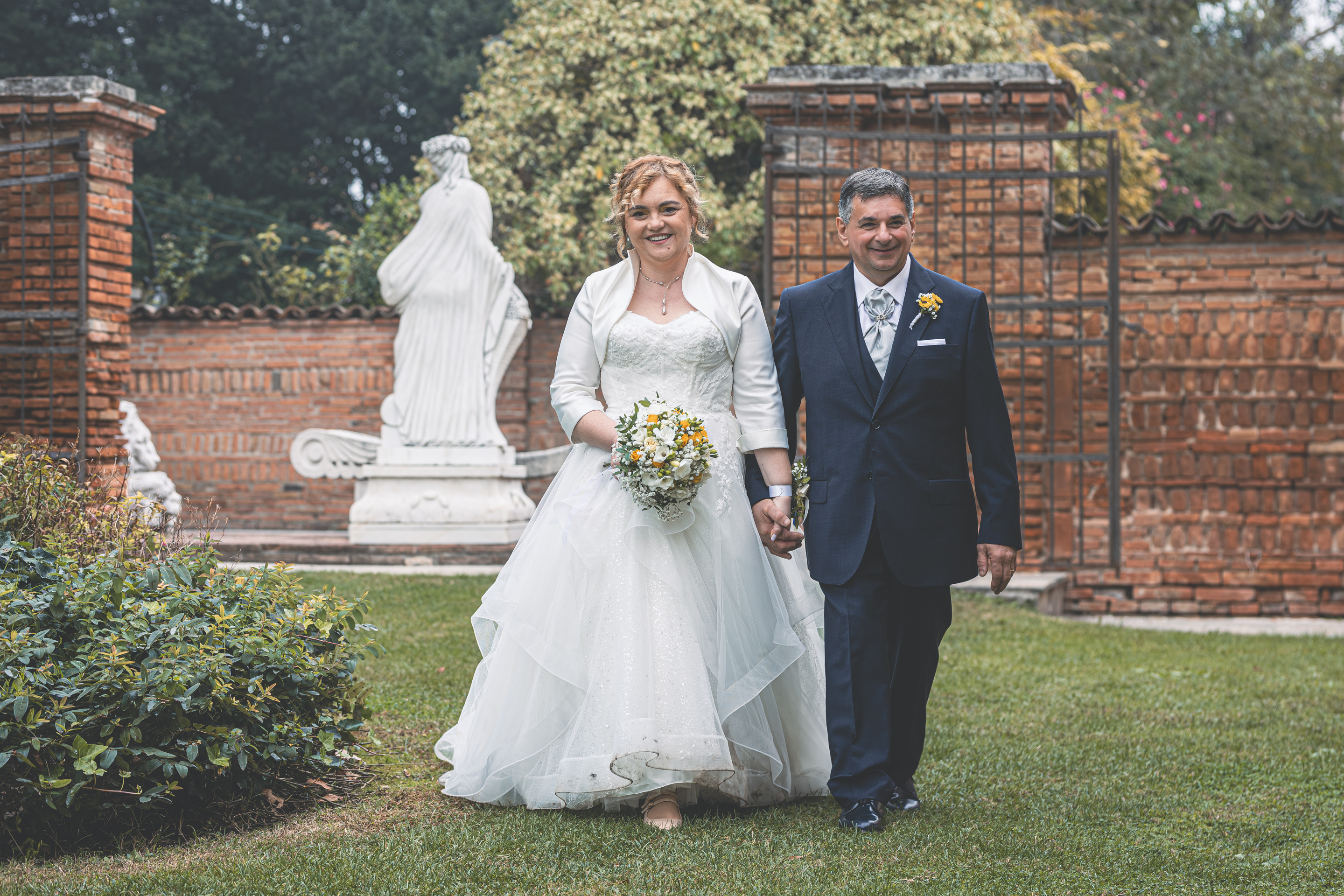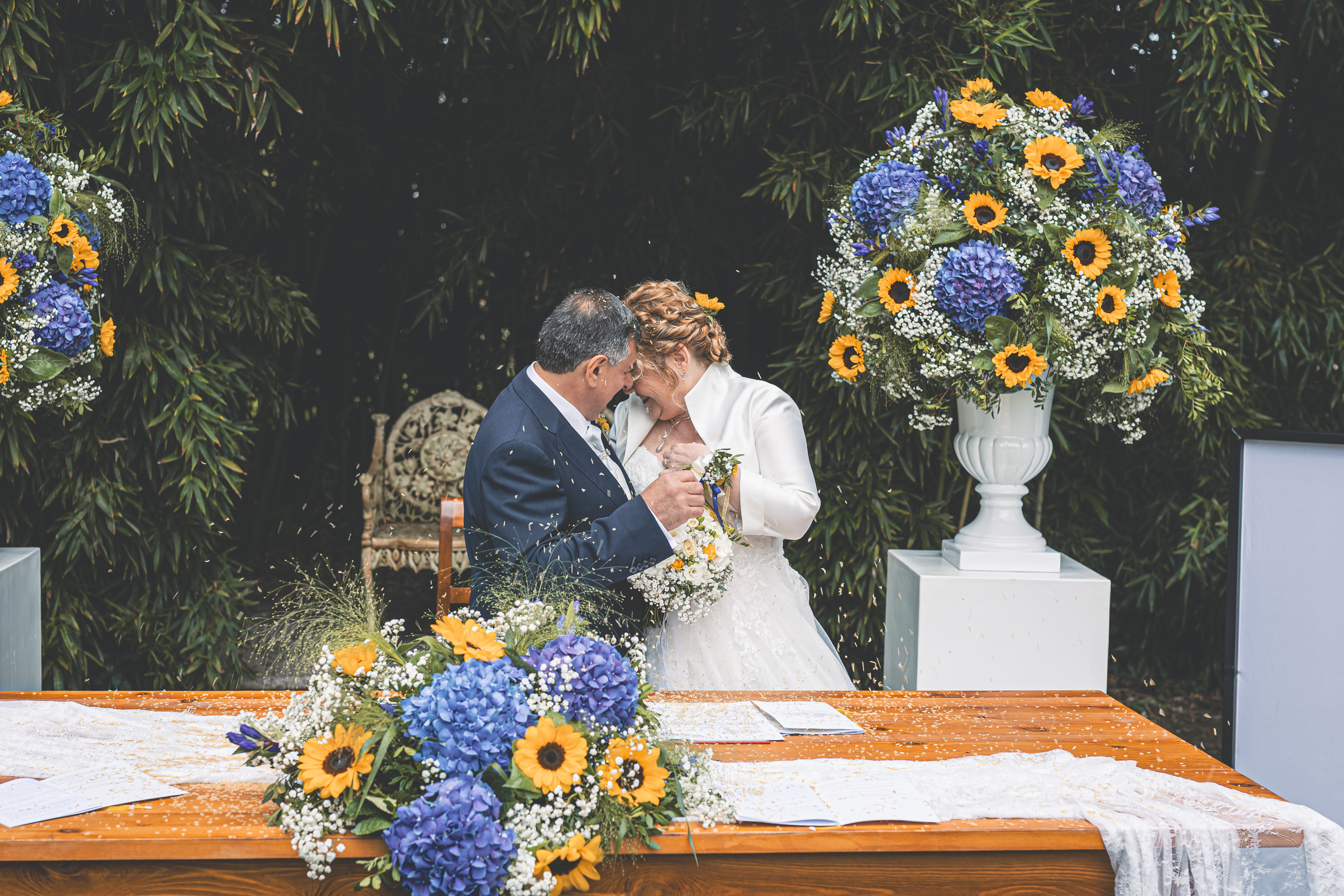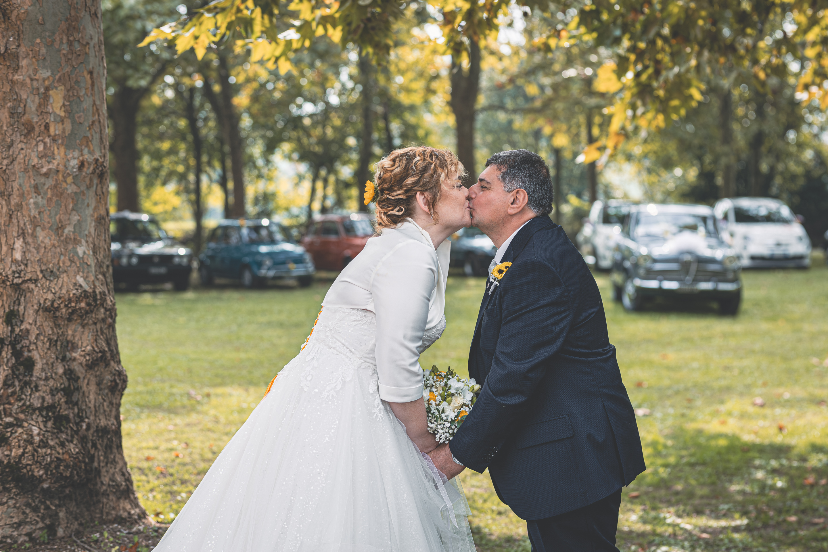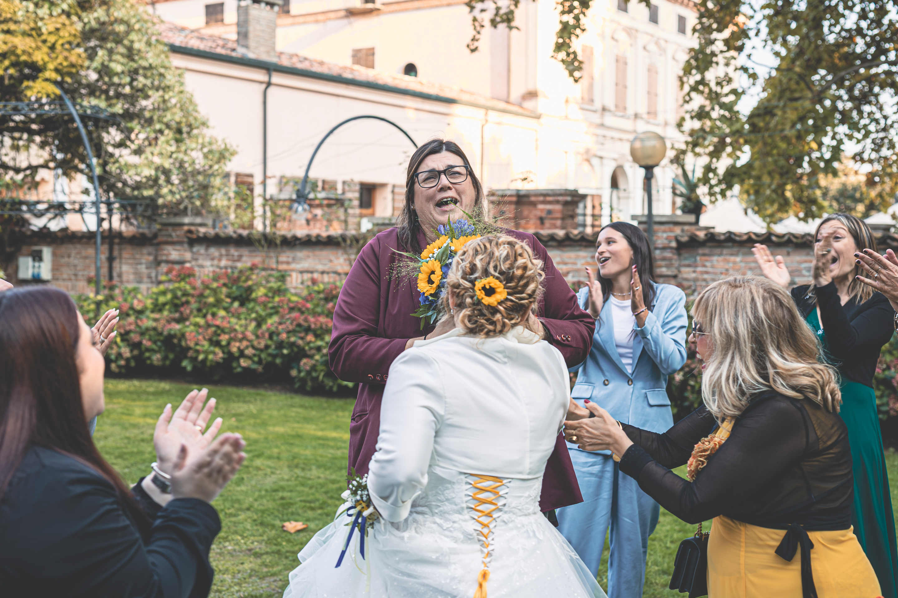 Per la cerimonia ci spostiamo a Villa Cavriani, dove ad accogliere gli Sposi troviamo una scenografia davvero particolare: gli amici del Club Sinc-Sent di Mantova hanno disposto le loro auto a semicerchio nel parco della Villa, creando un ingresso davvero suggestivo. Sposo e Sposa arrivano al centro della scena a bordo di due splendide auto d’epoca, accolti dall’entusiasmo degli invitati. Il rito si svolge nel giardino, in un clima sentito e partecipato, con l’allestimento floreale curato da LB Fiori.