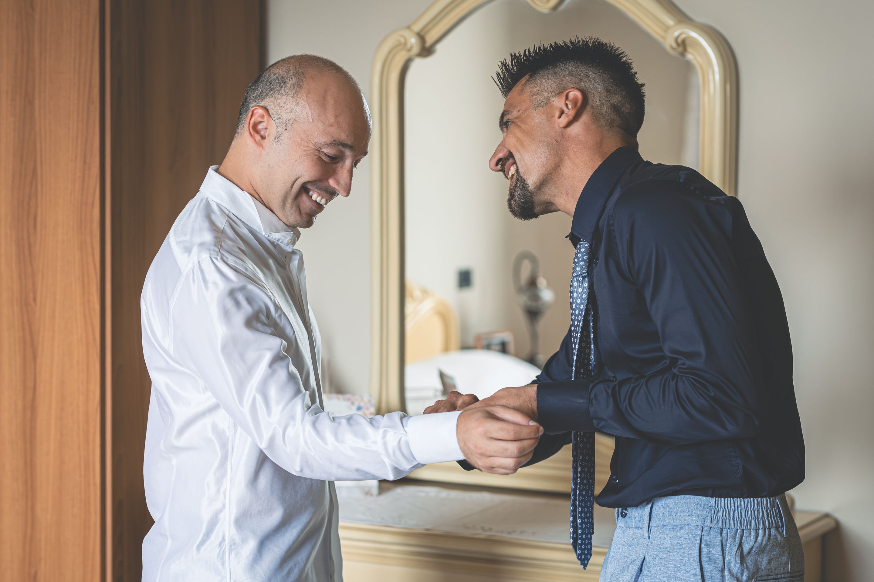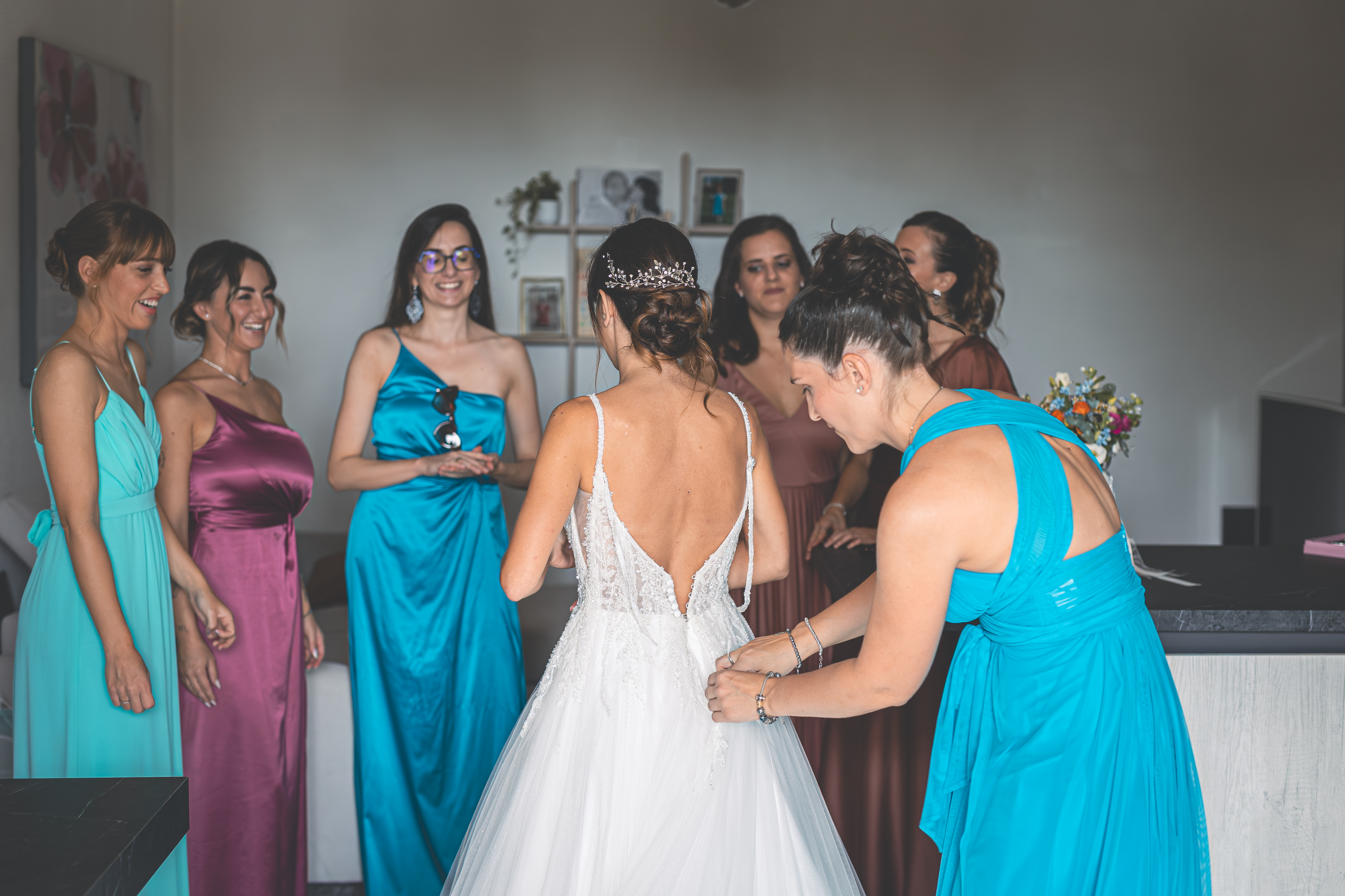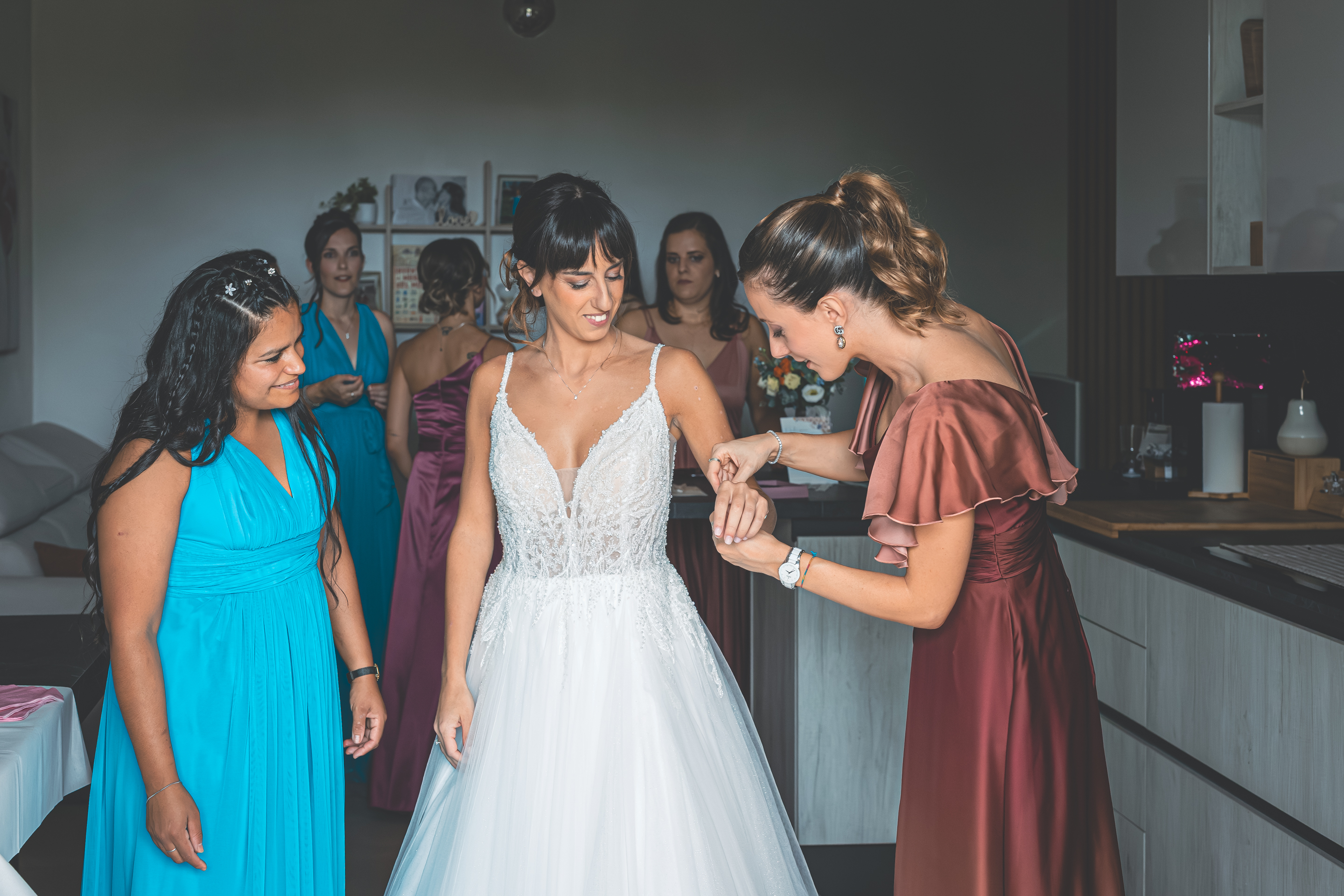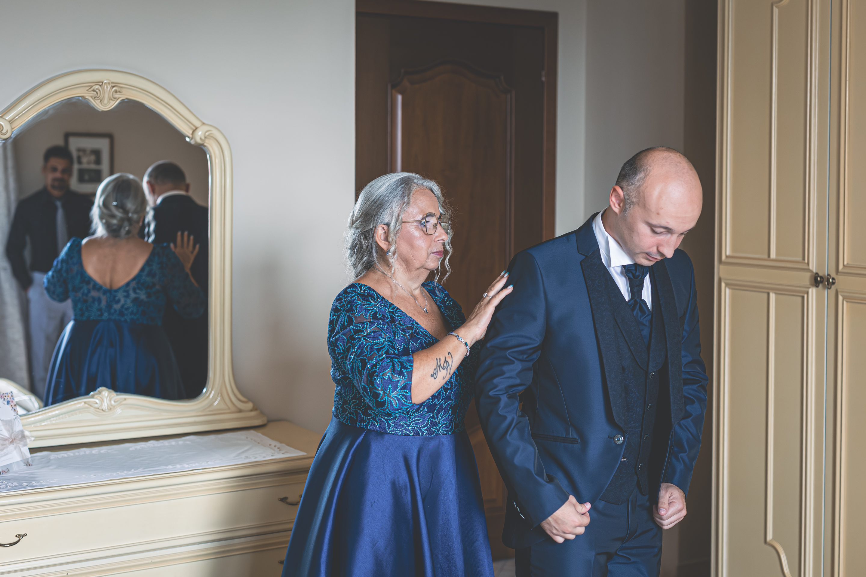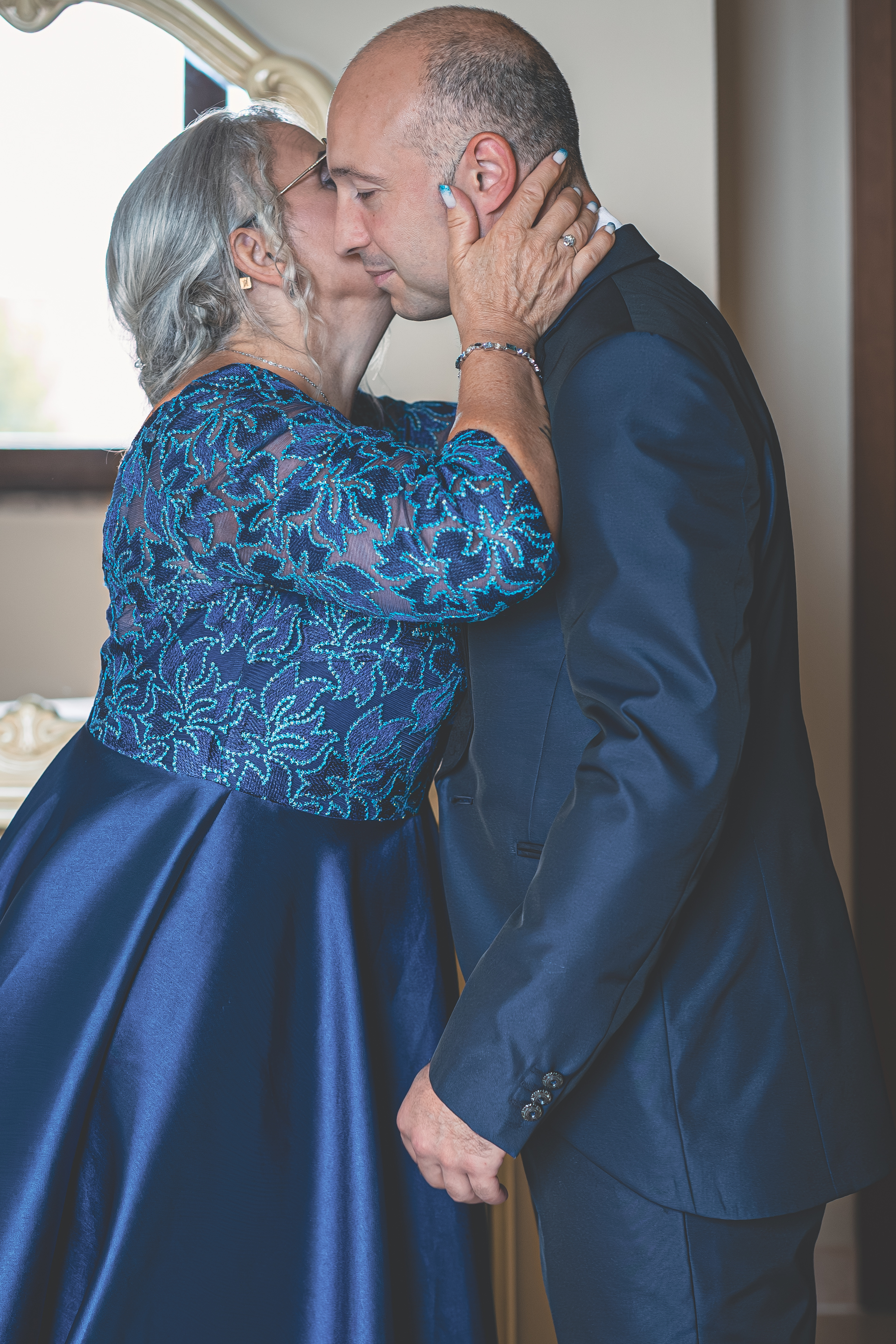 Secondo matrimonio di un intenso weekend di metà settembre, ma questa volta gioco in casa: Patrizia e Franco sono due ragazzi del mio paese, Castellucchio. Insieme a me, per il racconto video della giornata, c’è Alessandro Spiga. Inizio la giornata a casa di Franco, dove lo sposo indossa l’abito firmato Kappa Di Sposi, aiutato dall’amico Alex e dalla mamma. L’atmosfera è raccolta ma giocosa, fatta di sorrisi e battute, prima di raggiungere gli invitati per la tavola bianca e il primo brindisi della giornata. Raggiungiamo poi Patrizia a casa degli sposi. È già pettinata da Acconciature Simona ed è pronta per il trucco curato da Martina Suppa. Con lei ci sono le amiche damigelle, che dopo un brindisi per sciogliere l’emozione la aiutano a indossare l’abito firmato Sposi Domani.