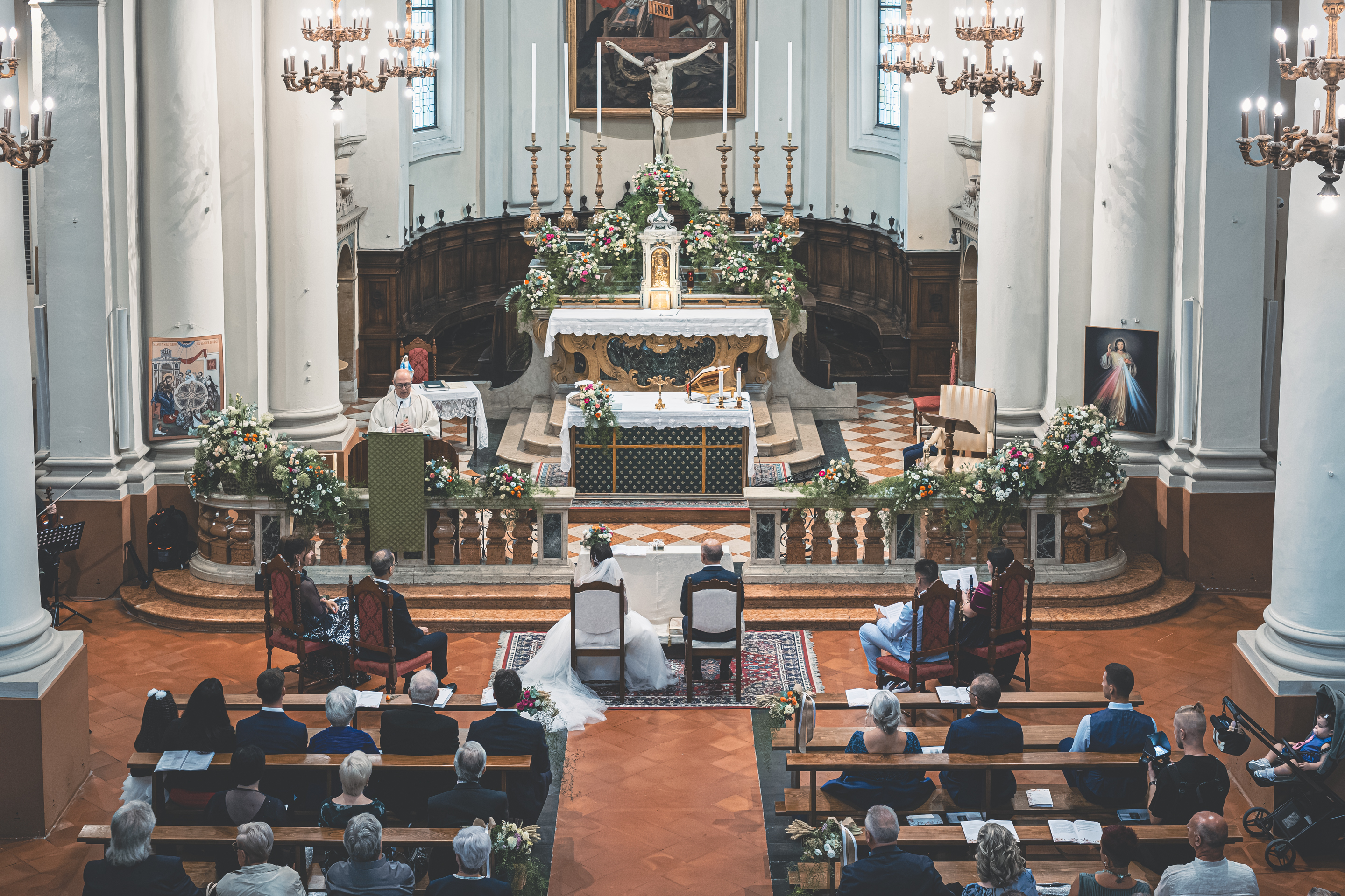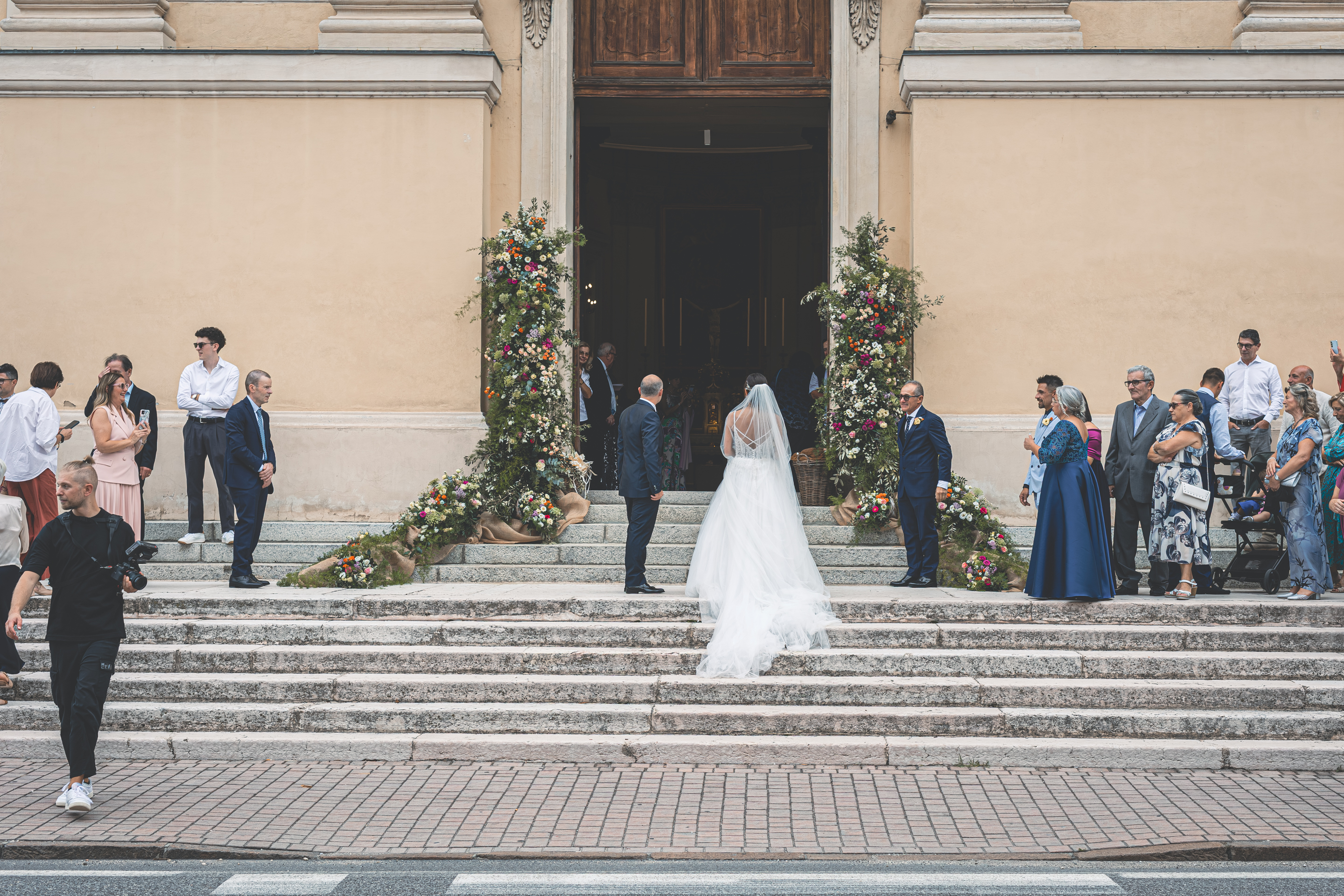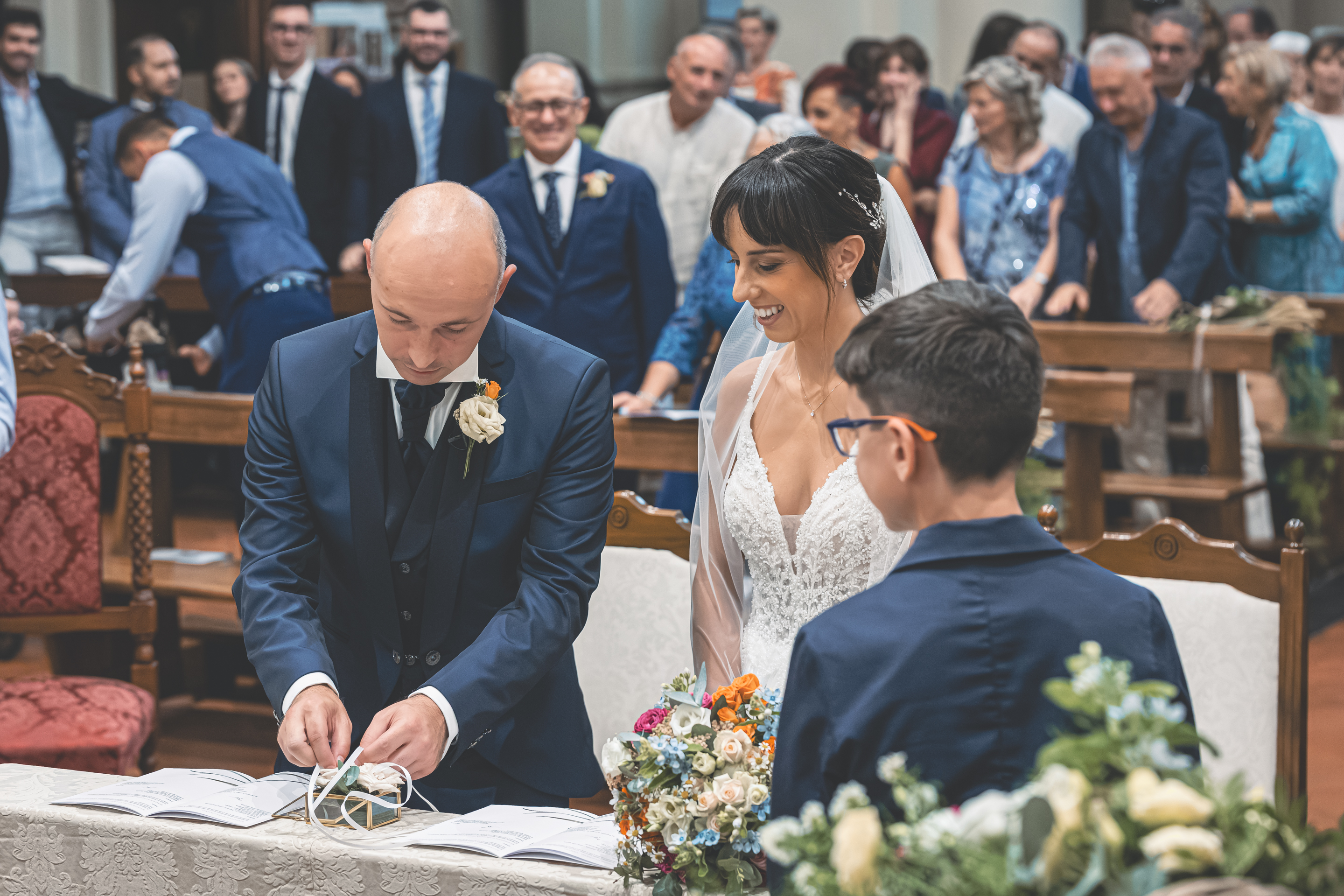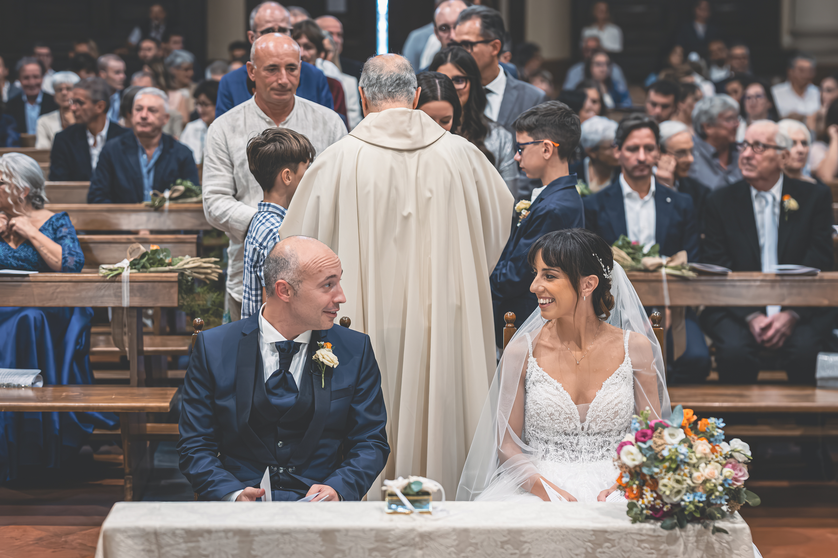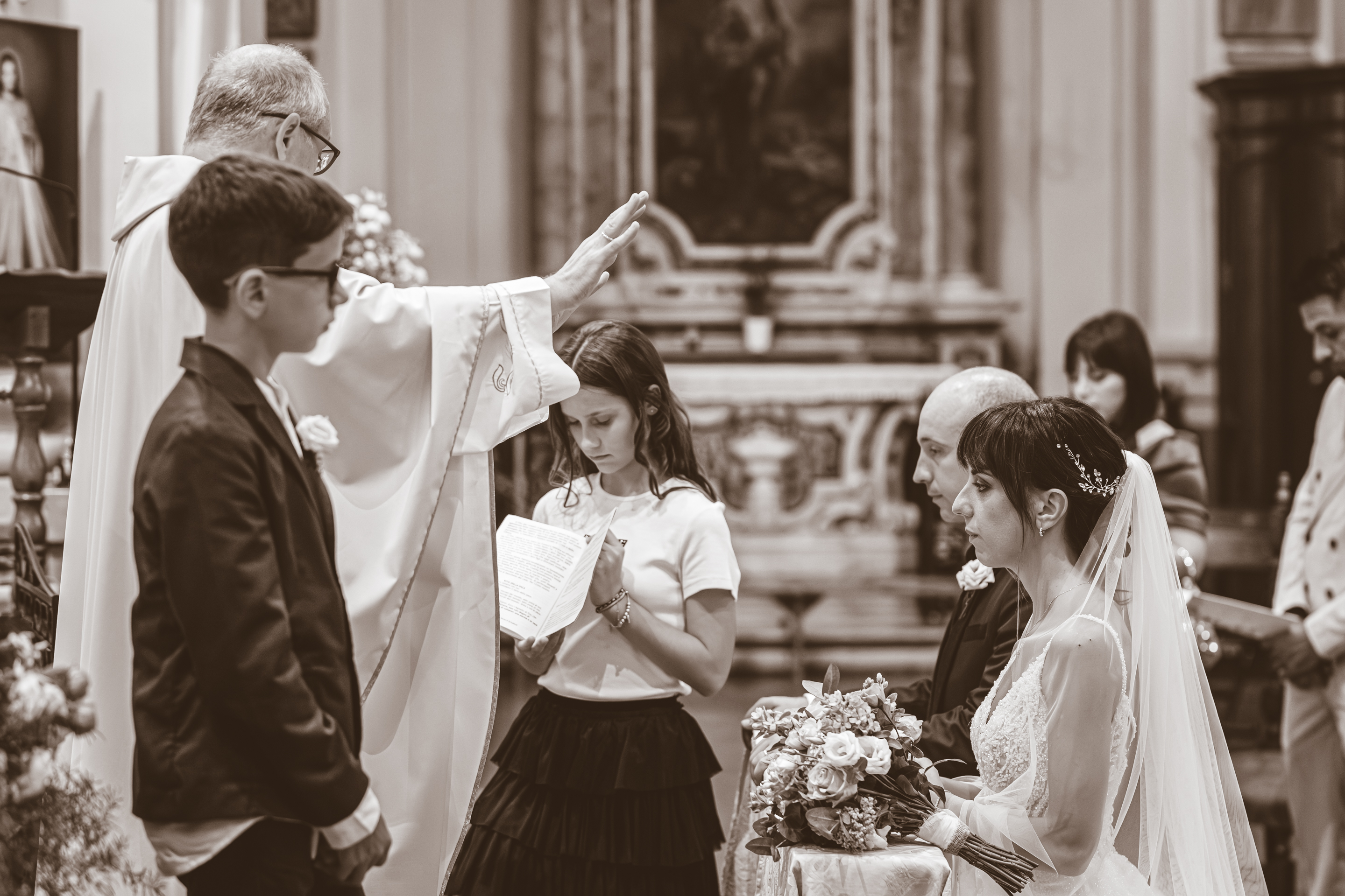 La cerimonia religiosa si svolge in paese, in una chiesa gremita e partecipe, impreziosita dagli allestimenti floreali di LB Fiori. All’uscita, baci, abbracci e la classica foto di gruppo sul sagrato. Prima di raggiungere gli invitati per l’aperitivo, ci fermiamo con gli Sposi a Villa Aurelia per un saluto alla nonna di Patrizia. Un momento delicato e sincero, che diventa anche occasione per qualche scatto di complicità nel parco. La festa prende vita poi al nostro arrivo all’Osteria di Cimbriolo, dove gli invitati hanno già iniziato a divertirsi tra buon cibo e la musica di DJonny.