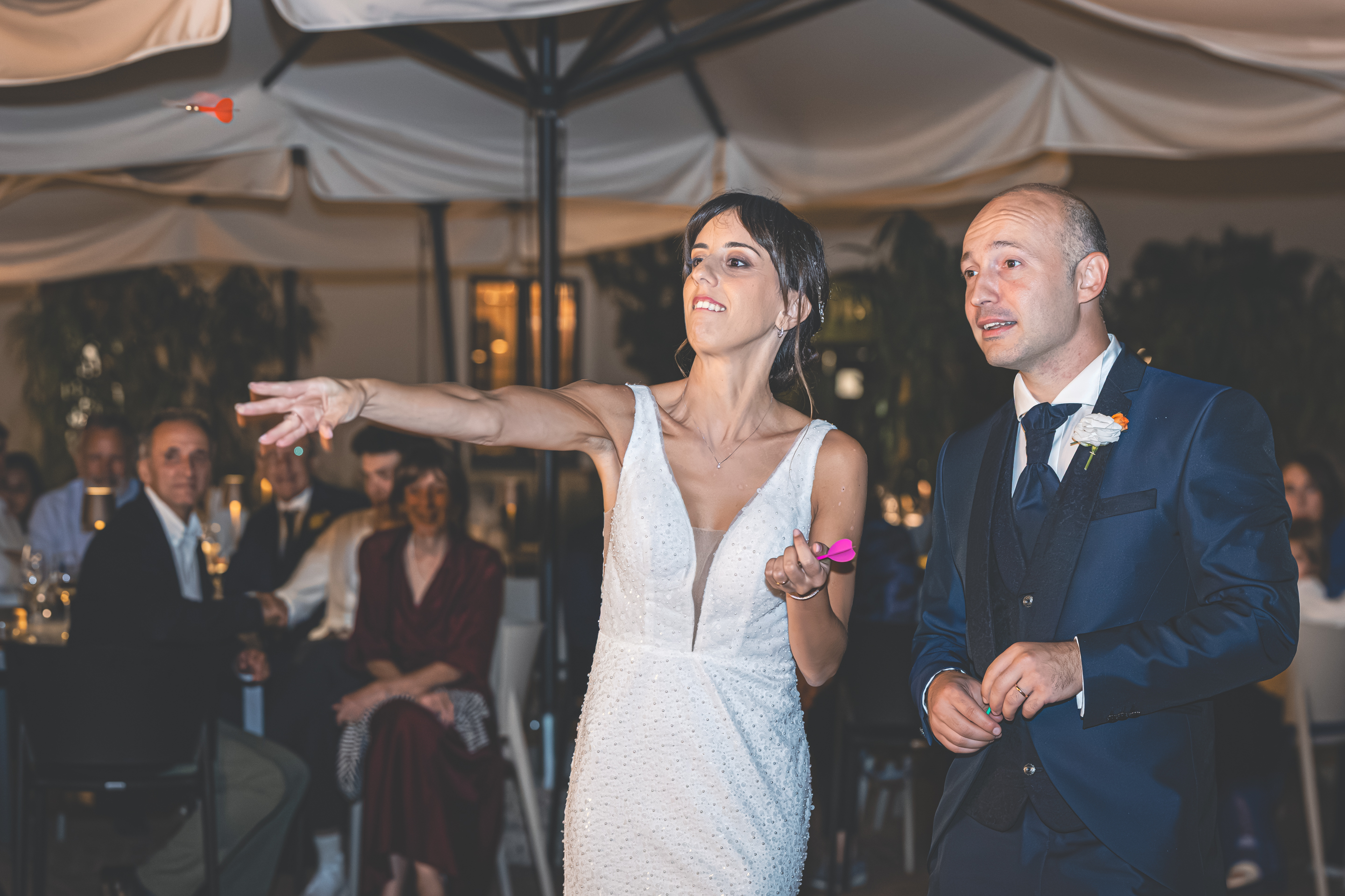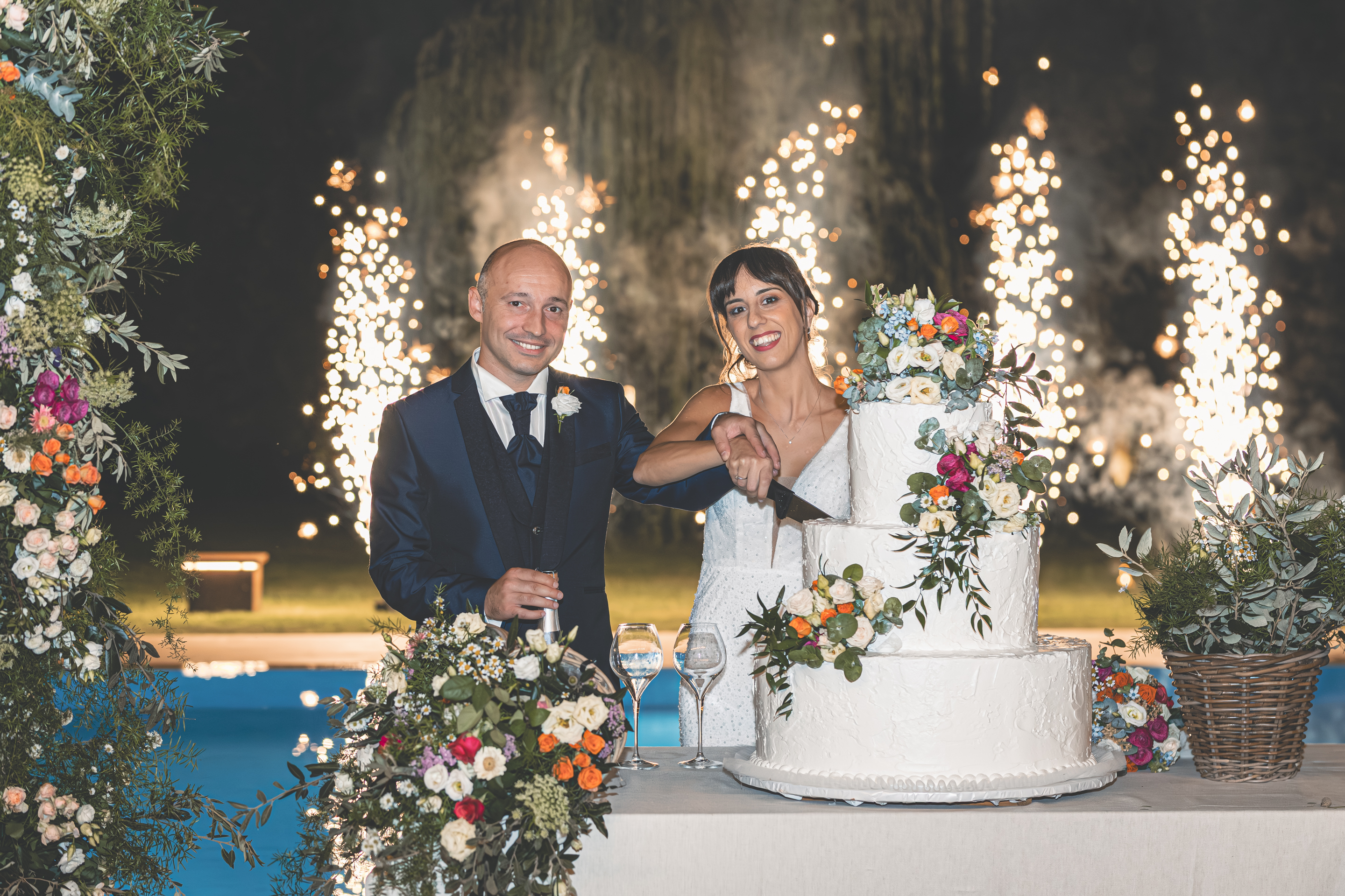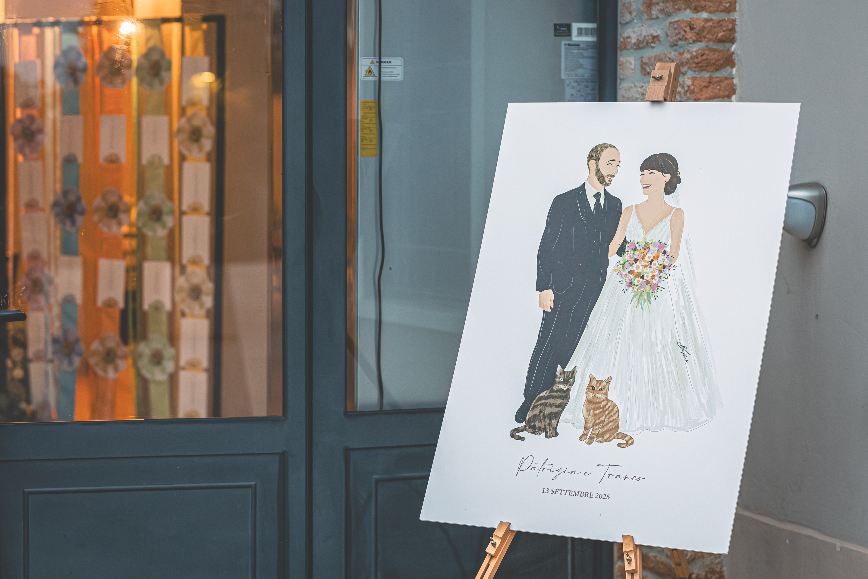 Tra un brindisi qualche scatto con amici e parenti, inizia la cena. La serata è animata da giochi e scherzi degli amici e dalle illustrazioni live di Benedetta Cauzzi, che regalano sorrisi e ricordi unici agli Sposi e agli invitati. Torniamo all’esterno per il taglio della torta, accompagnato dai fuochi d’artificio di Signa Eventi. La festa continua fino a notte inoltrata, tra la confettata di Giuliana Pinzi e le originali bomboniere: piantine di ulivo firmate ancora LB Fiori. Un matrimonio vissuto fino in fondo, fatto di legami veri, casa e tanta festa.