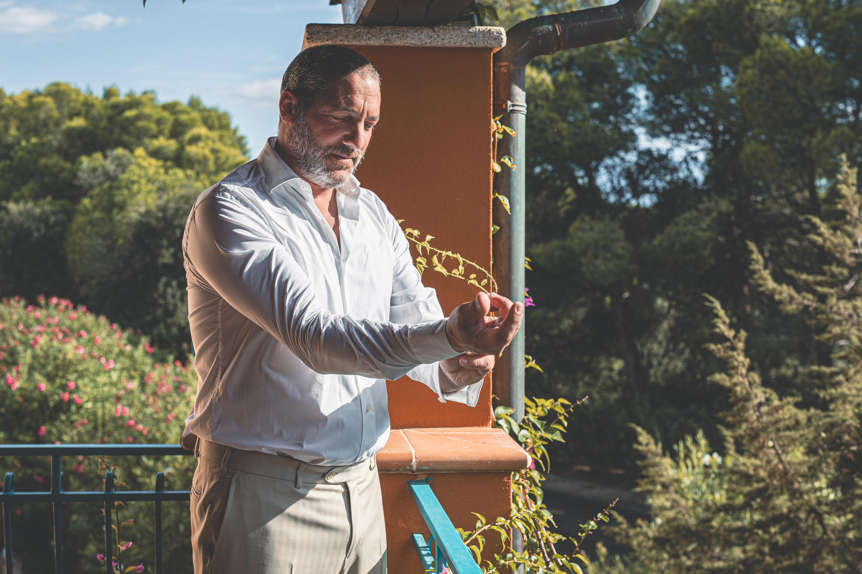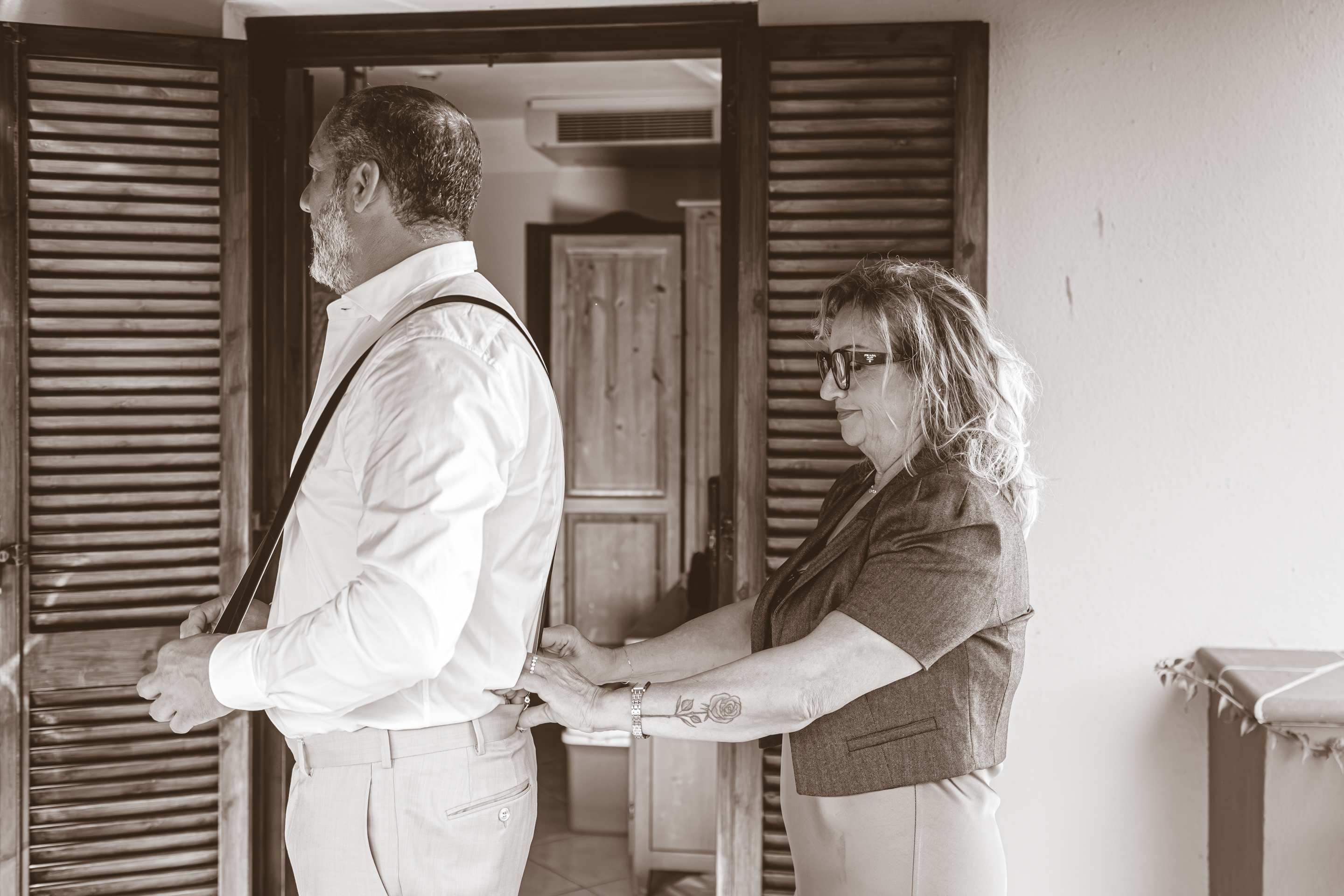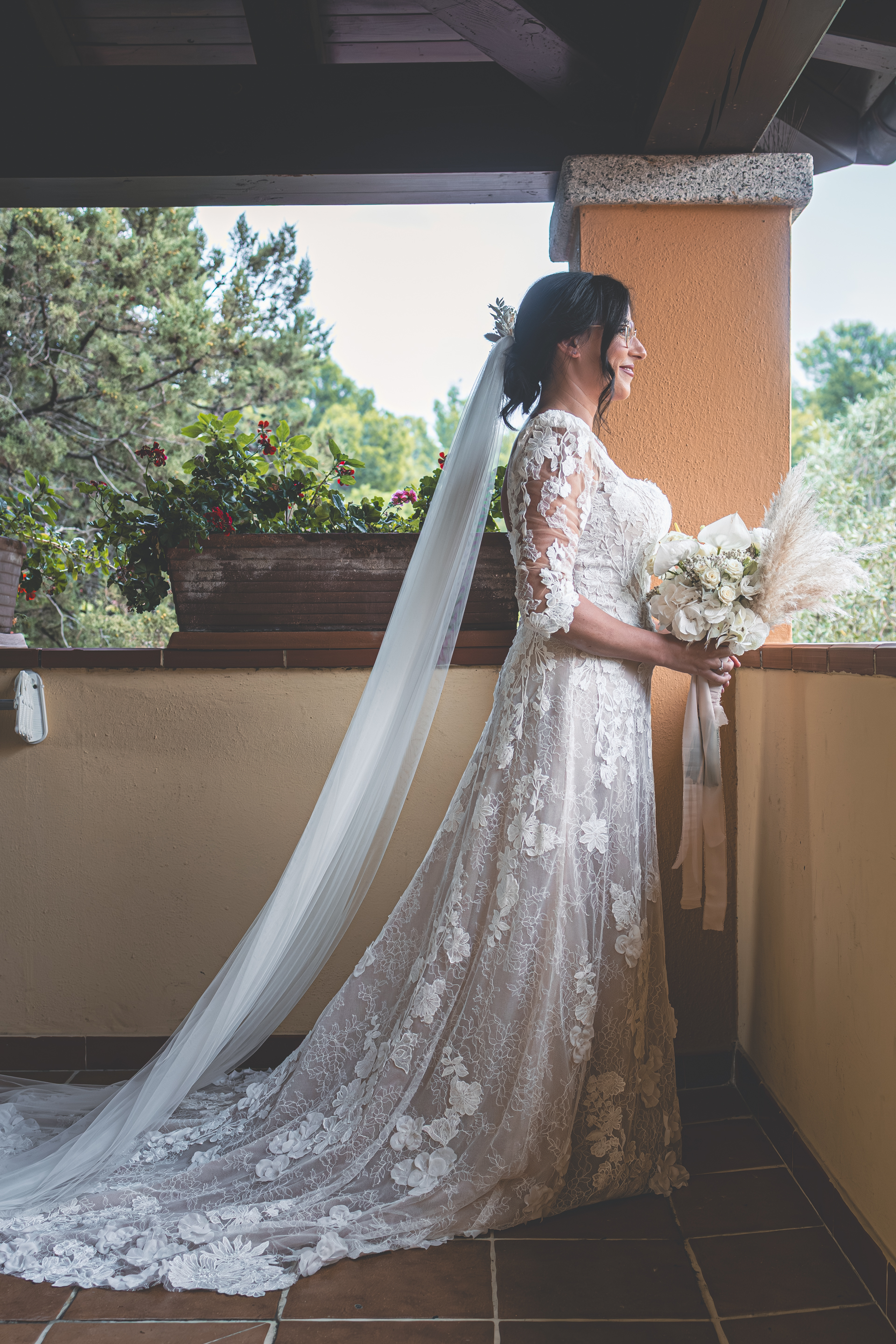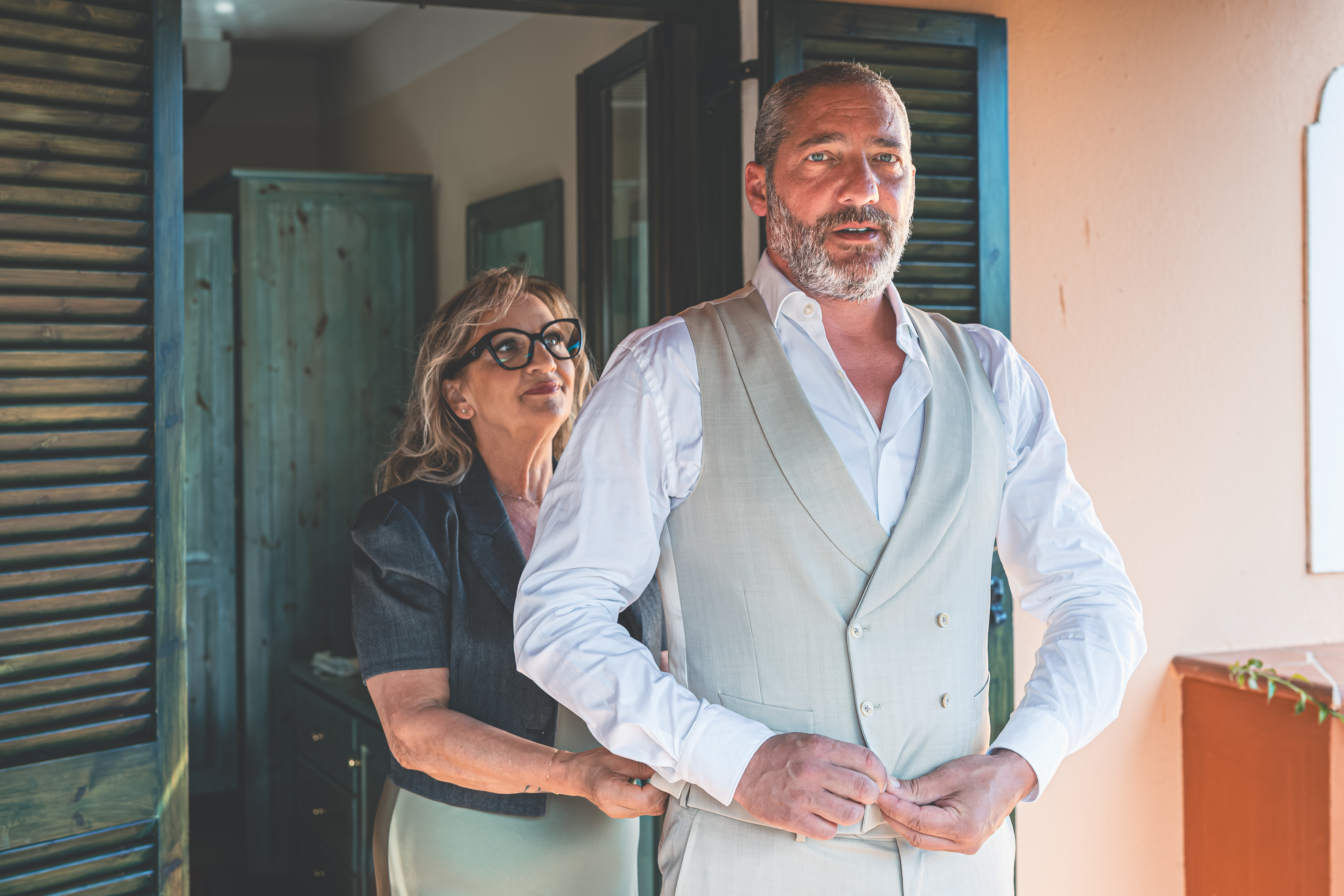 La giornata inizia con i preparativi al Club Hotel Torre Moresca, che ospita tutti gli invitati. Qui Rachele si prepara con il trucco di Valentina Pettorru e l’acconciatura realizzata dall’amica Chiara, instancabile, visto che si occupa anche di buona parte delle donne invitate. Il tempo sembra voler giocare un brutto scherzo: piove e dal mare arrivano nuvoloni carichi d’acqua. Mi sposto da Francesco che, aiutato dalla mamma, indossa il suo abito prima di scendere e iniziare i primi festeggiamenti con gli amici, tra sorrisi e il primo brindisi della giornata. Torno da Rachele, pronta a indossare l’abito arrivato direttamente da Mantova, firmato Sposi Domani. Intanto il cielo inizia a rasserenarsi e l’emozione cresce, lasciando spazio alla speranza di una cerimonia baciata dal sole.