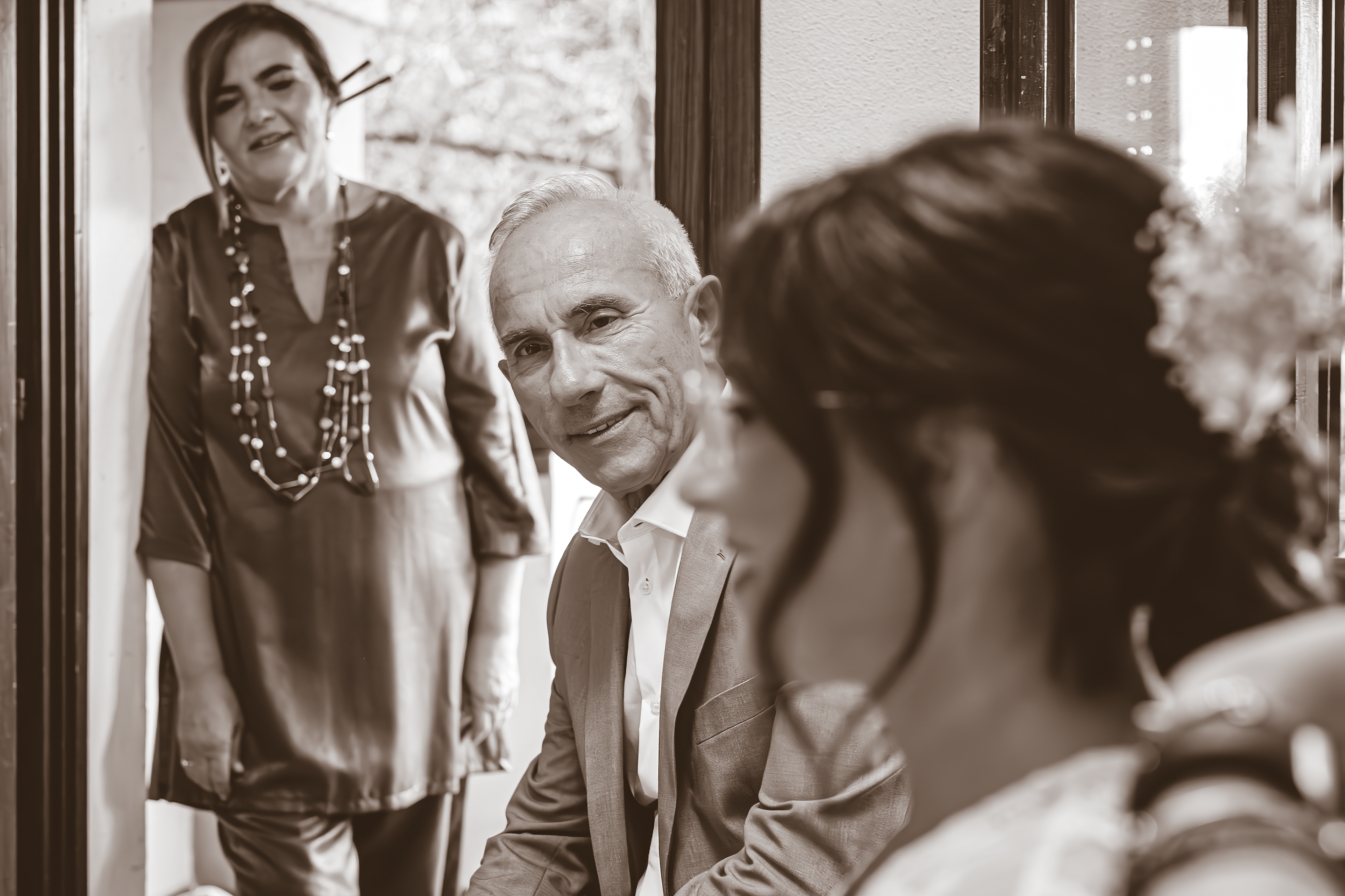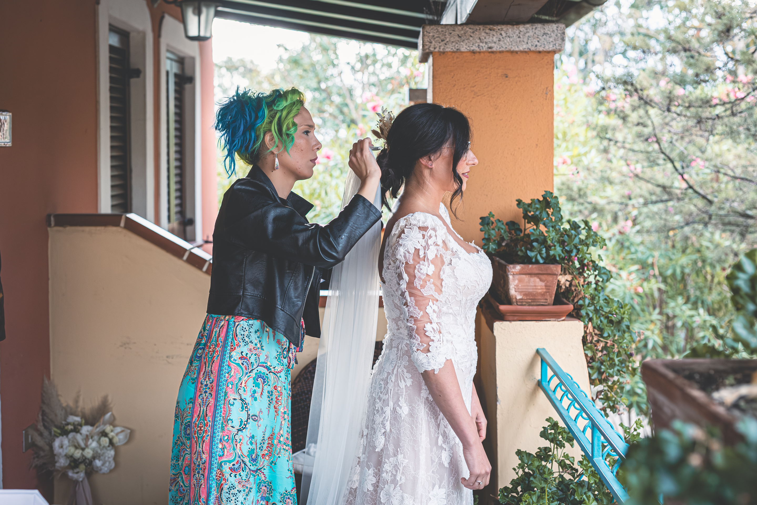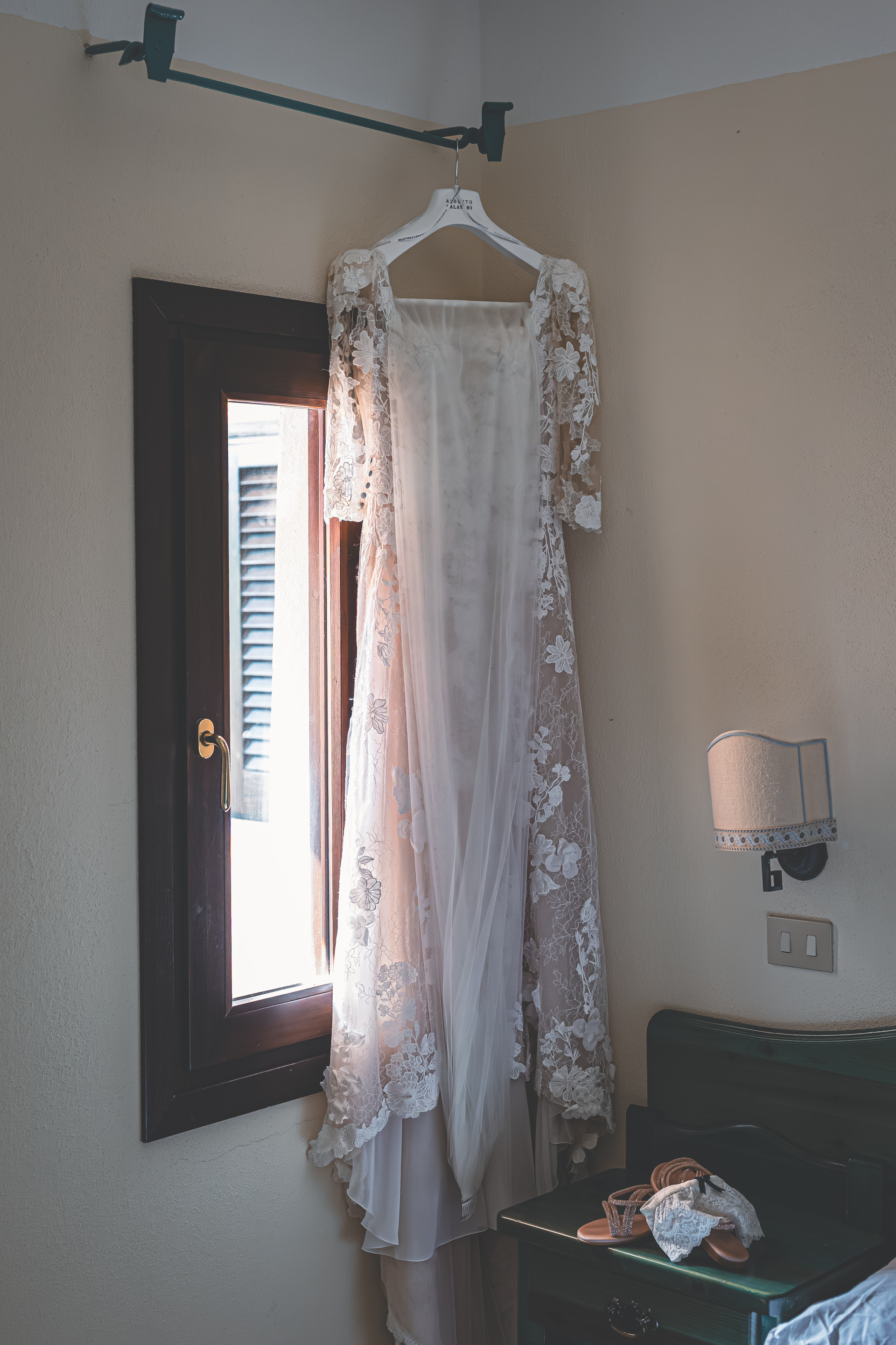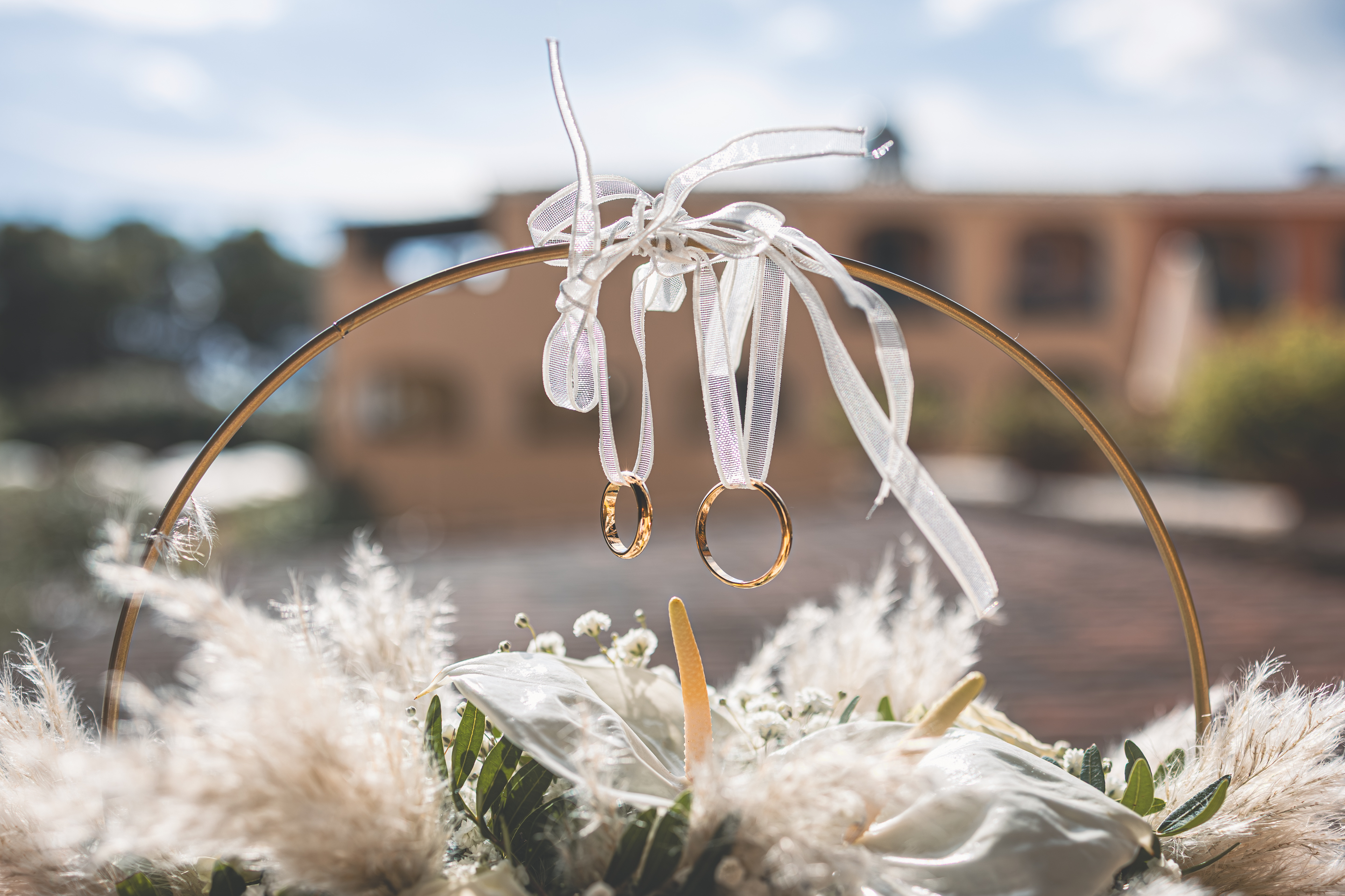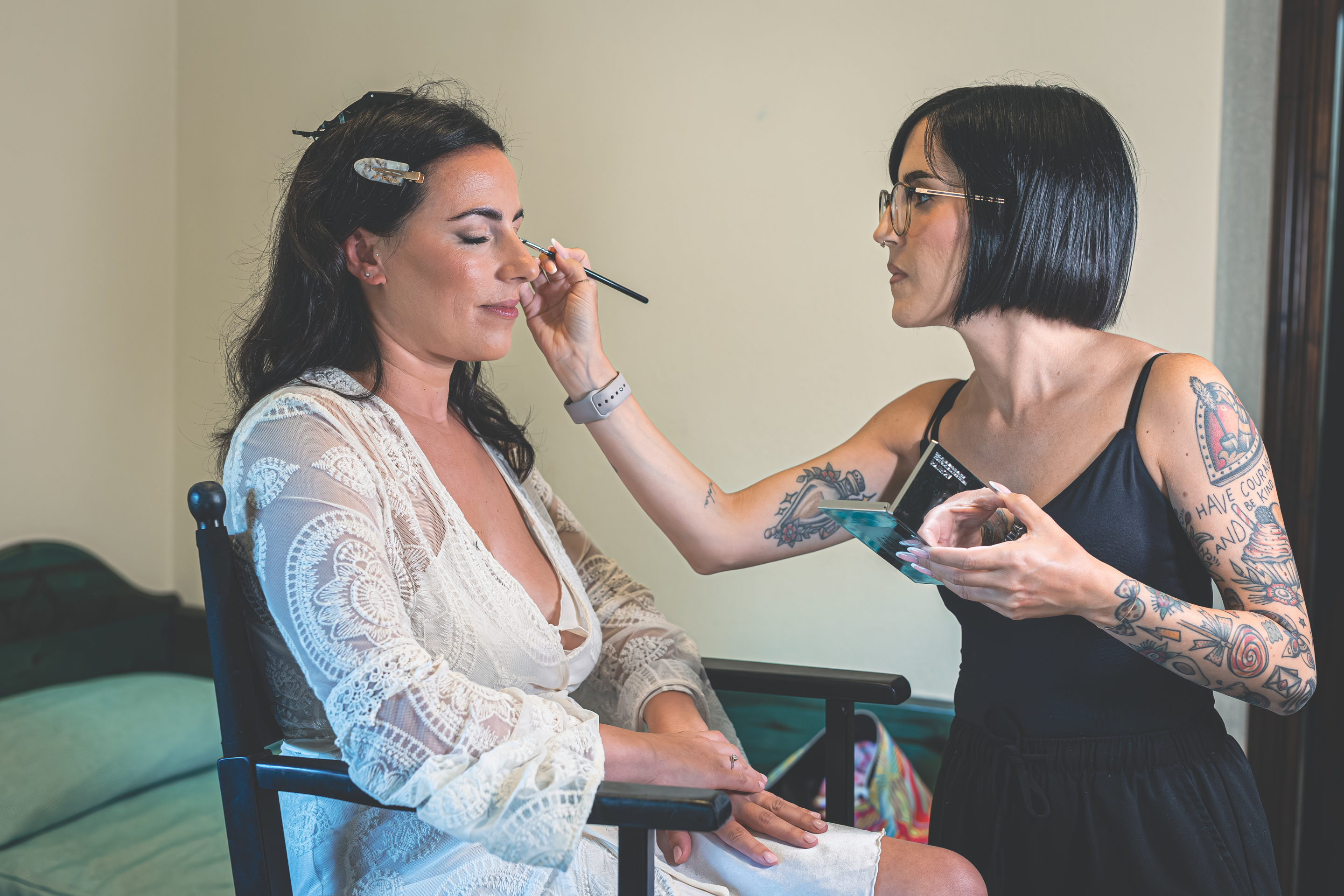 La giornata inizia con i preparativi al Club Hotel Torre Moresca, che ospita tutti gli invitati. Qui Rachele si prepara con il trucco di Valentina Pettorru e l’acconciatura realizzata dall’amica Chiara, instancabile, visto che si occupa anche di buona parte delle donne invitate. Il tempo sembra voler giocare un brutto scherzo: piove e dal mare arrivano nuvoloni carichi d’acqua. Mi sposto da Francesco che, aiutato dalla mamma, indossa il suo abito prima di scendere e iniziare i primi festeggiamenti con gli amici, tra sorrisi e il primo brindisi della giornata. Torno da Rachele, pronta a indossare l’abito arrivato direttamente da Mantova, firmato Sposi Domani. Intanto il cielo inizia a rasserenarsi e l’emozione cresce, lasciando spazio alla speranza di una cerimonia baciata dal sole.