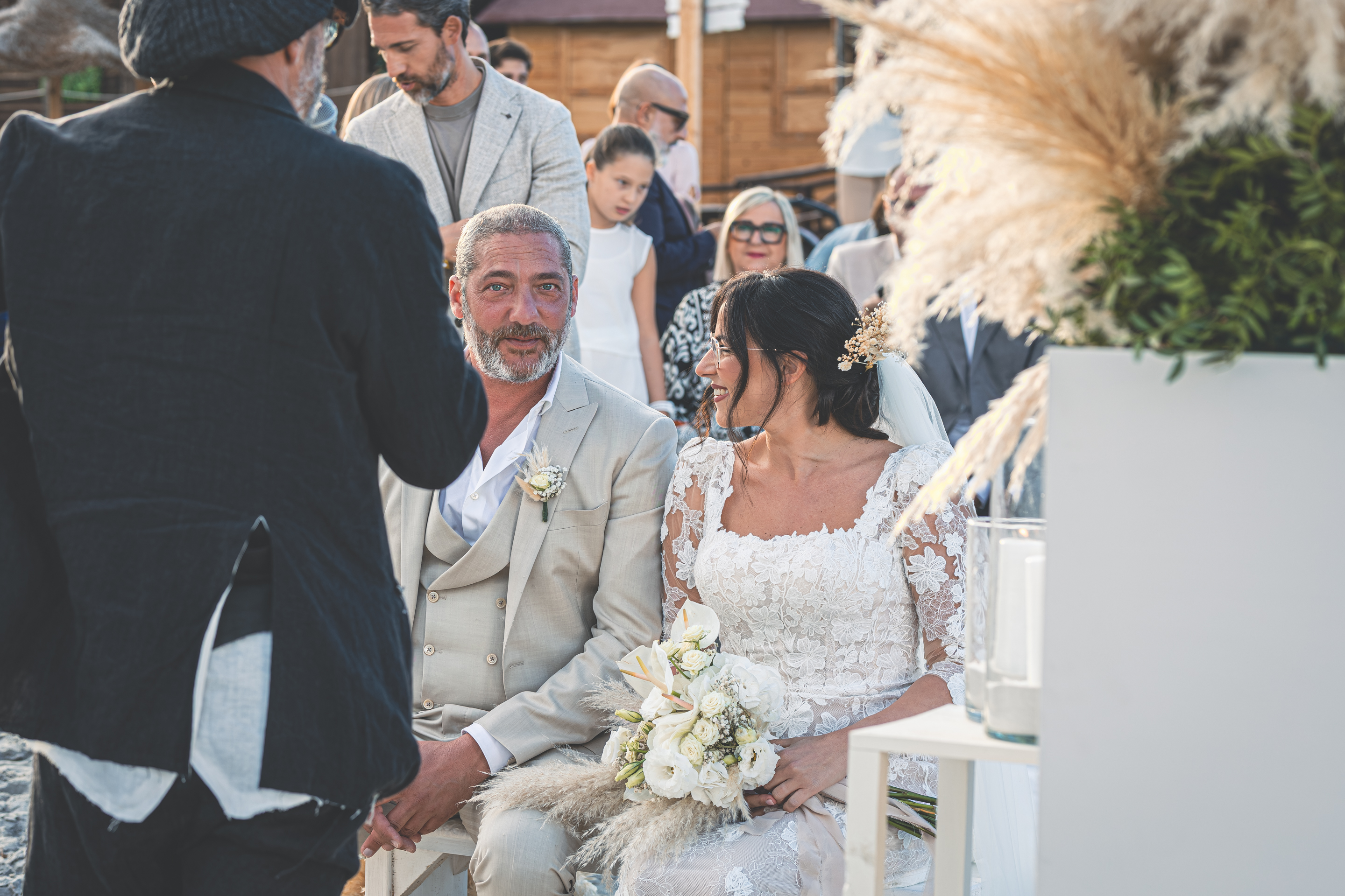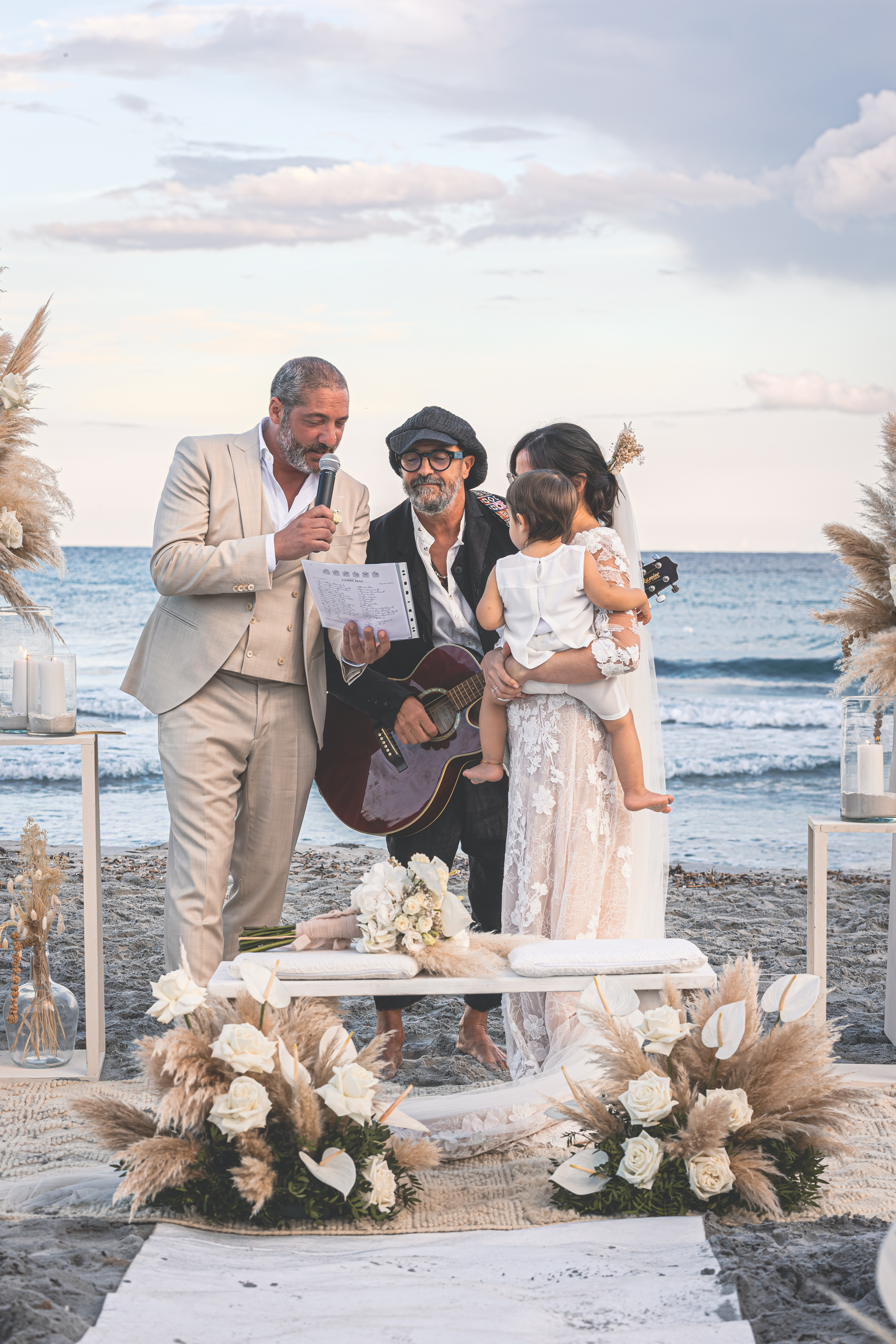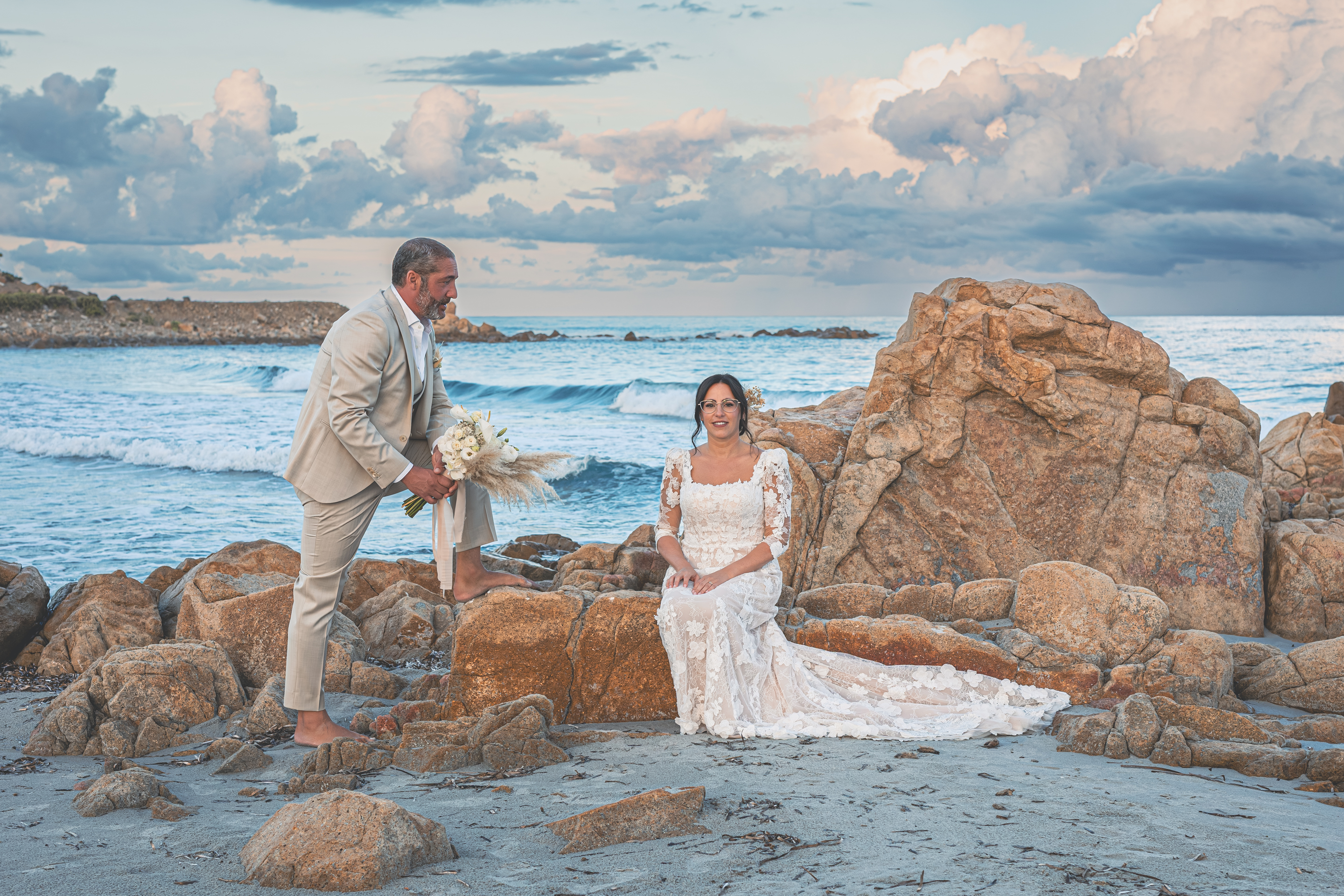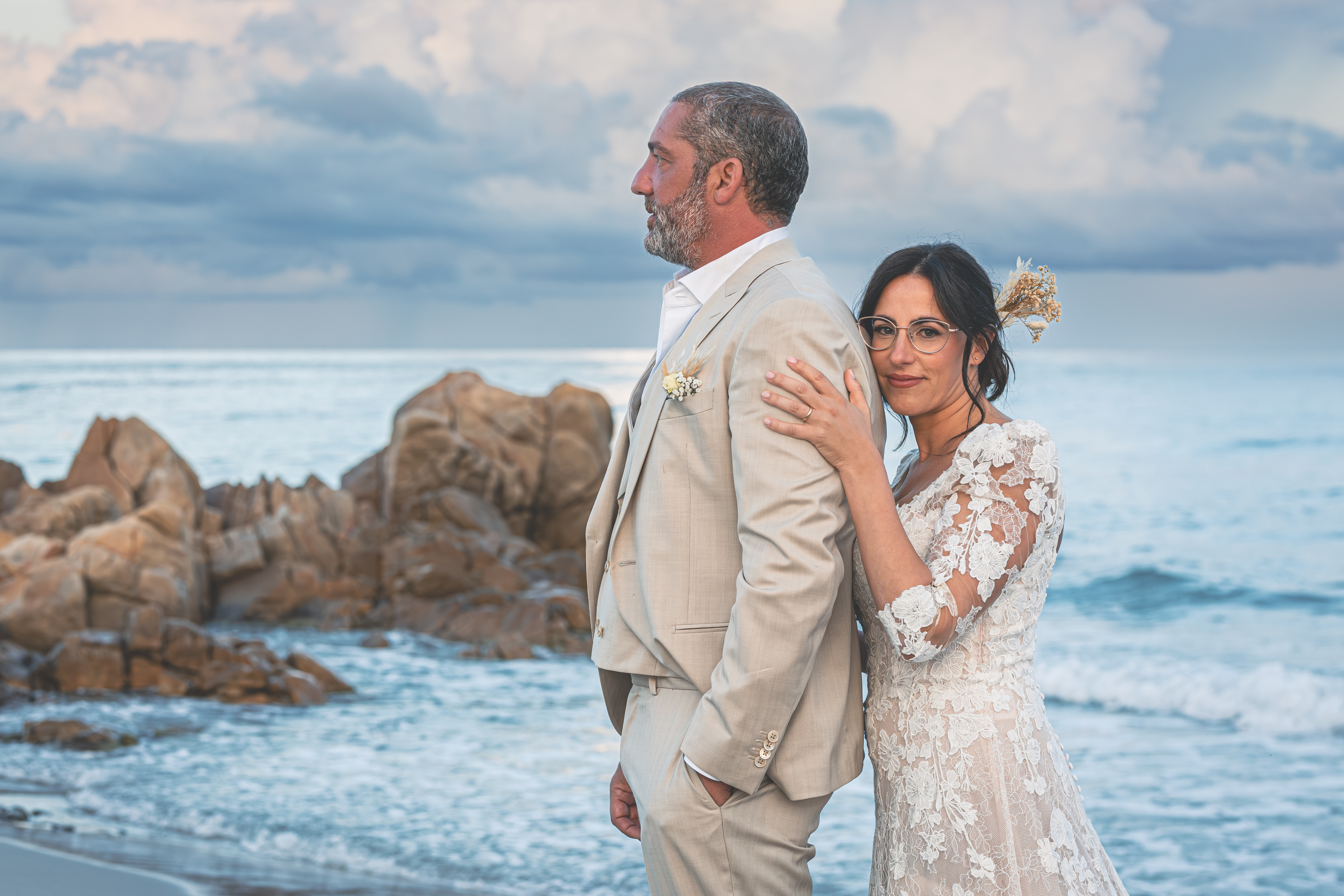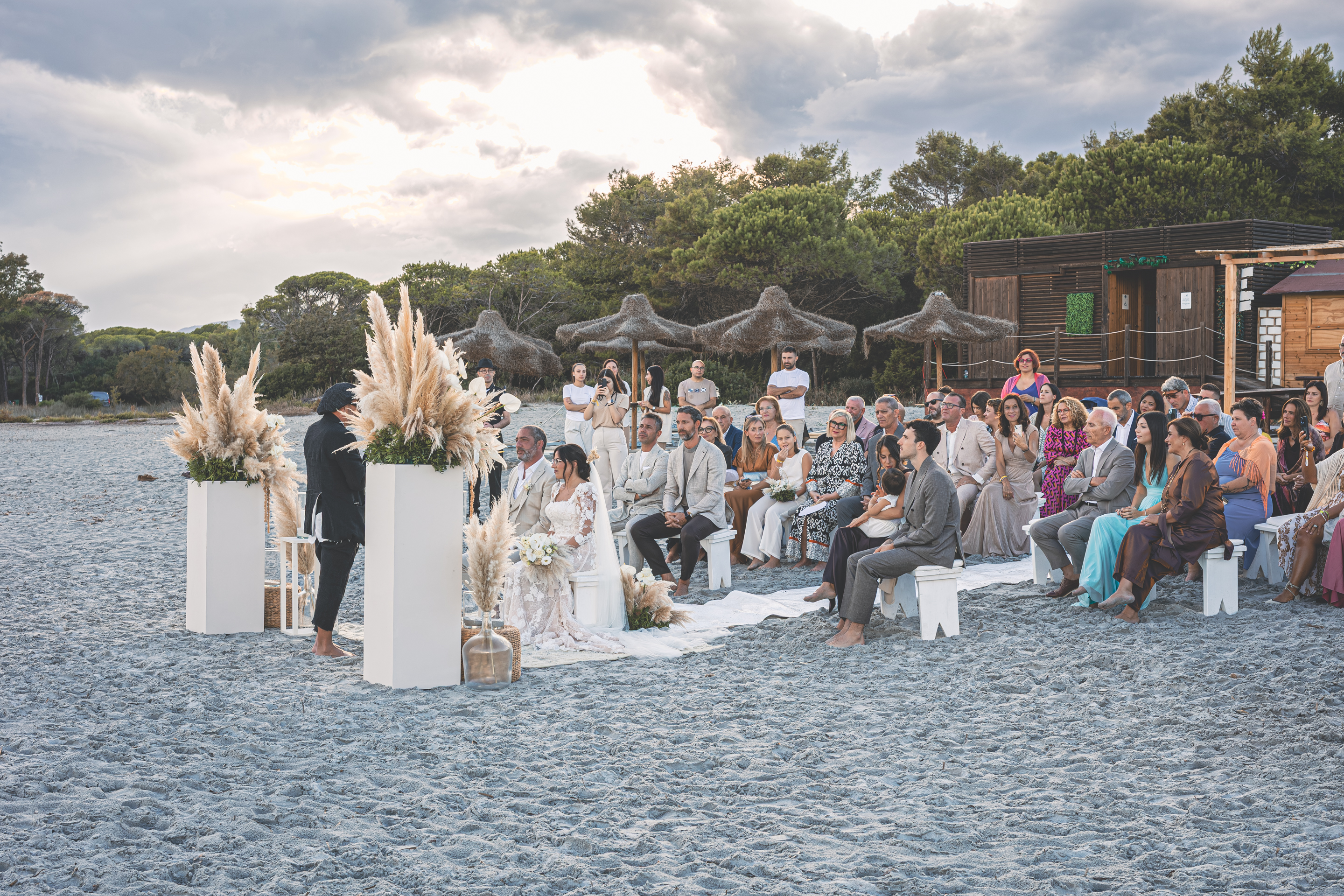 Mi sposto sulla spiaggia antistante il Sunset Beach Club, dove il team di Valentina Piu Events riallestisce la cerimonia in tempi record, in collaborazione con L’Arte dei Fiori per l’allestimento floreale. Francesco raggiunge il luogo della cerimonia con una scenografica passeggiata in riva al mare, insieme ai testimoni – il fratello e un amico – prima del consueto ingresso con la mamma. Poi l’ingresso di Rachele, accompagnata dal papà. Il rito simbolico, celebrato dallo zio, è animato da pensieri, canti e tante emozioni. Il mare fa da sfondo, insieme alle ultime nuvole illuminate dalla calda luce del tramonto, creando un’atmosfera intima e profondamente sentita.