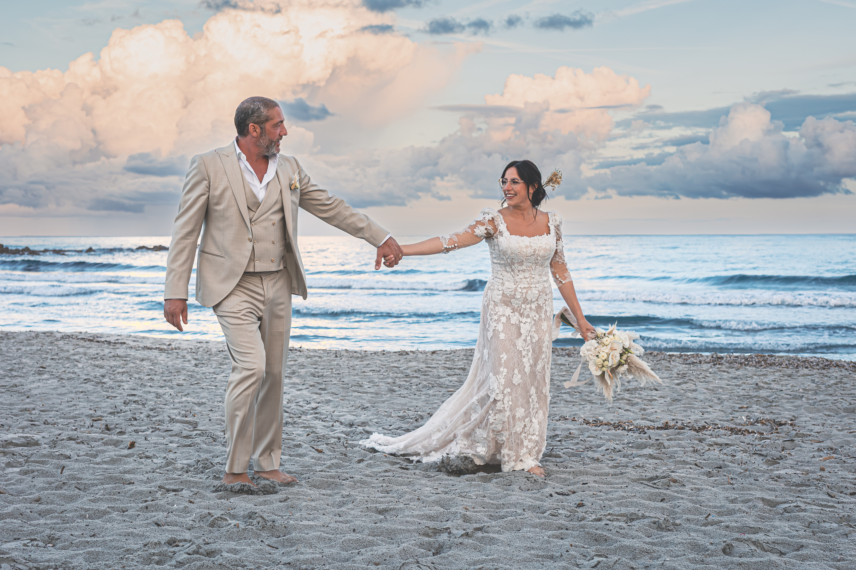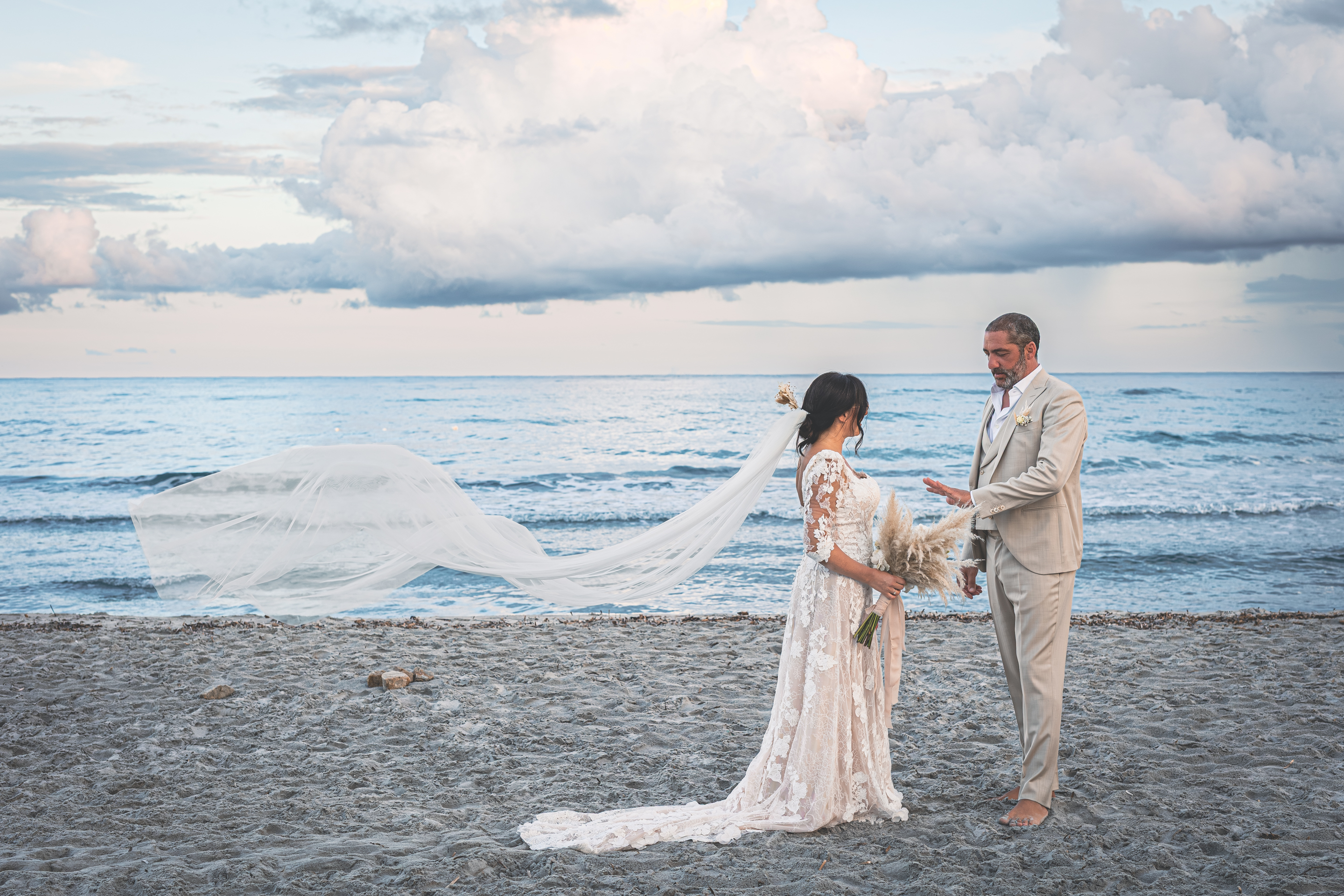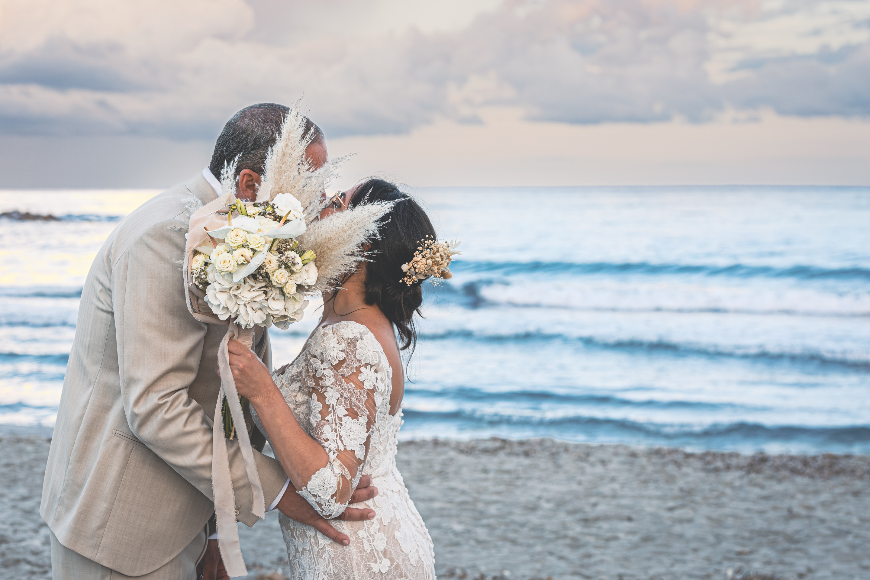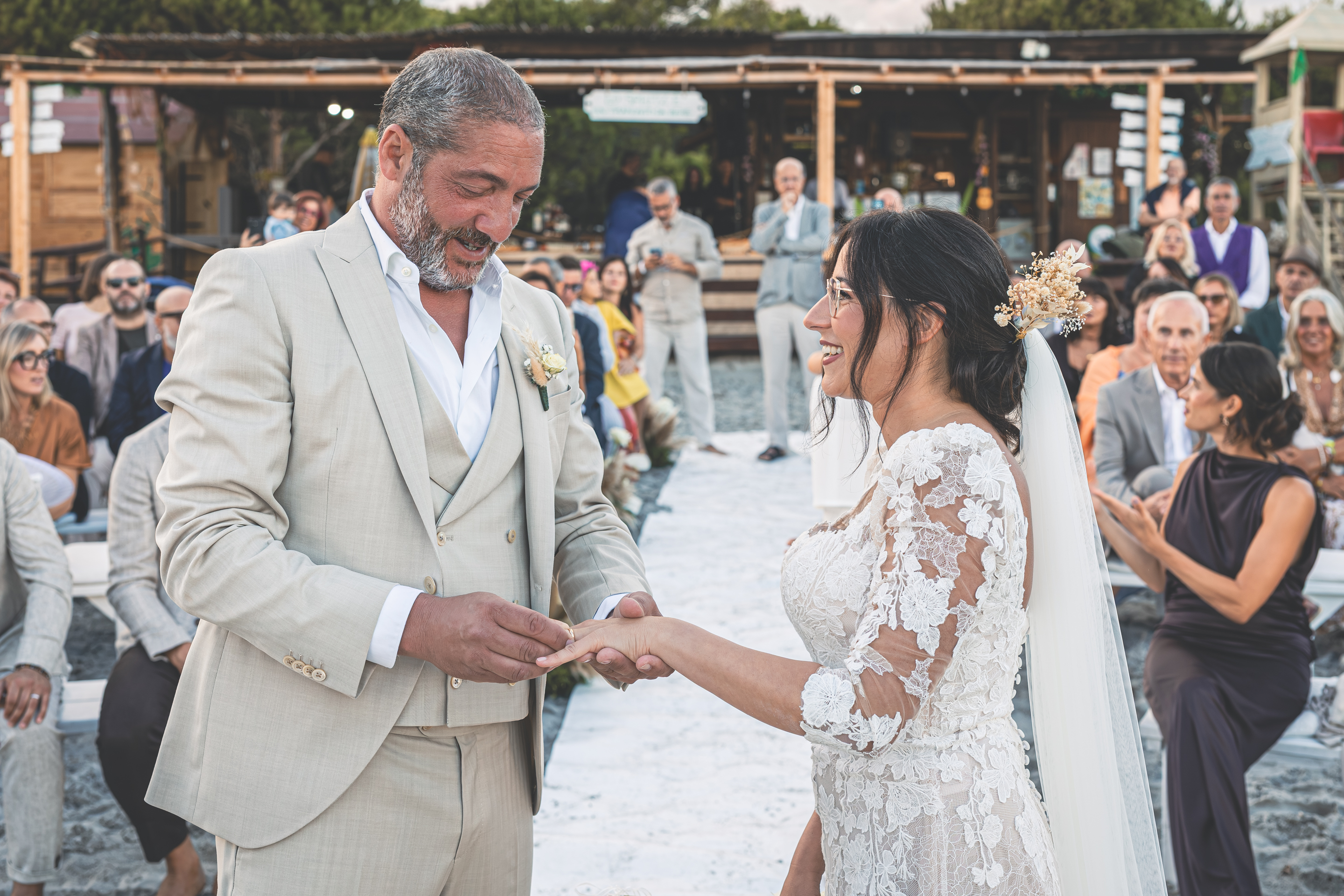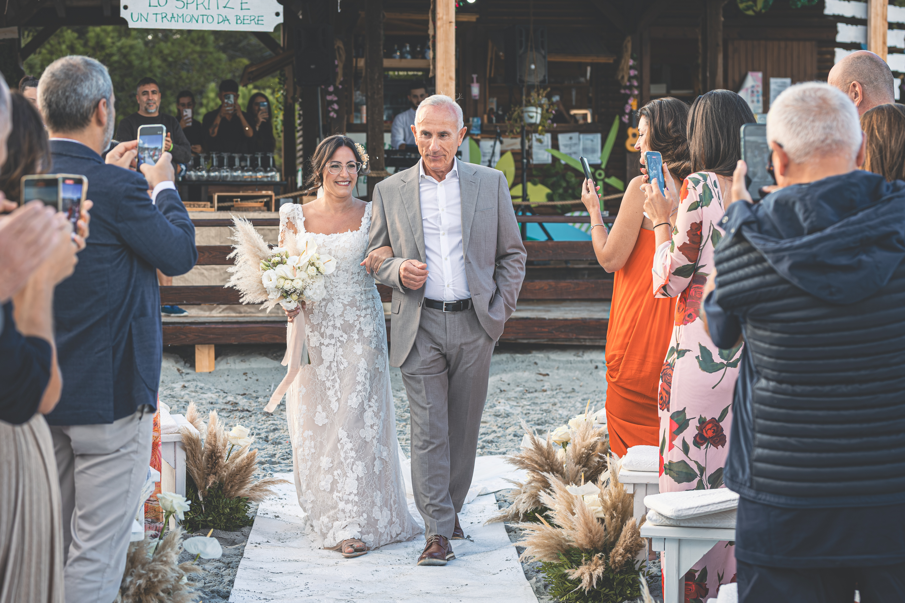 Mi sposto sulla spiaggia antistante il Sunset Beach Club, dove il team di Valentina Piu Events riallestisce la cerimonia in tempi record, in collaborazione con L’Arte dei Fiori per l’allestimento floreale. Francesco raggiunge il luogo della cerimonia con una scenografica passeggiata in riva al mare, insieme ai testimoni – il fratello e un amico – prima del consueto ingresso con la mamma. Poi l’ingresso di Rachele, accompagnata dal papà. Il rito simbolico, celebrato dallo zio, è animato da pensieri, canti e tante emozioni. Il mare fa da sfondo, insieme alle ultime nuvole illuminate dalla calda luce del tramonto, creando un’atmosfera intima e profondamente sentita.