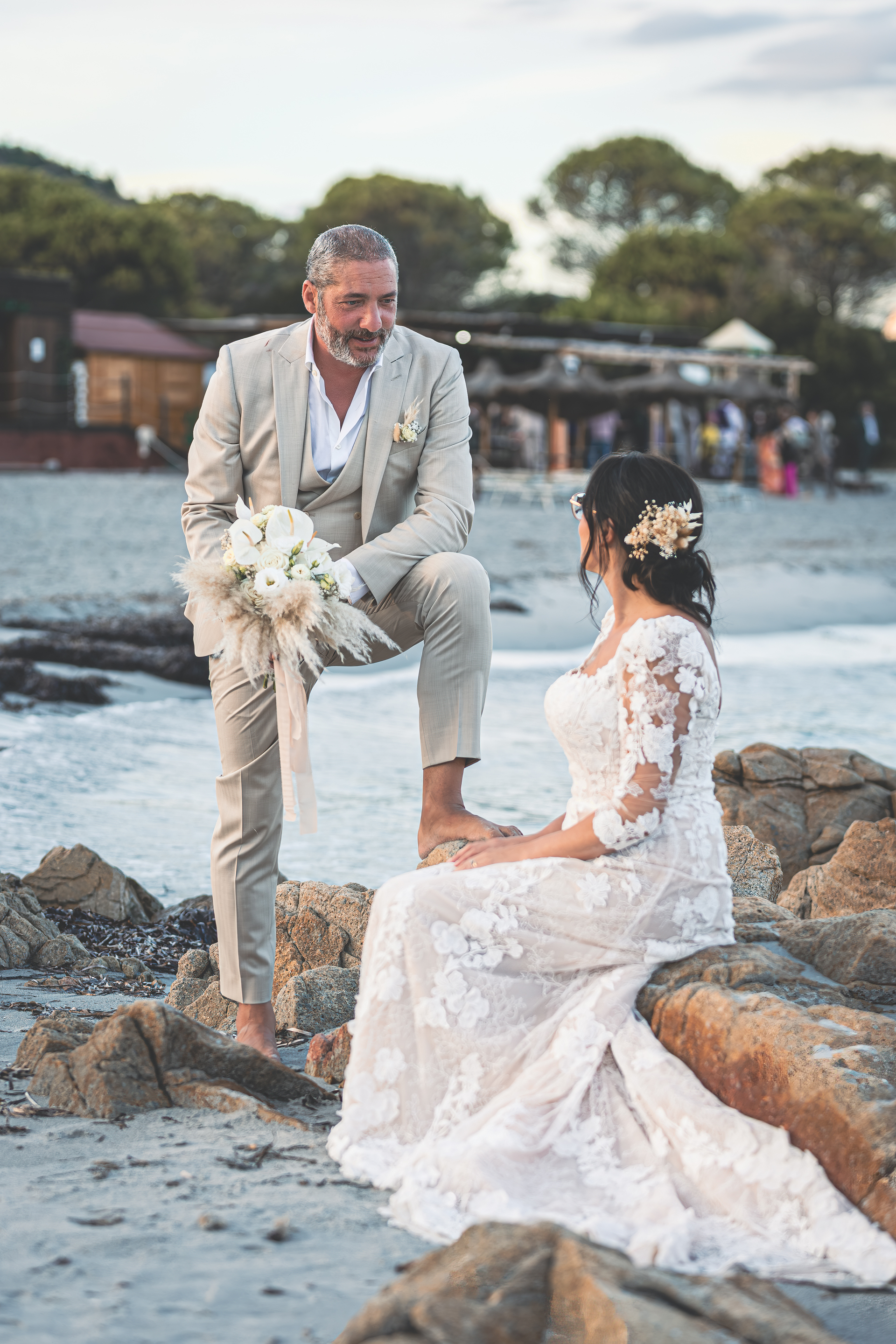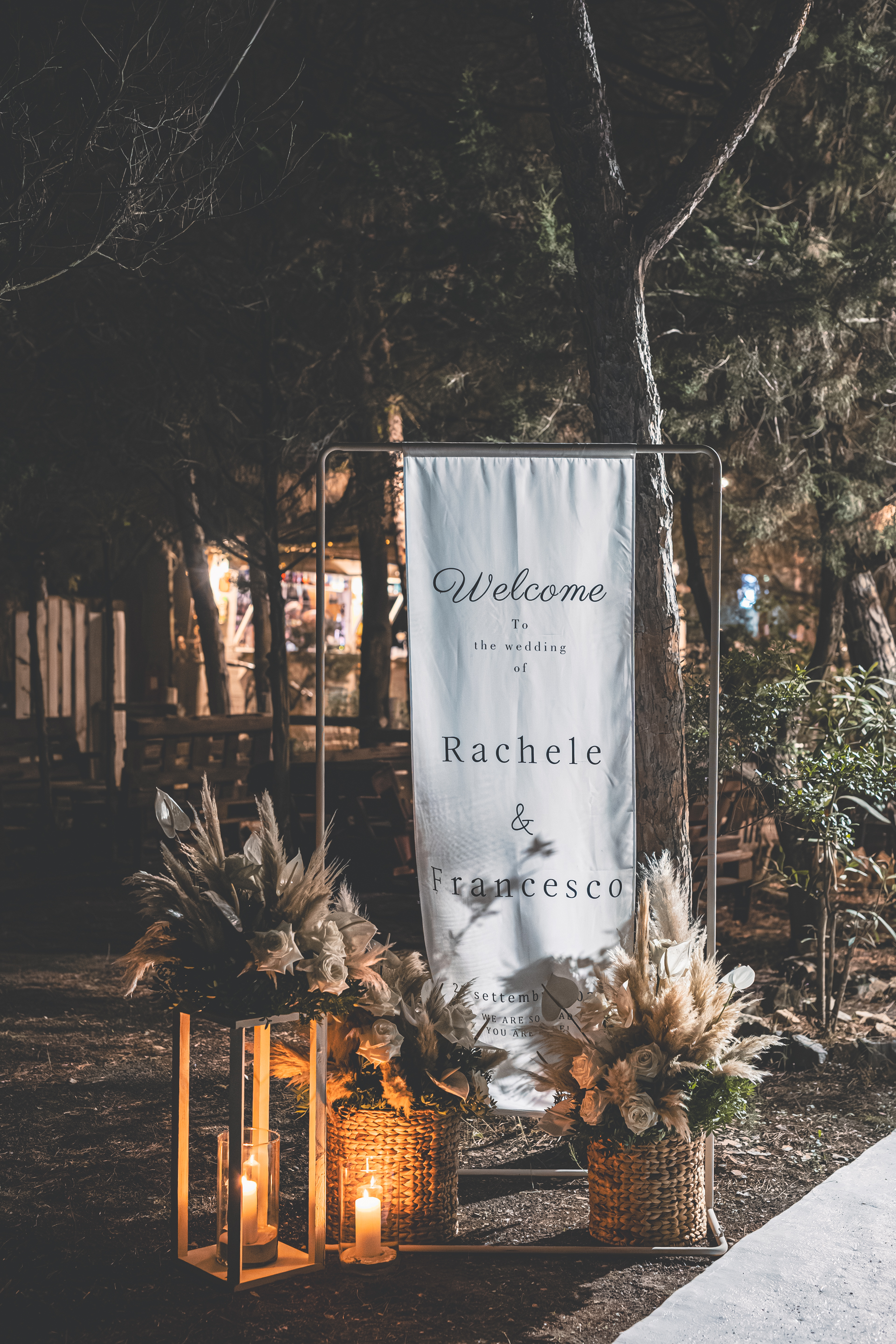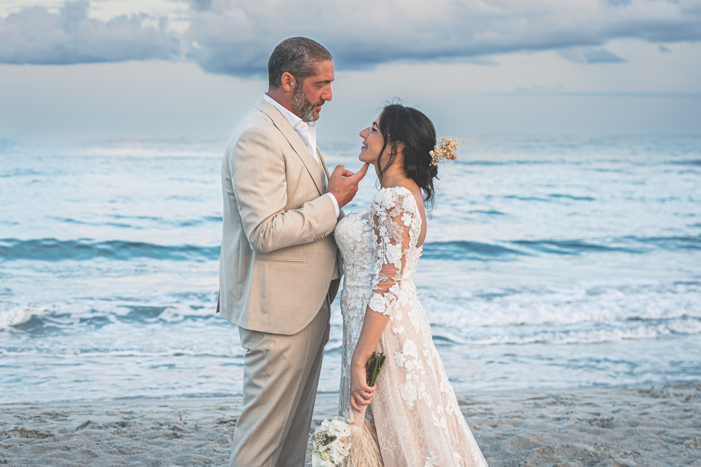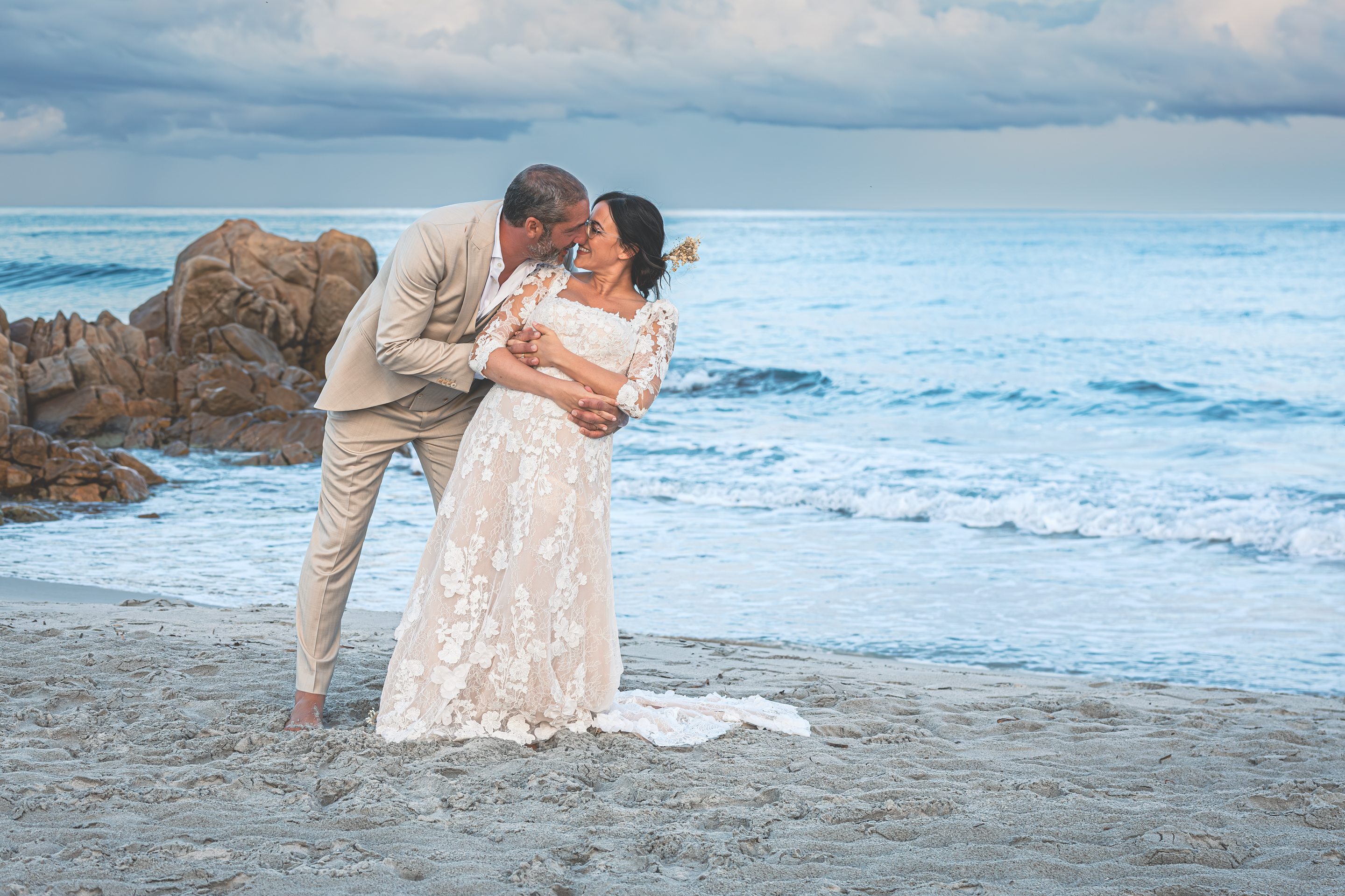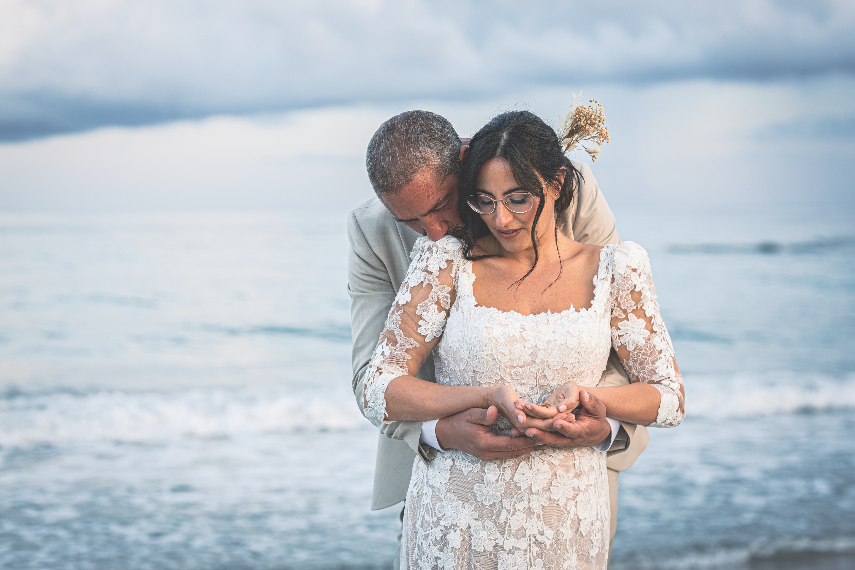 Mi sposto sulla spiaggia antistante il Sunset Beach Club, dove il team di Valentina Piu Events riallestisce la cerimonia in tempi record, in collaborazione con L’Arte dei Fiori per l’allestimento floreale. Francesco raggiunge il luogo della cerimonia con una scenografica passeggiata in riva al mare, insieme ai testimoni – il fratello e un amico – prima del consueto ingresso con la mamma. Poi l’ingresso di Rachele, accompagnata dal papà. Il rito simbolico, celebrato dallo zio, è animato da pensieri, canti e tante emozioni. Il mare fa da sfondo, insieme alle ultime nuvole illuminate dalla calda luce del tramonto, creando un’atmosfera intima e profondamente sentita.