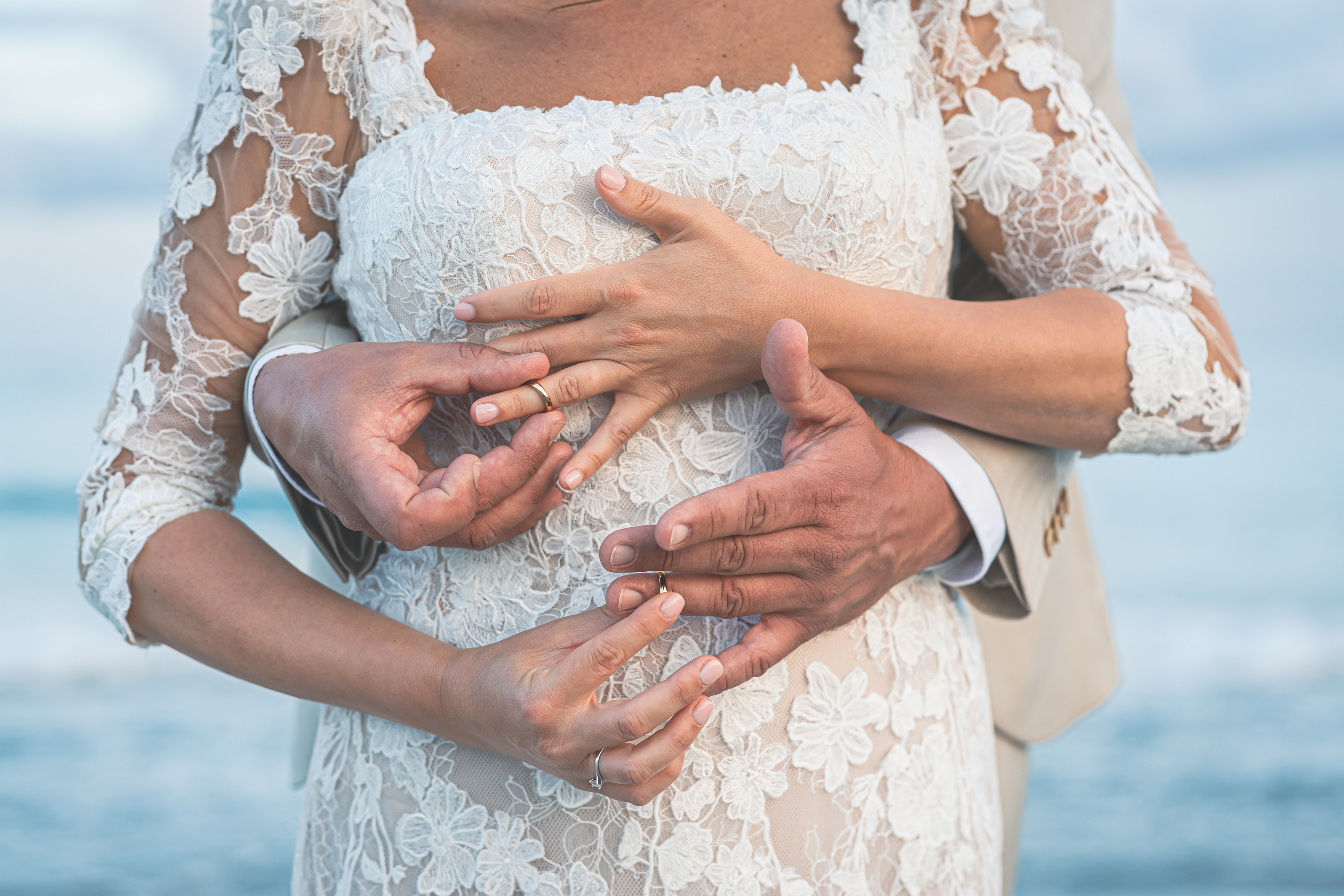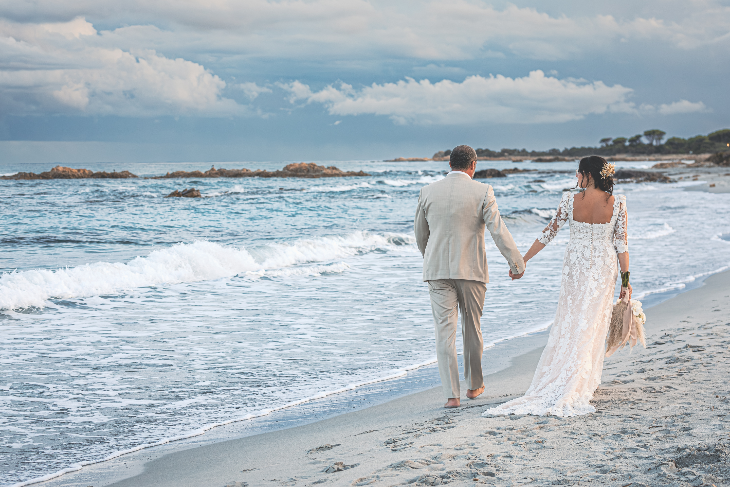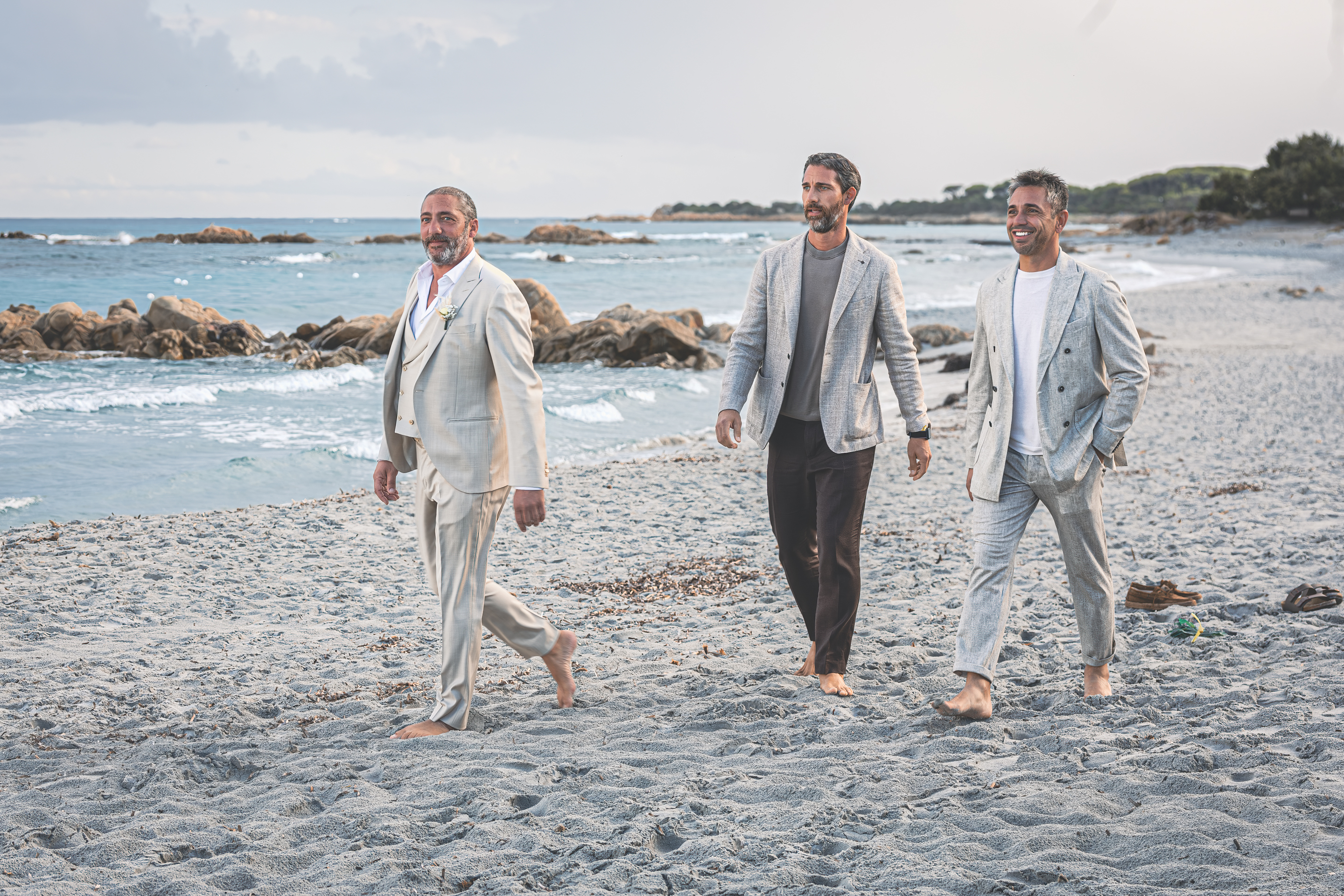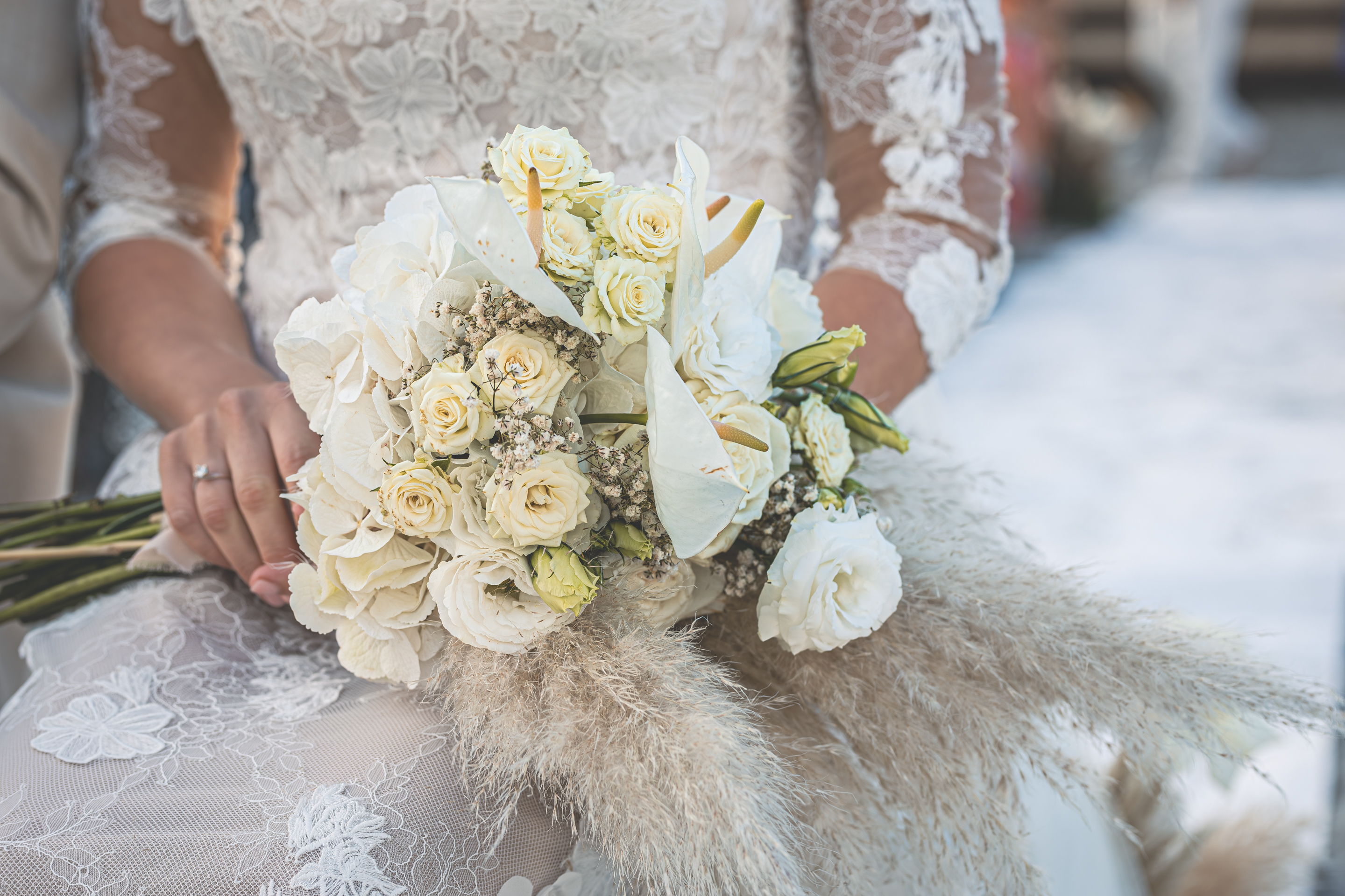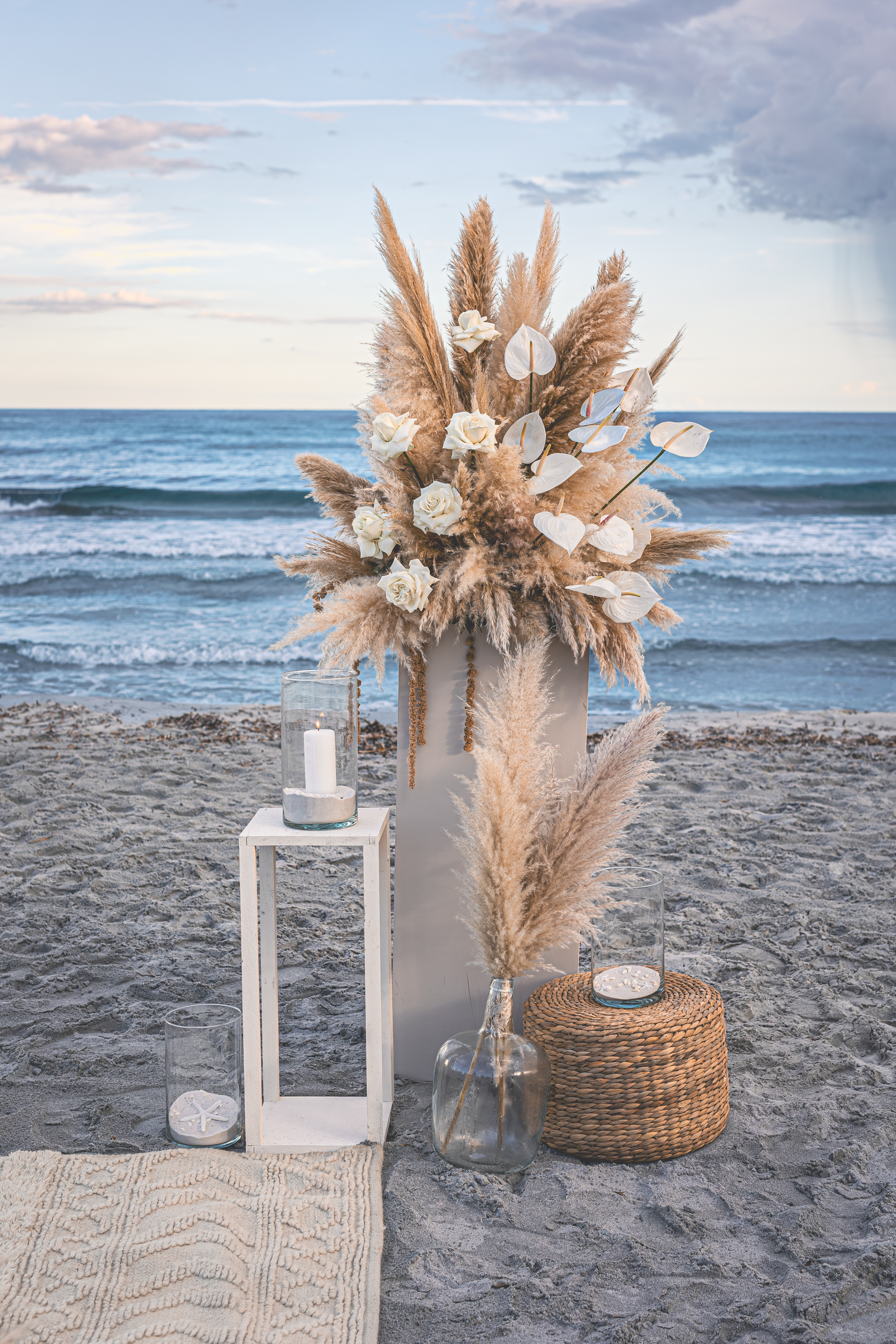 Mi sposto sulla spiaggia antistante il Sunset Beach Club, dove il team di Valentina Piu Events riallestisce la cerimonia in tempi record, in collaborazione con L’Arte dei Fiori per l’allestimento floreale. Francesco raggiunge il luogo della cerimonia con una scenografica passeggiata in riva al mare, insieme ai testimoni – il fratello e un amico – prima del consueto ingresso con la mamma. Poi l’ingresso di Rachele, accompagnata dal papà. Il rito simbolico, celebrato dallo zio, è animato da pensieri, canti e tante emozioni. Il mare fa da sfondo, insieme alle ultime nuvole illuminate dalla calda luce del tramonto, creando un’atmosfera intima e profondamente sentita.
