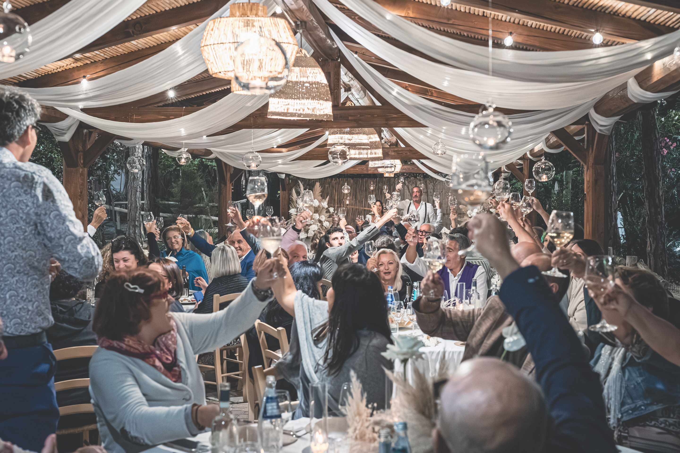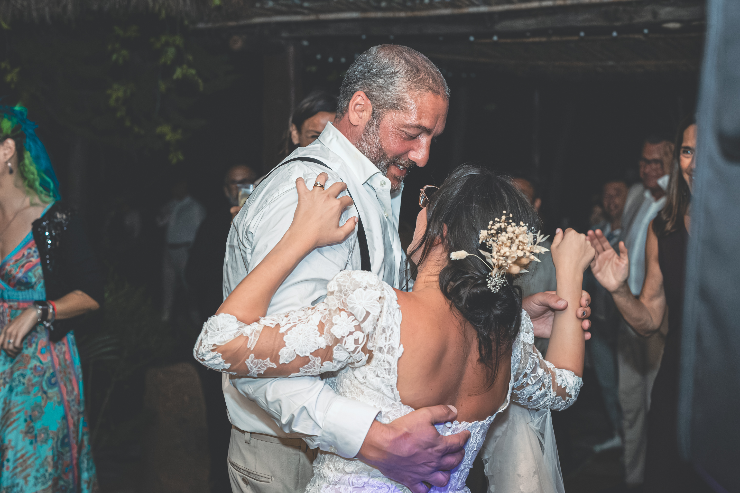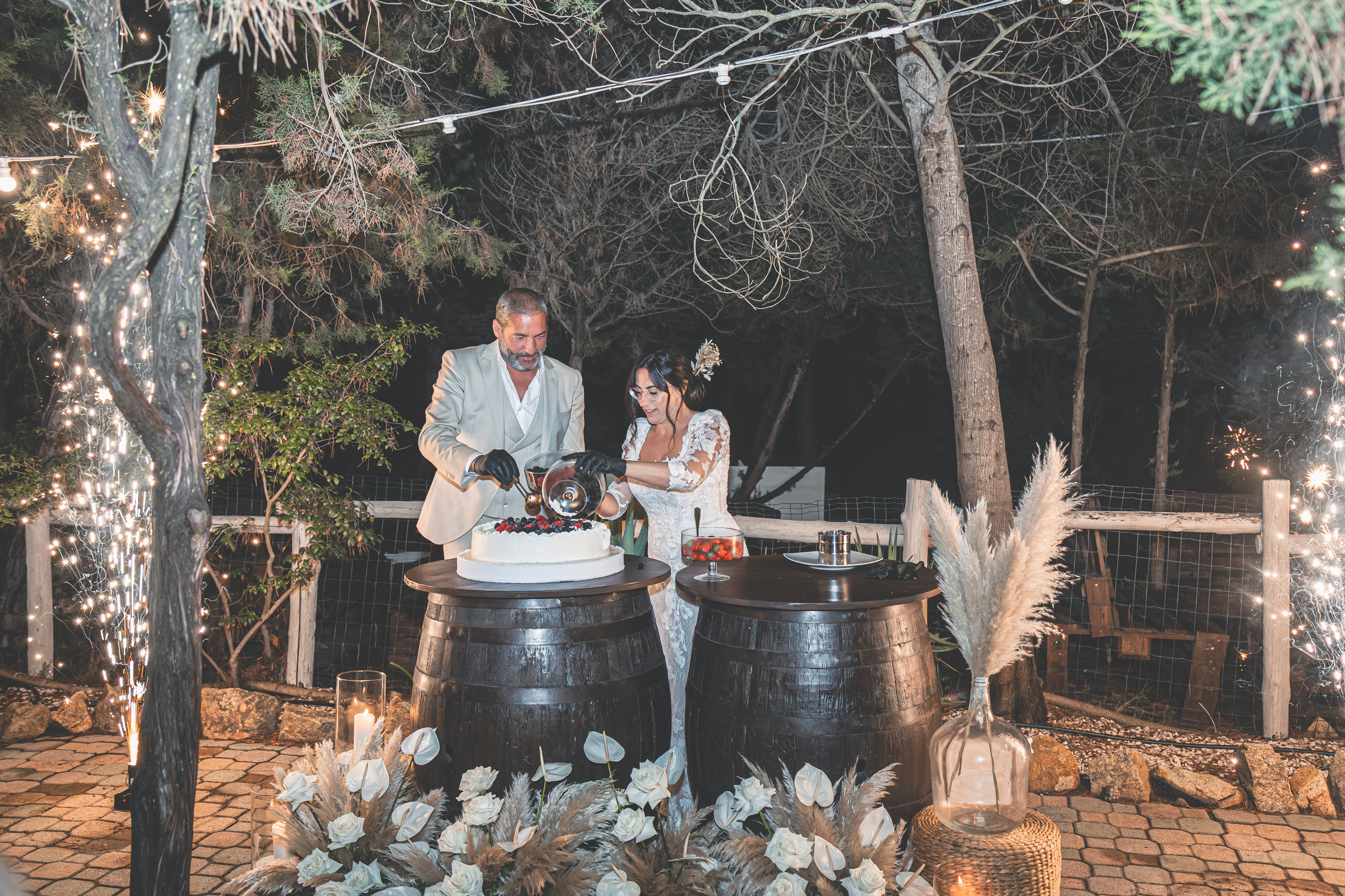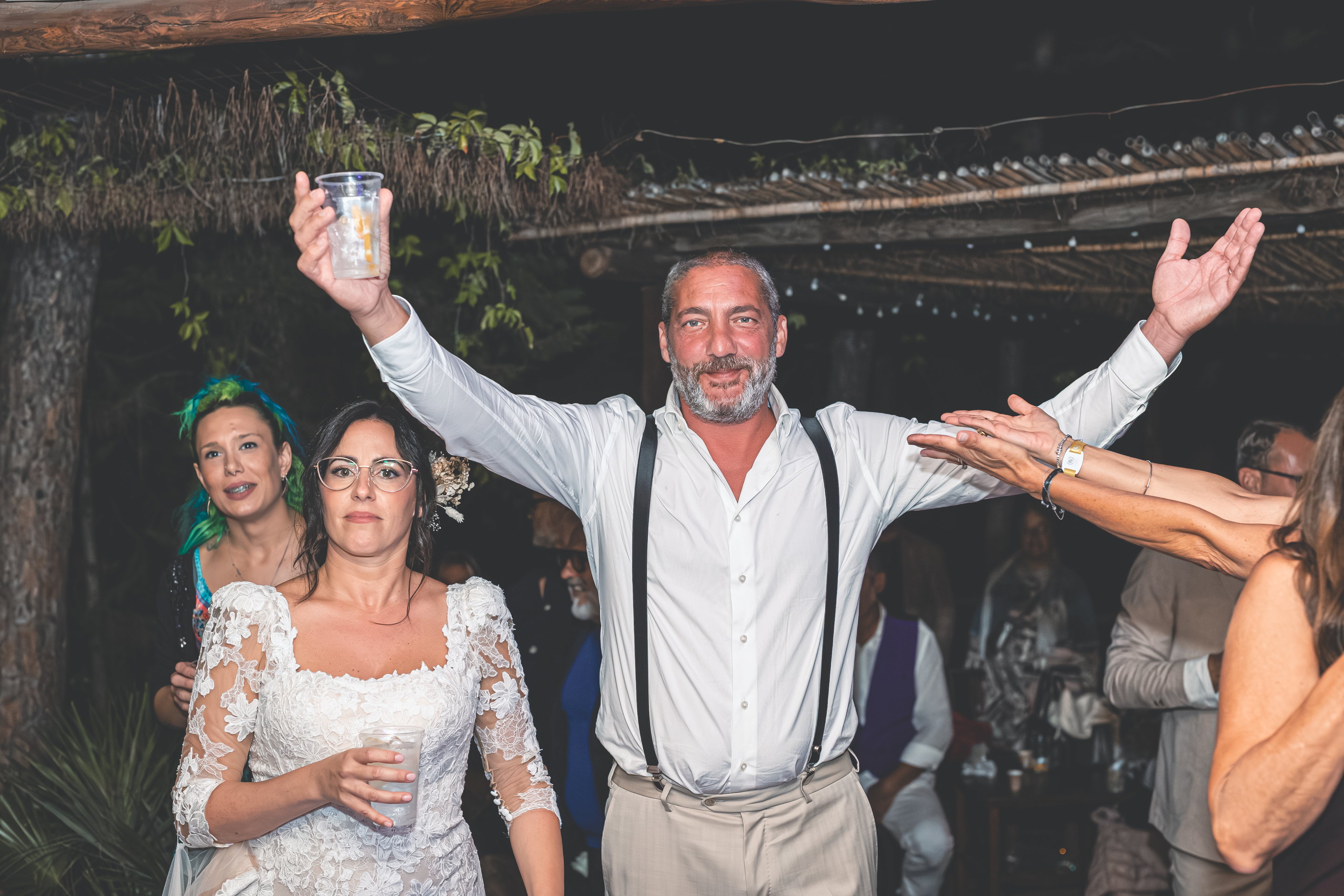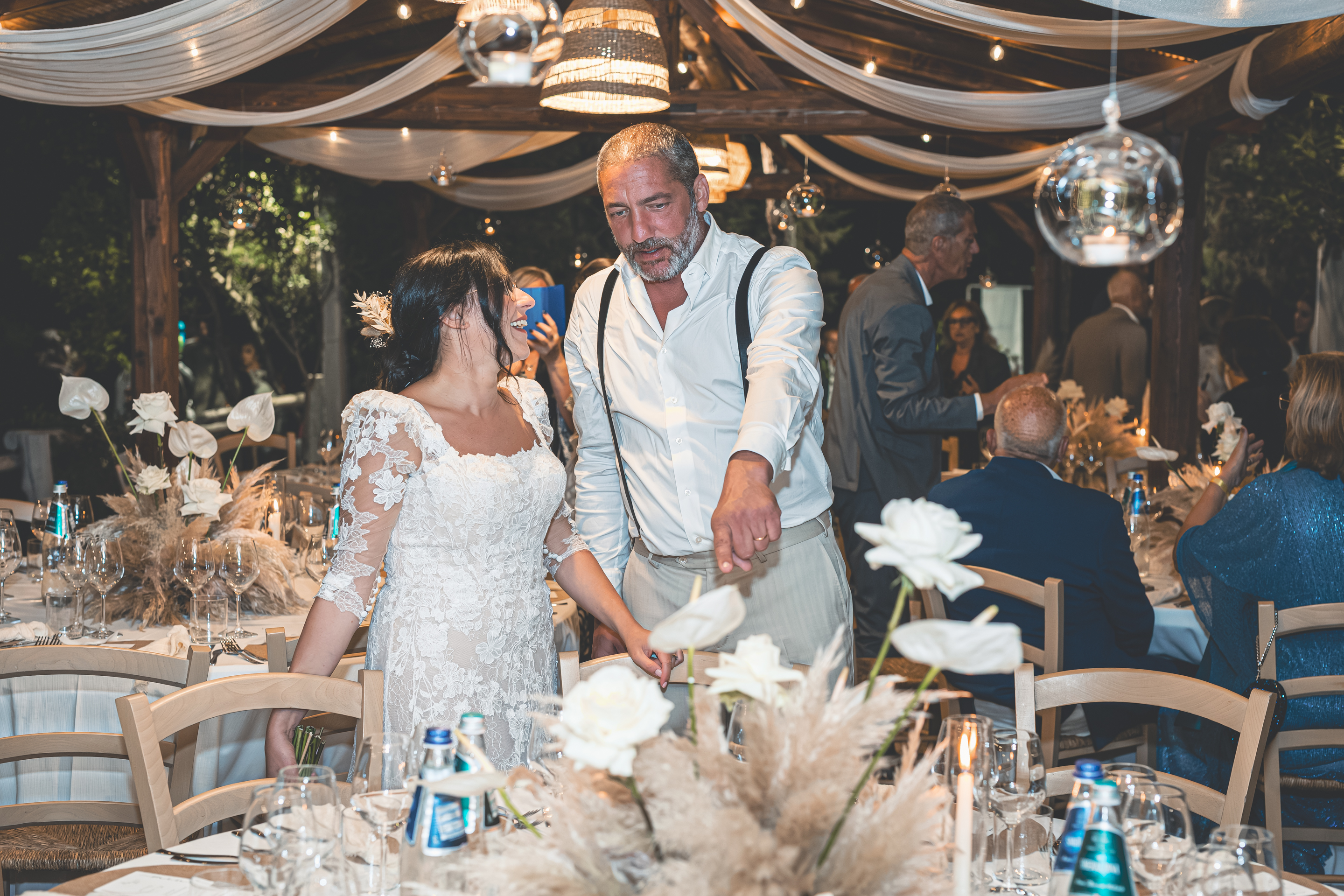 Dopo gli abbracci e i sorrisi, inizia l’aperitivo. Qualche scatto di gruppo e poi, con Rachele e Francesco, ci spostiamo lungo la spiaggia per approfittare della luce dorata del tramonto, regalando spazio a momenti di complicità autentica. Per la cena ci spostiamo allo Shango Restaurant: cibo e vino eccellenti fanno da cornice a una serata che prosegue tra brindisi, risate e tanto divertimento. È il momento dei dolci, firmati Antiche Tradizioni Dorgali e Pasticceria Ammentos. Per il taglio torta gli Sposi scelgono qualcosa di davvero particolare: uno show cooking, durante il quale decorano personalmente la torta con la frutta prima di servirla agli invitati. La festa può finalmente iniziare con la musica di The Angius DJ, e prosegue fino a notte inoltrata. Per me è tempo di rientrare: mi aspetta un volo di prima mattina e, il giorno dopo, un altro matrimonio e una nuova storia da raccontare.