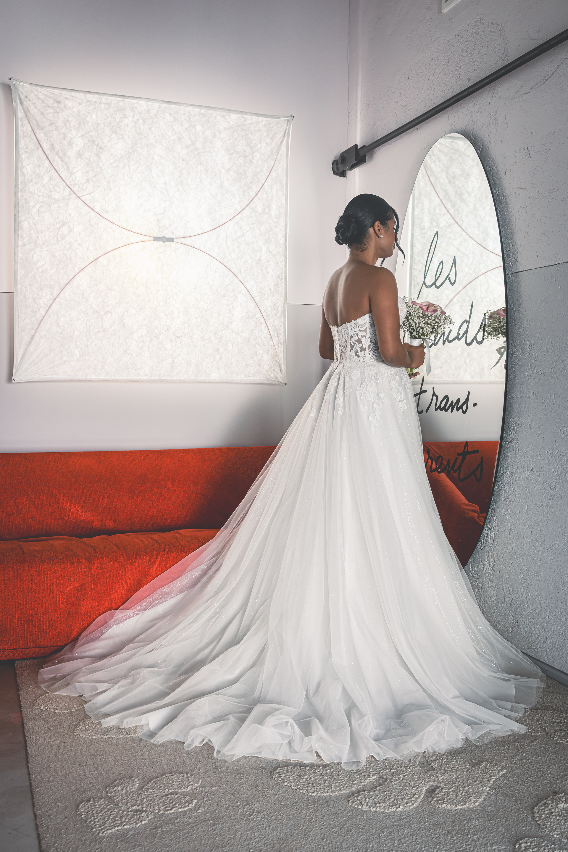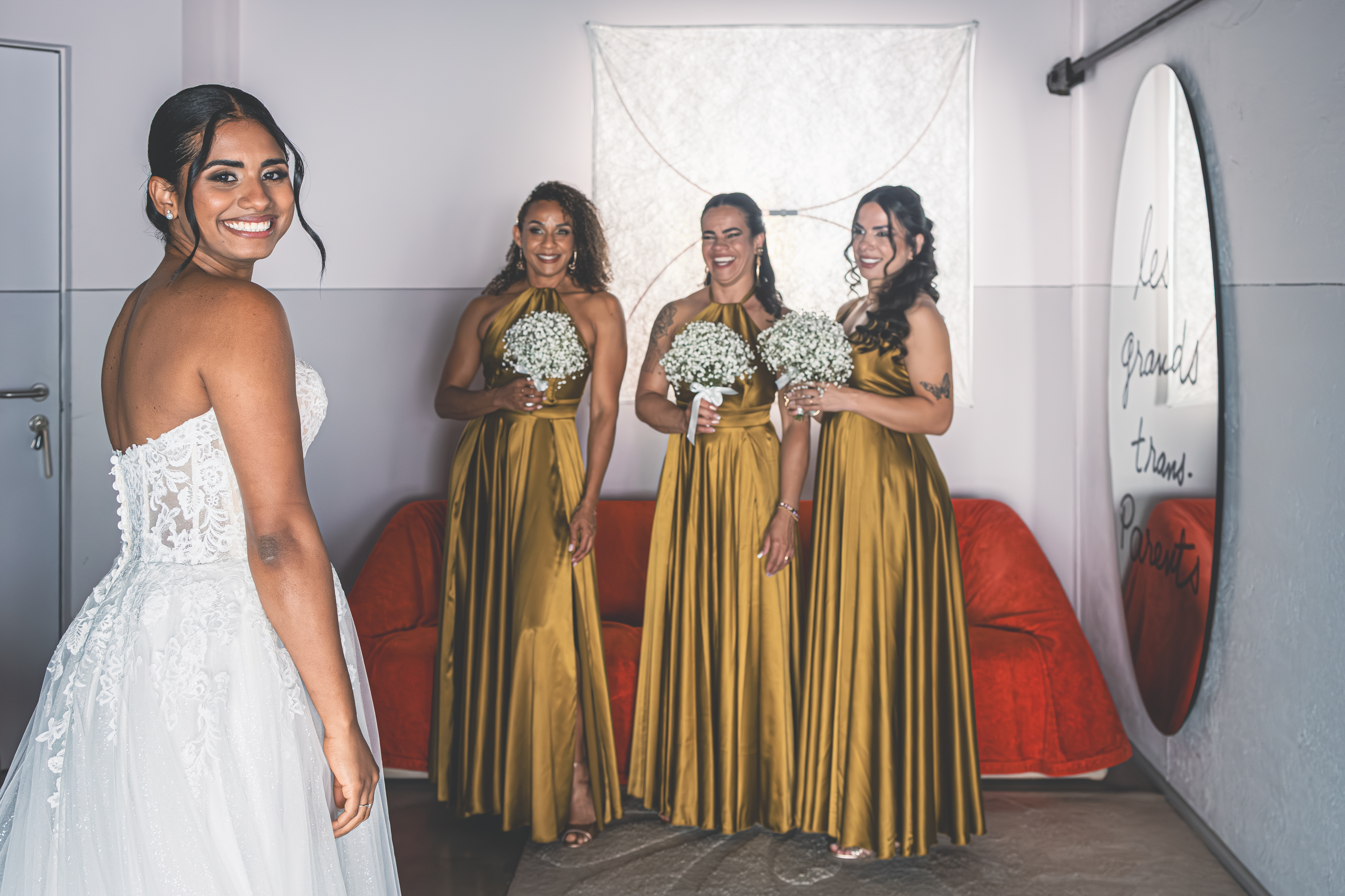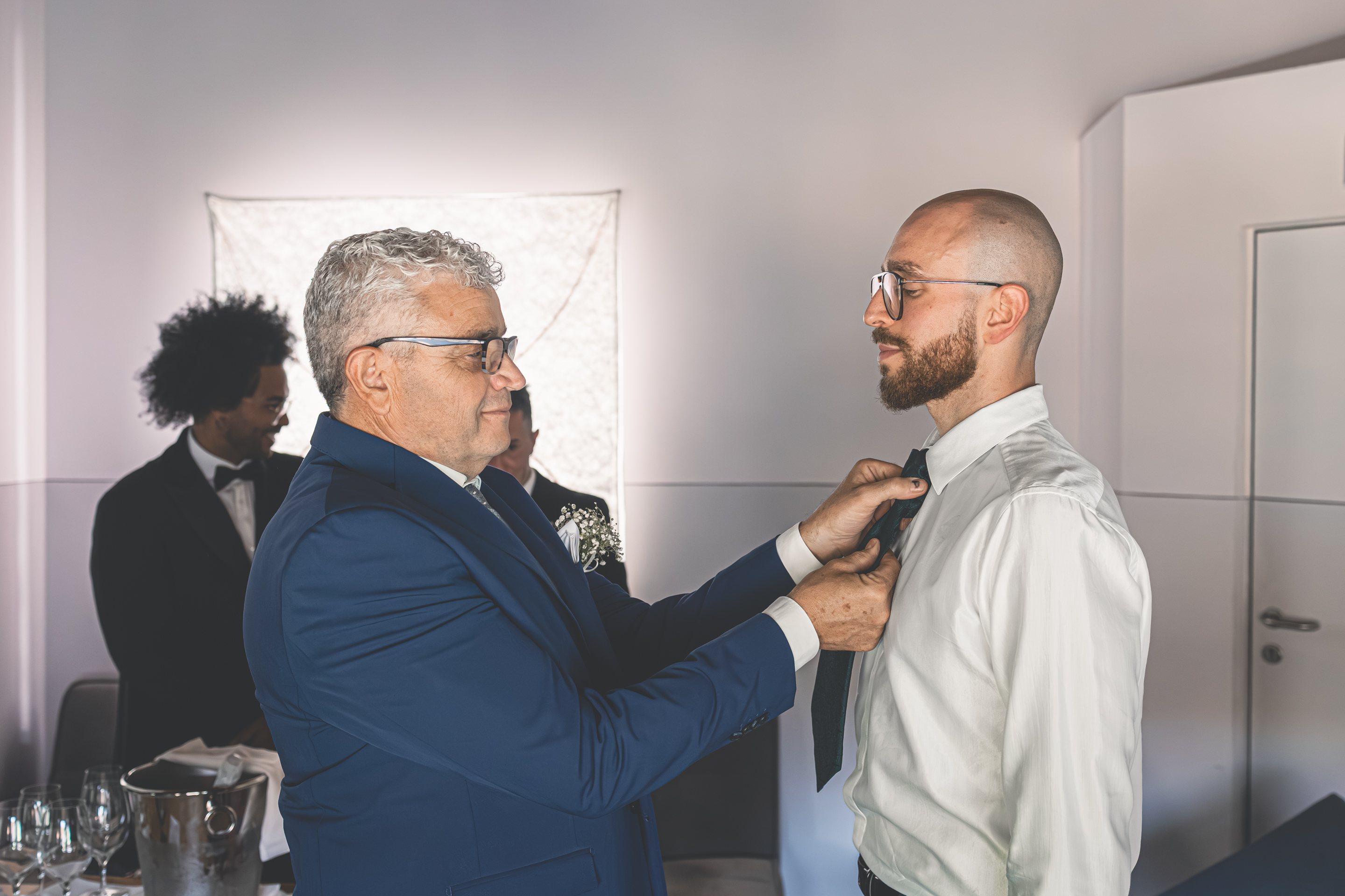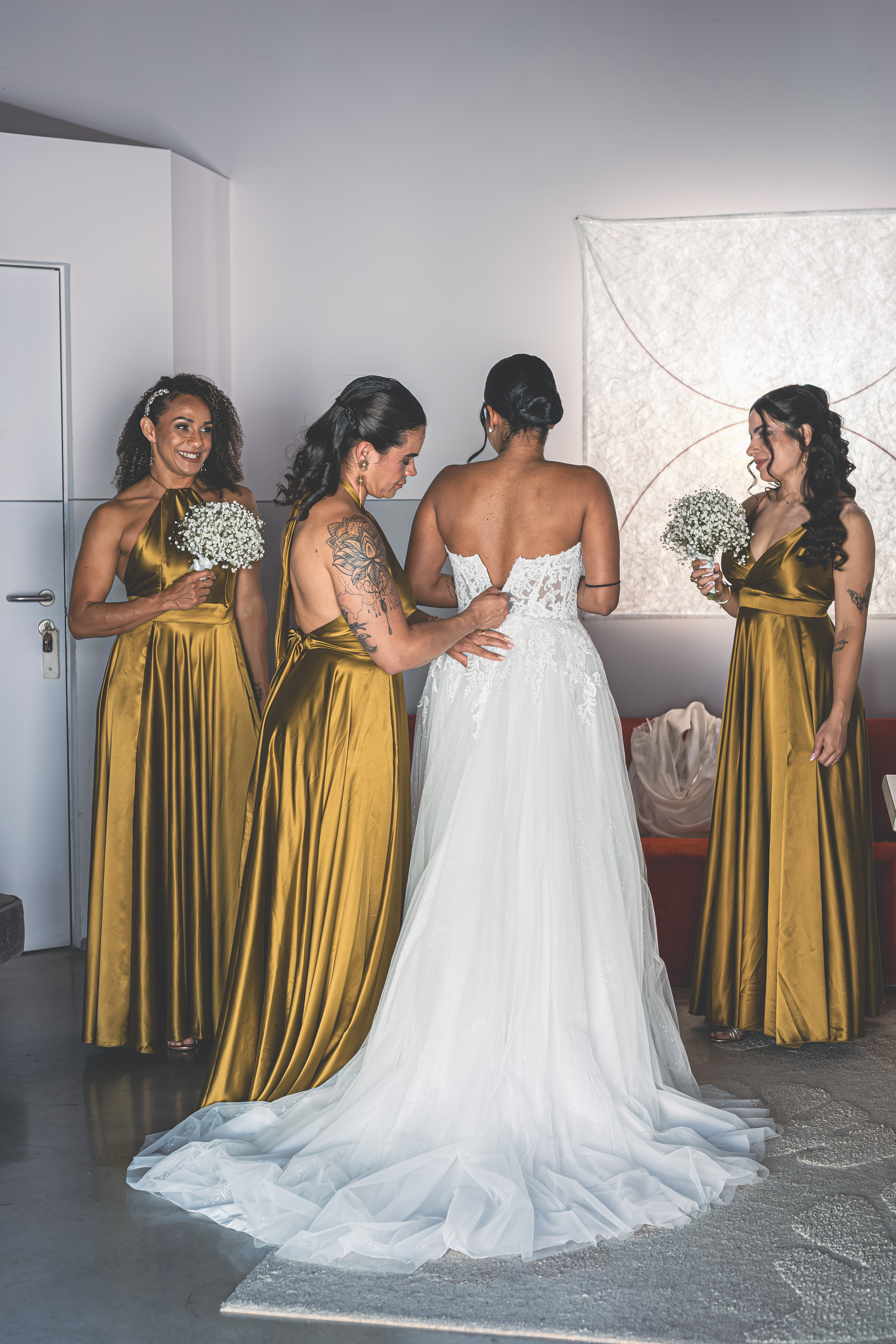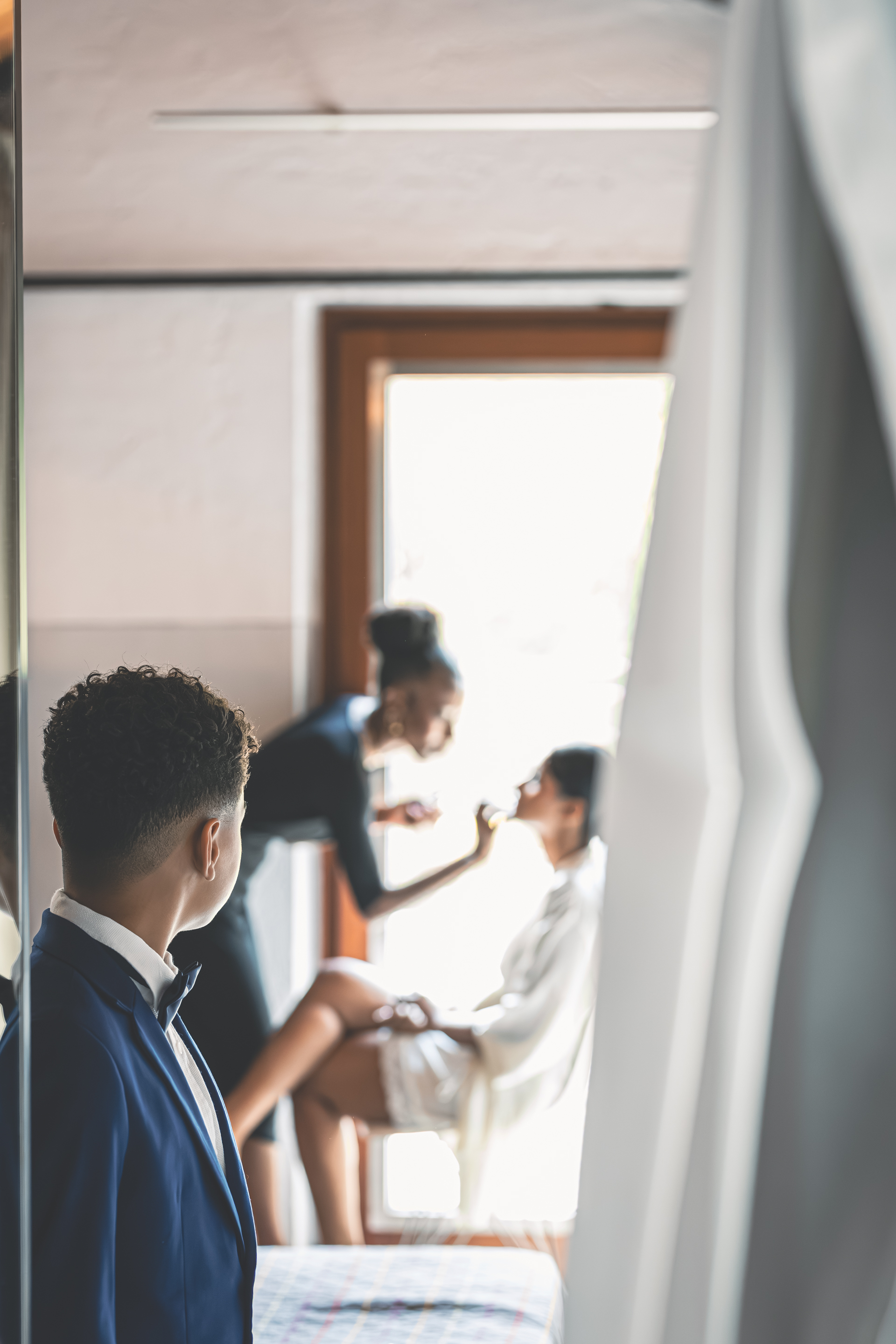 Il racconto comincia con Luca, che si prepara affiancato dalla sua famiglia, dal cugino testimone e da due presenze speciali: Bradley, figlio di Sharina, e il piccolo Marco, il loro bambino, che con il suo sorriso ha rapito gli sguardi di tutti. L’abito, firmato Sposi Domani, aggiunge eleganza a un momento pieno di dolcezza. Intanto, dall’altra parte del corridoio, Sharina si circonda delle sue tre damigelle. I preparativi scorrono tra sguardi complici, mani che aiutano, cuori che battono forte. Cavazzini Acconciature e Profumeria Douglas si prendono cura di lei, mentre indossa il suo primo abito – raffinato, luminoso – scelto da Sposi Domani.