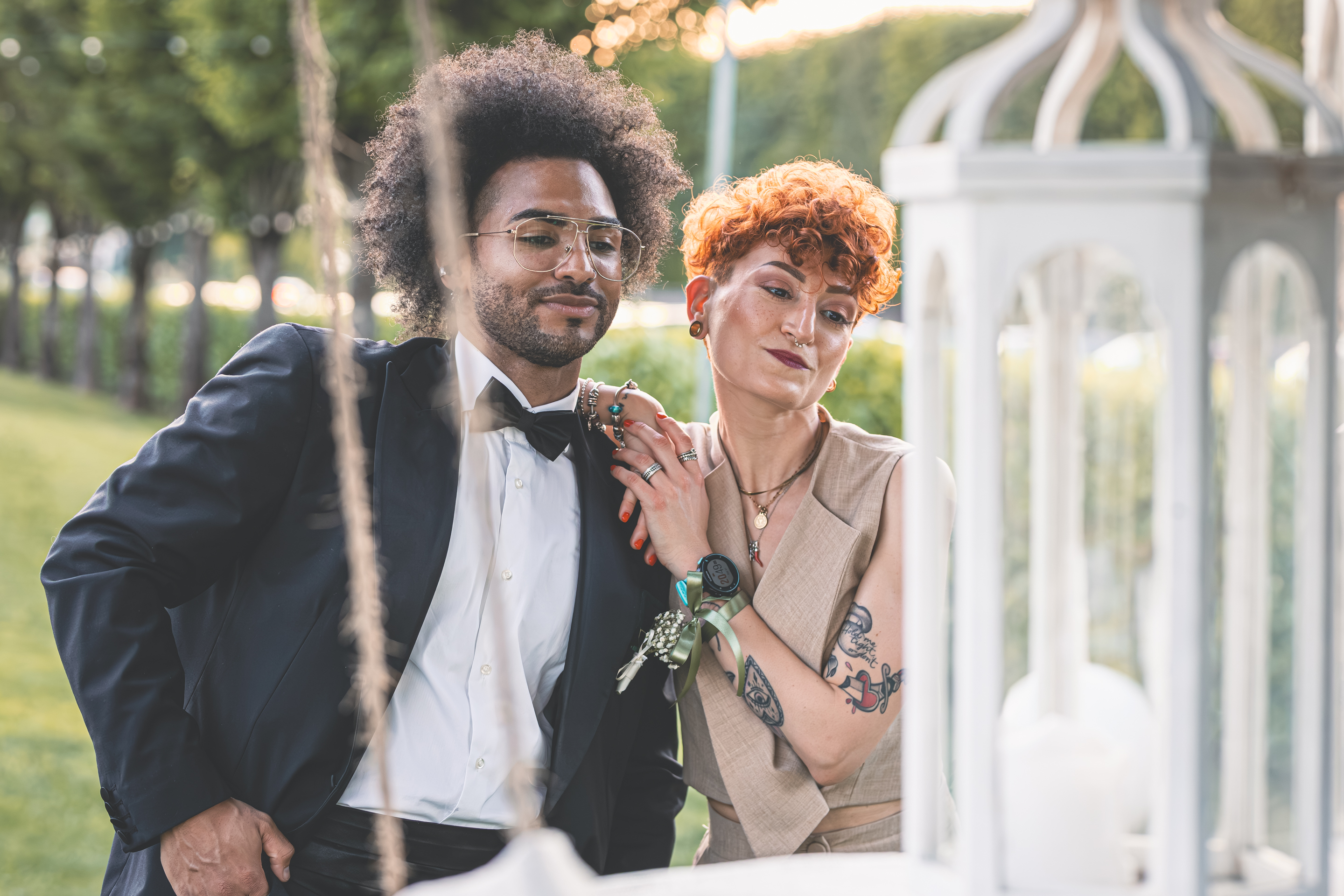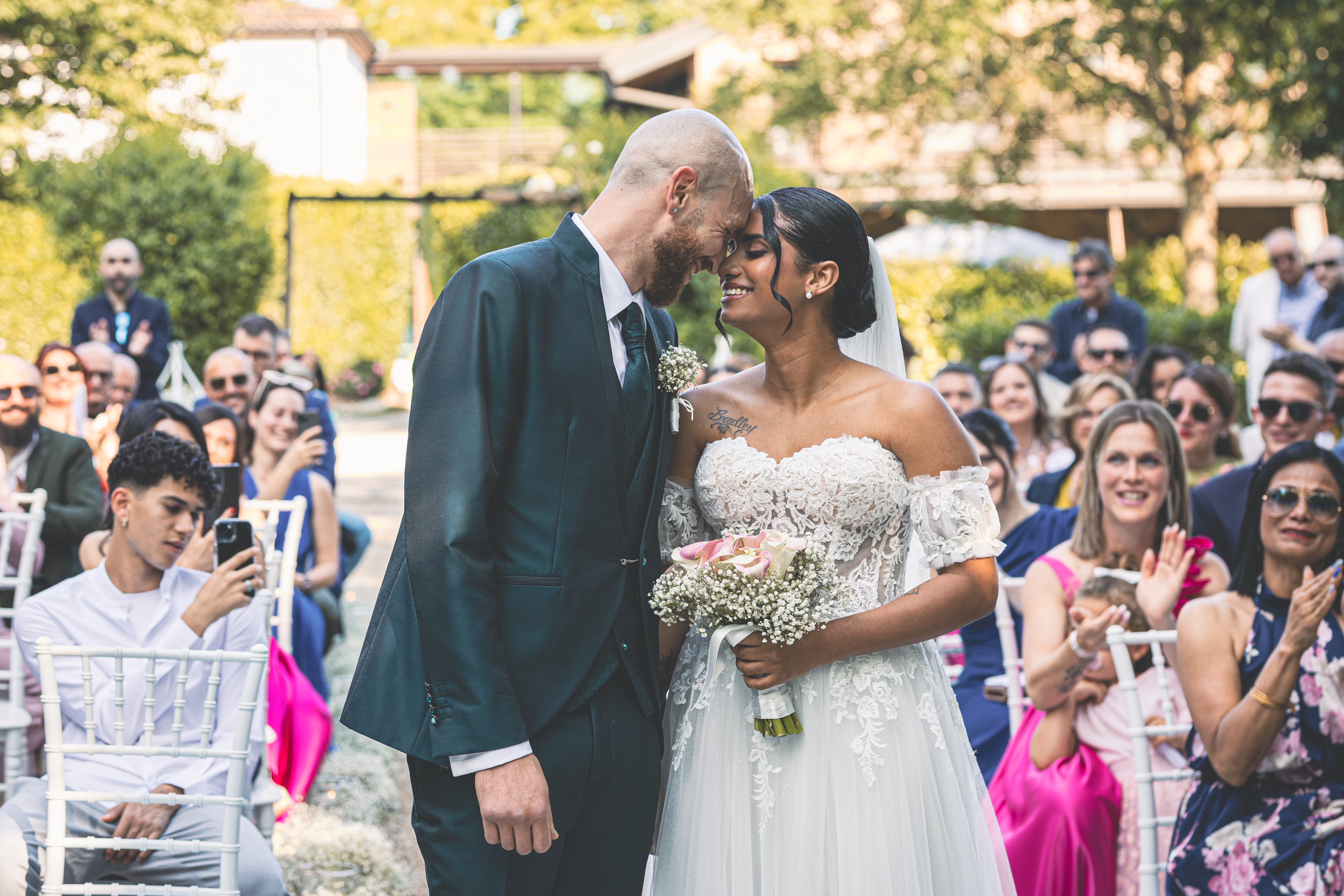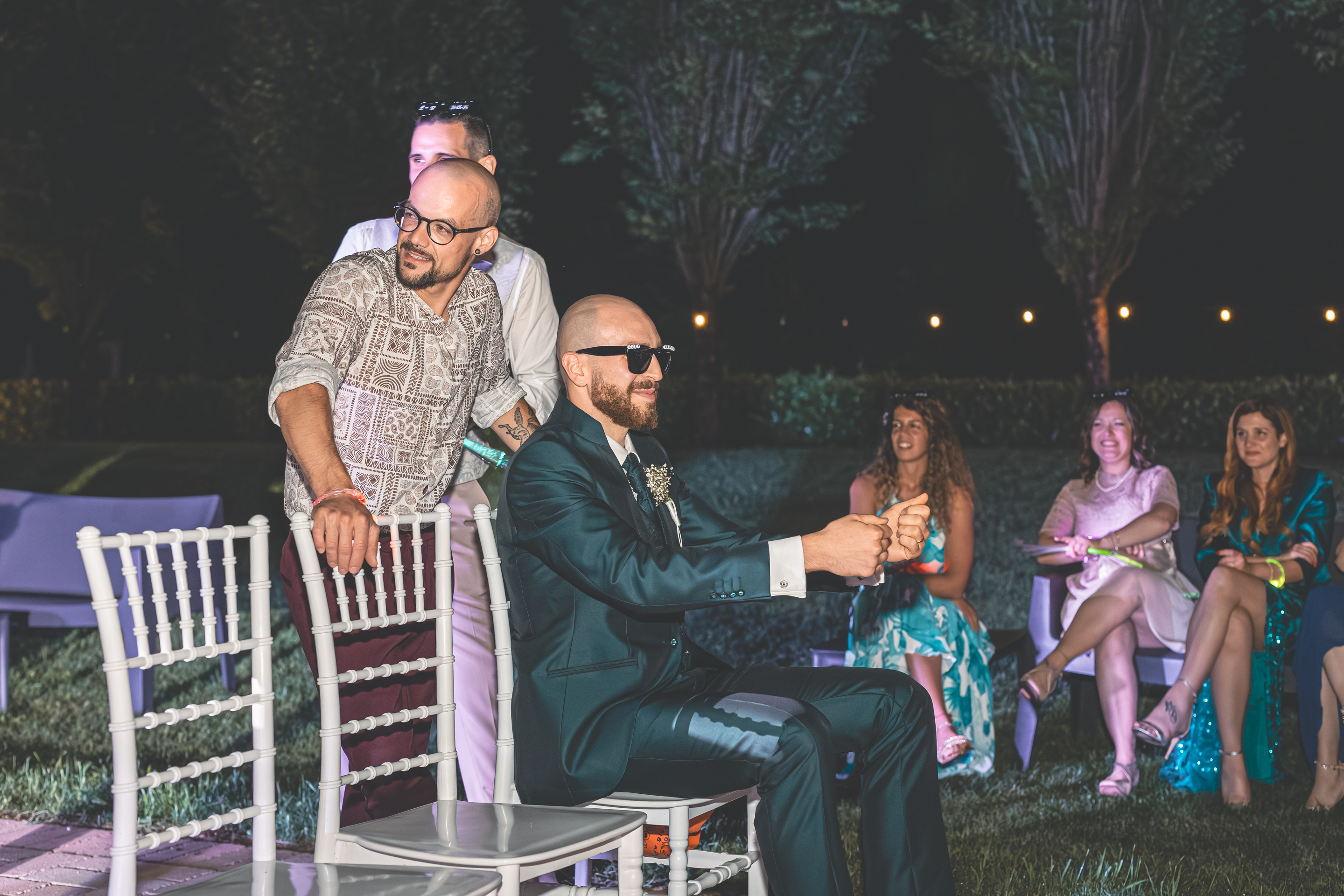 Il rito nel giardino è un angolo di poesia: fiori curati da Rossella di Papaveri e Papere, il sole che accarezza gli sposi, lo scambio delle promesse che commuove e unisce. Le fedi di Alemar Gioielli brillano come simboli di un amore profondo, vissuto e condiviso. Poi esplode la festa: l’aperitivo è un vortice di musica, con il sax e il ritmo di Thomas De Gobbi, l’allegria dei bambini allietati da Gli Amici del Sorriso, e il tocco ironico de Le Caricature del Buffo, che strappano sorrisi sinceri.