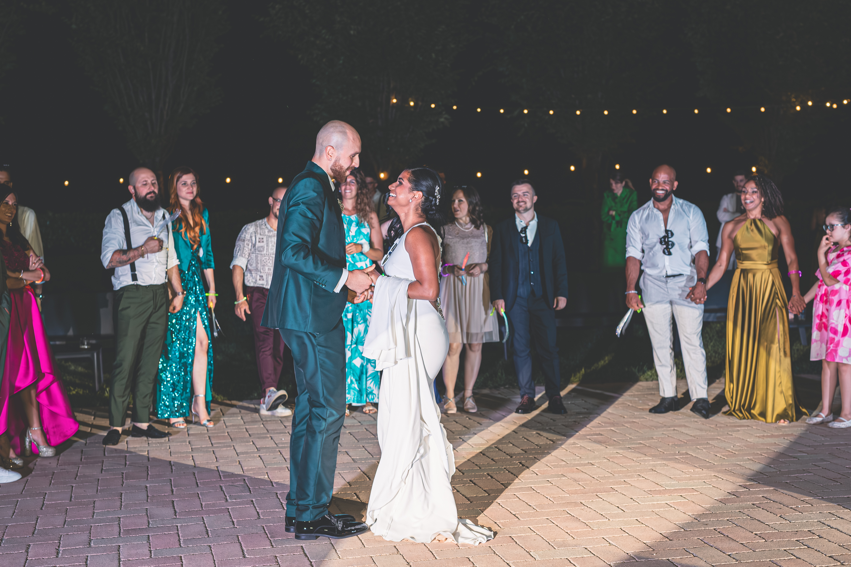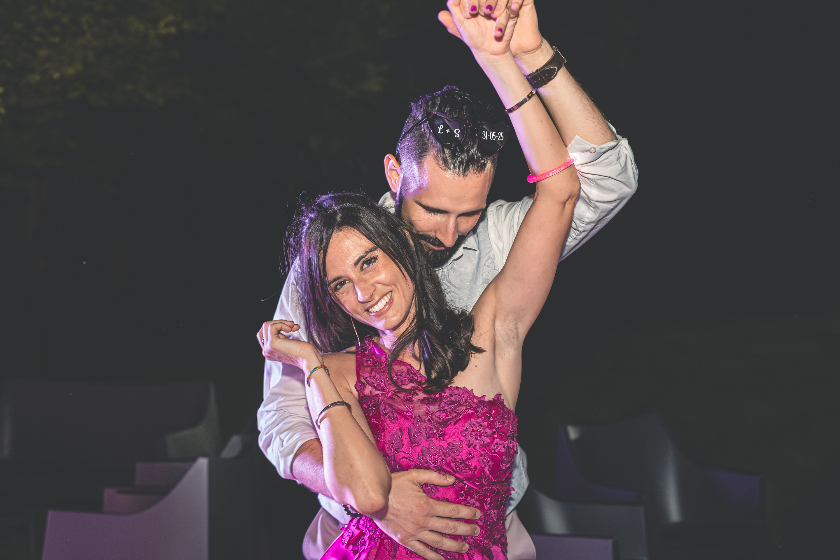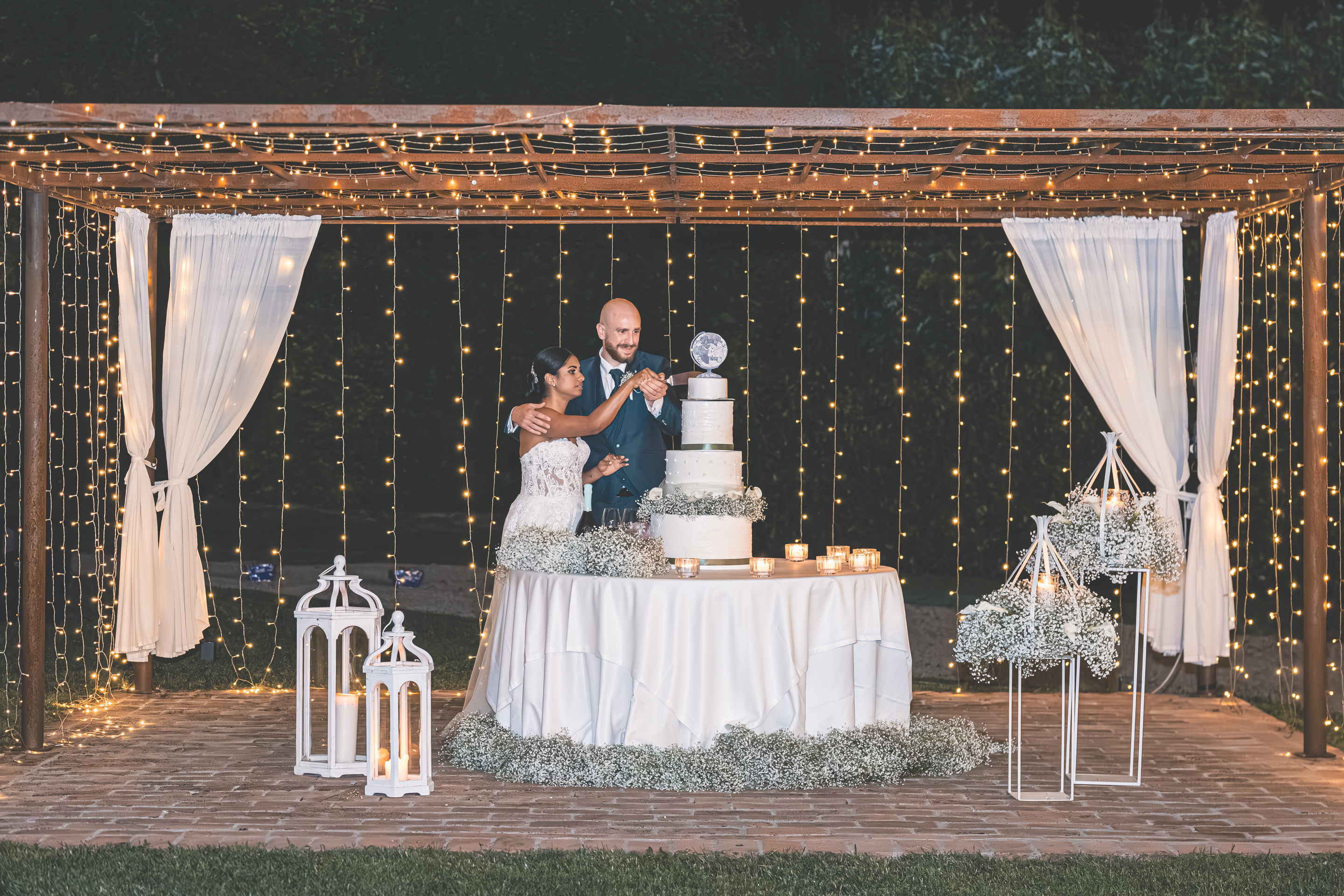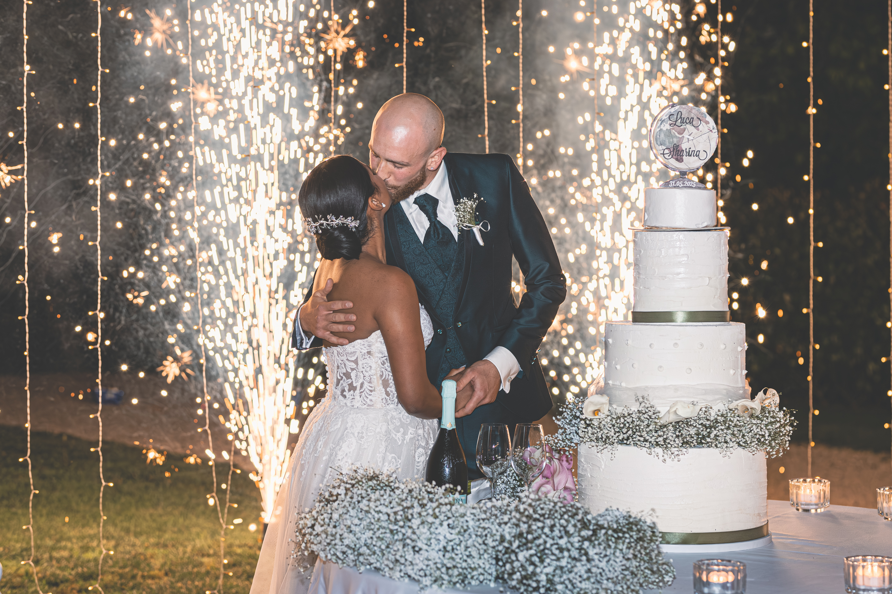 La cena si consuma tra brindisi e parole dolci. E quando scende la sera, il taglio della torta arriva tra fontane luminose e fuochi d’artificio curati da Signa Eventi, sotto un cielo che sembra festeggiare insieme a loro. Prima dei balli finali Sharina cambia abito, indossando un nuovo sogno firmato Come in una Favola. E a questo punto la festa può scatenarsi insieme ai tanti amici presenti, inframezzata dalla consegna – tra abbracci e baci – delle bomboniere di Giuliana Pinzi, piccoli sigilli di gratitudine.